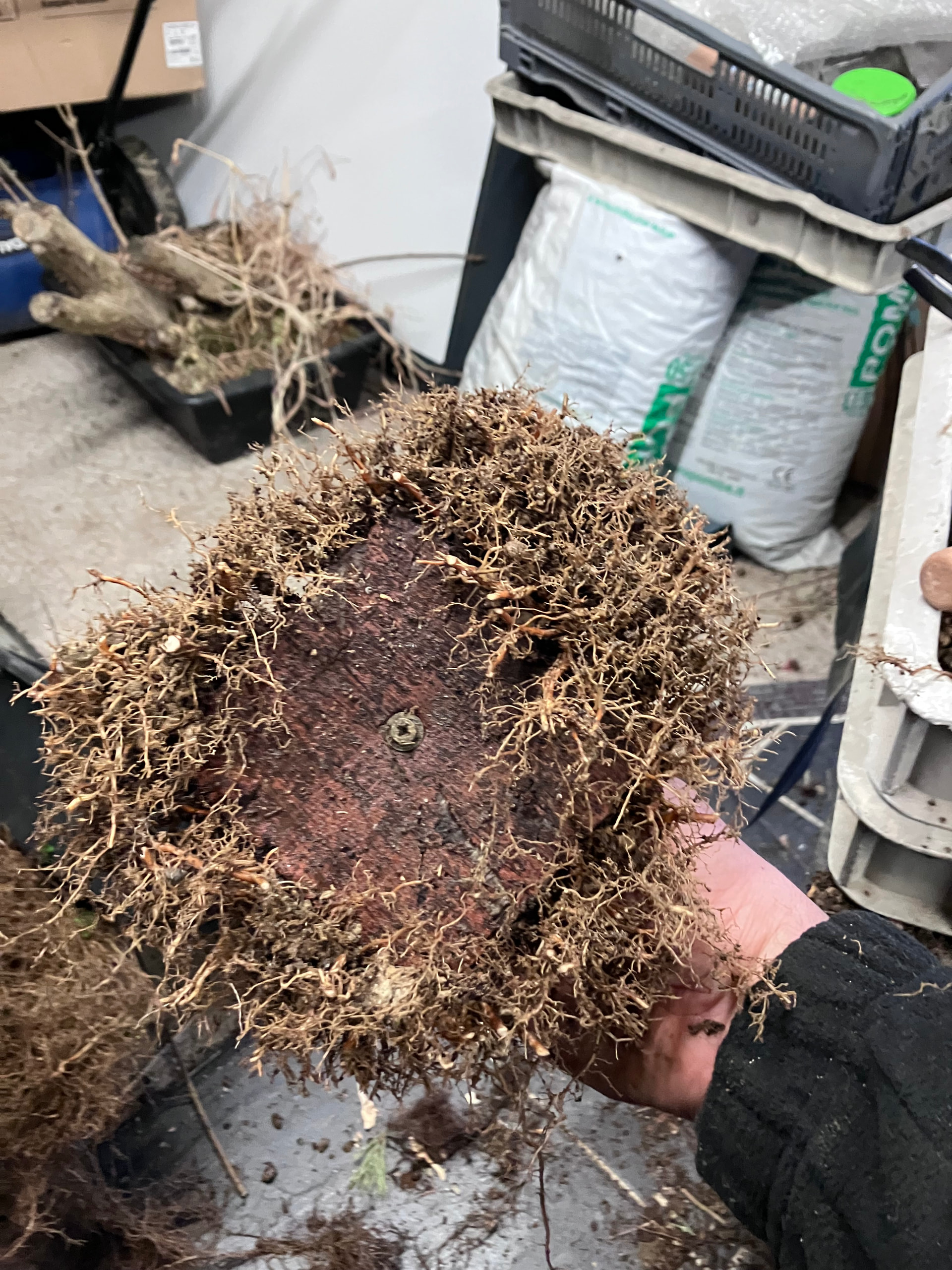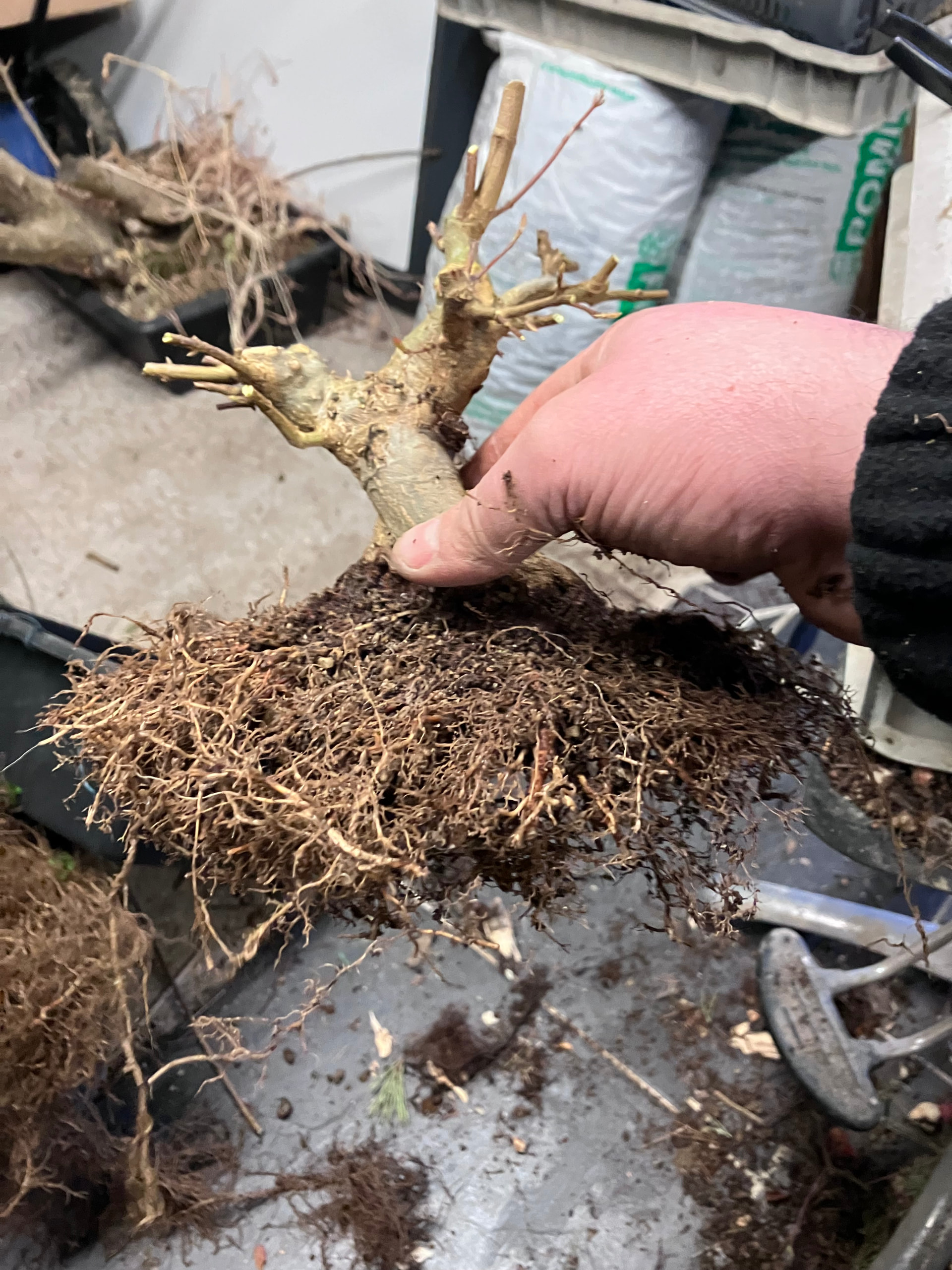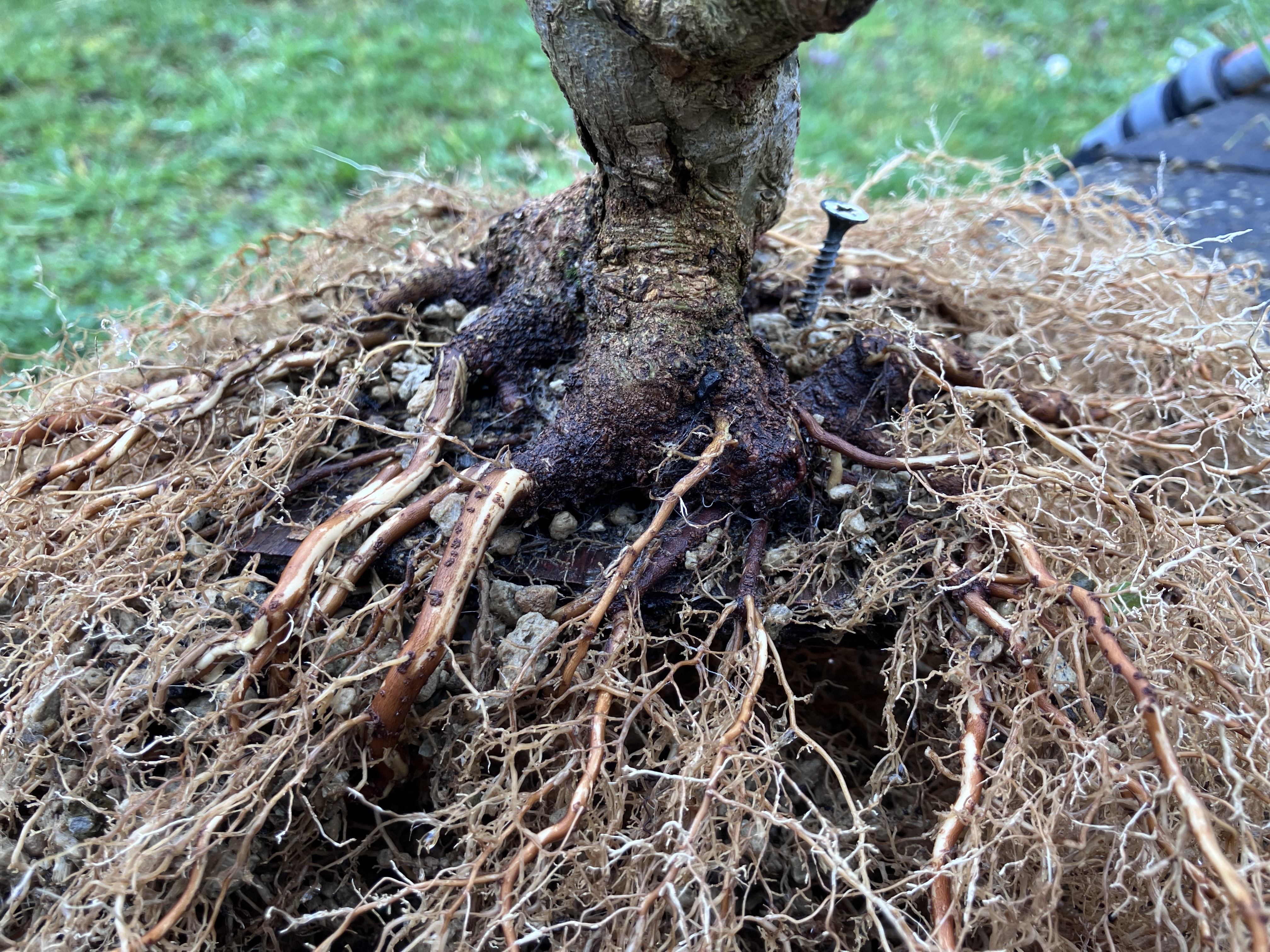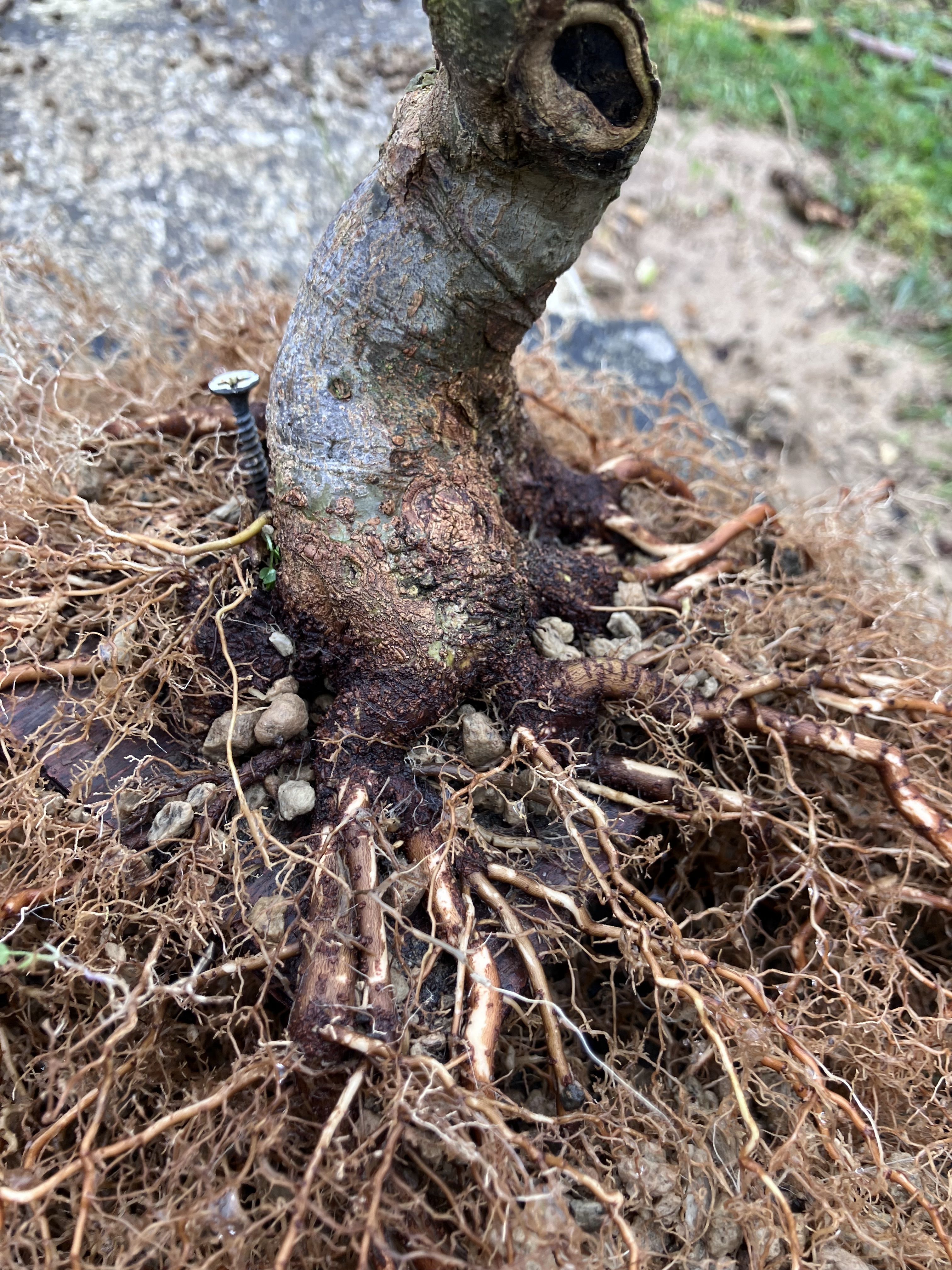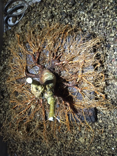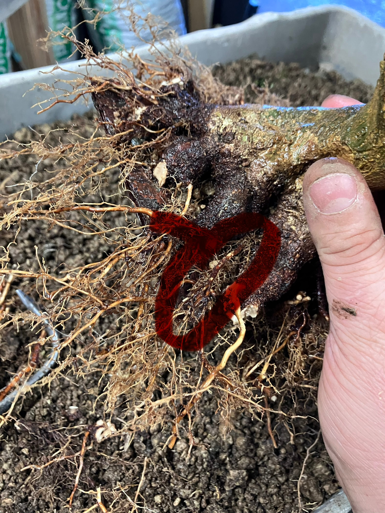 Et puis rincage des racines et tailles réfléchies pour favoriser les petites racines et faire élargir le nebari… tout en favorisant les zones un peu « faible » de l’enracinement (zone et racine entourées) en laissant certaines racines tirer pendant une ou deux saisons. Cela permet d’élargir plus cette zone, et ainsi qu’elle rattrape l’évasement du reste du nebari: