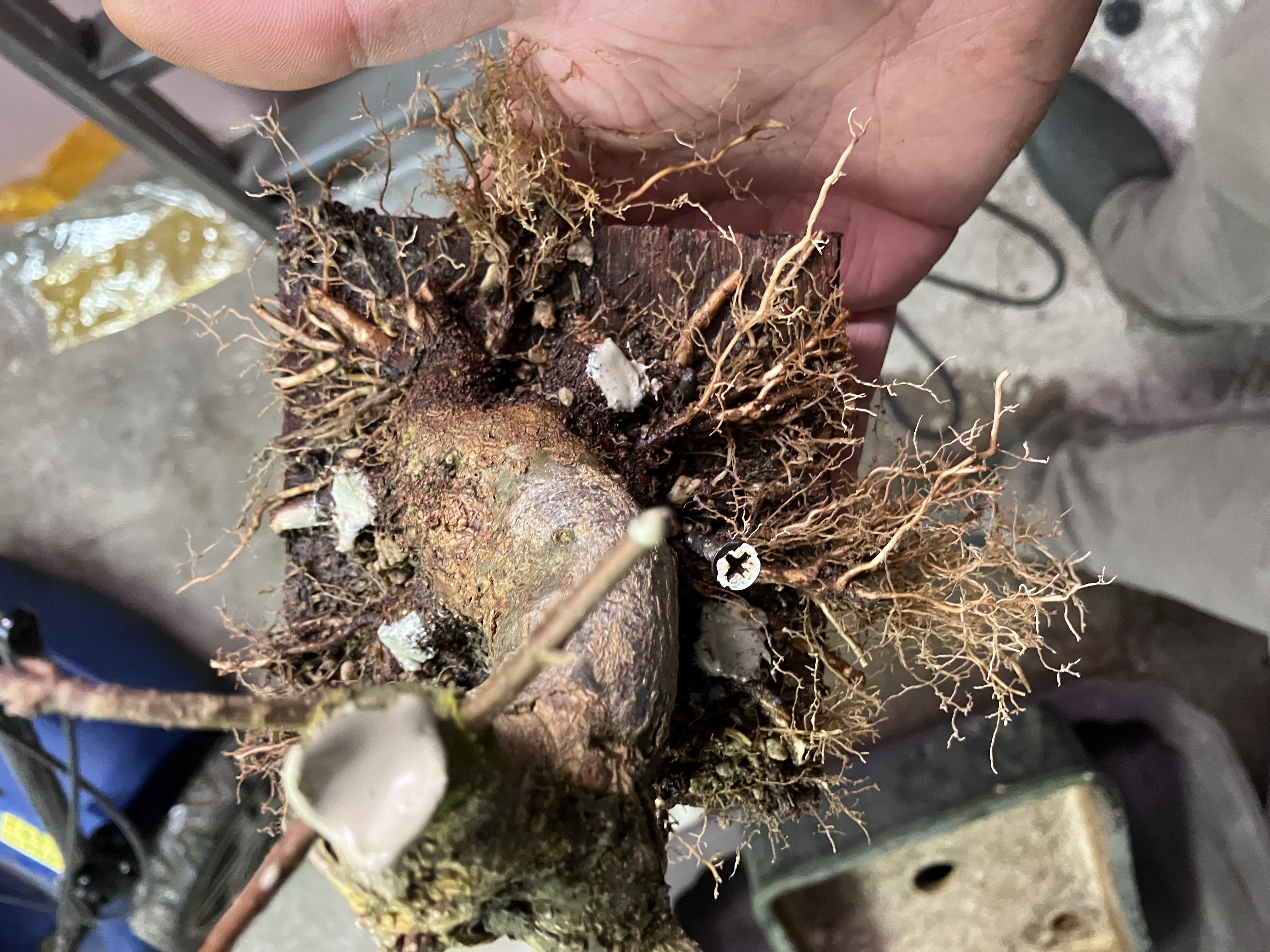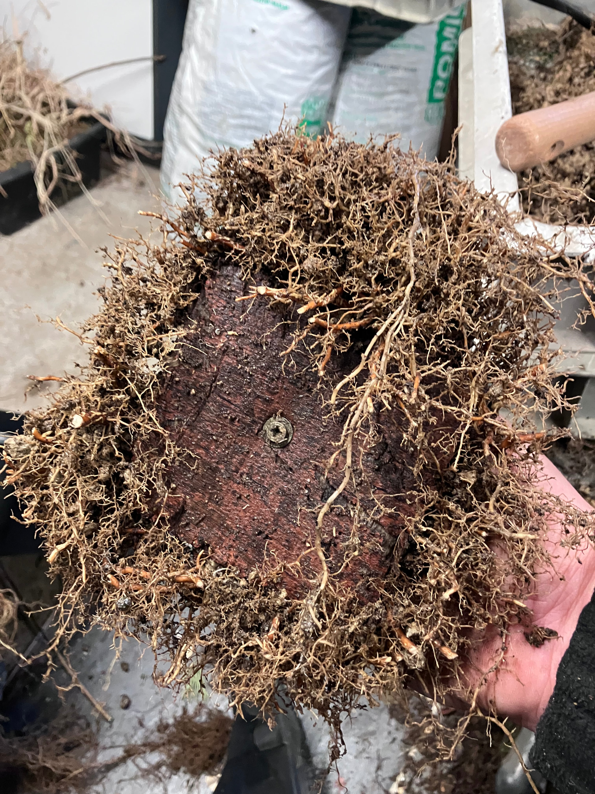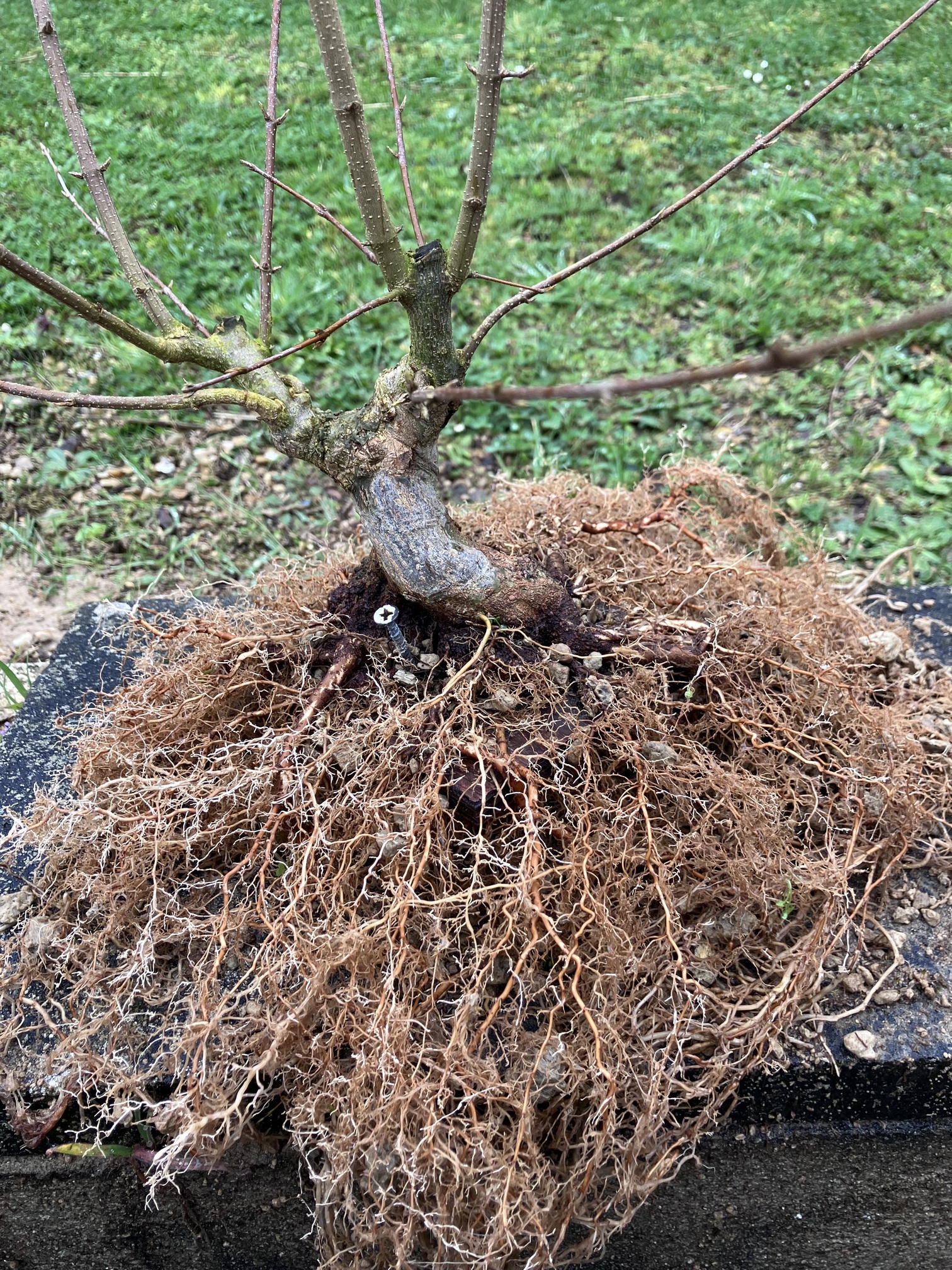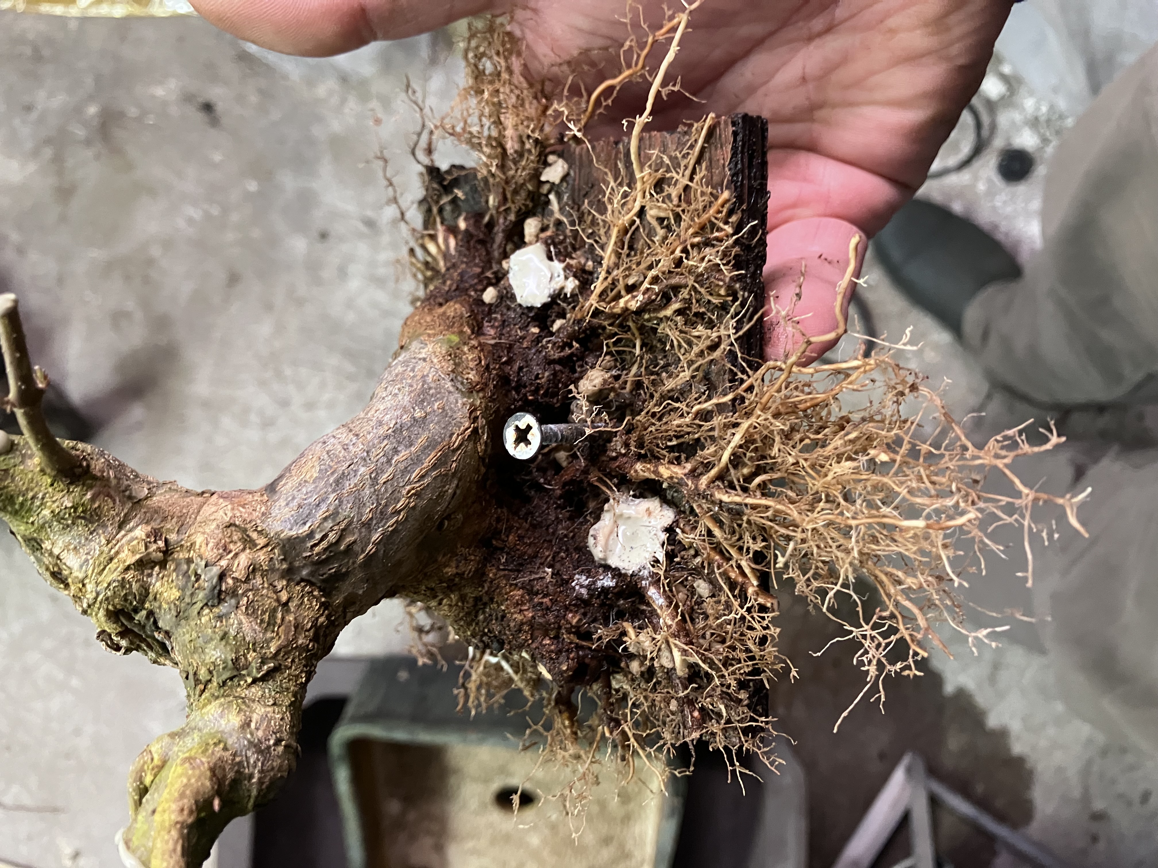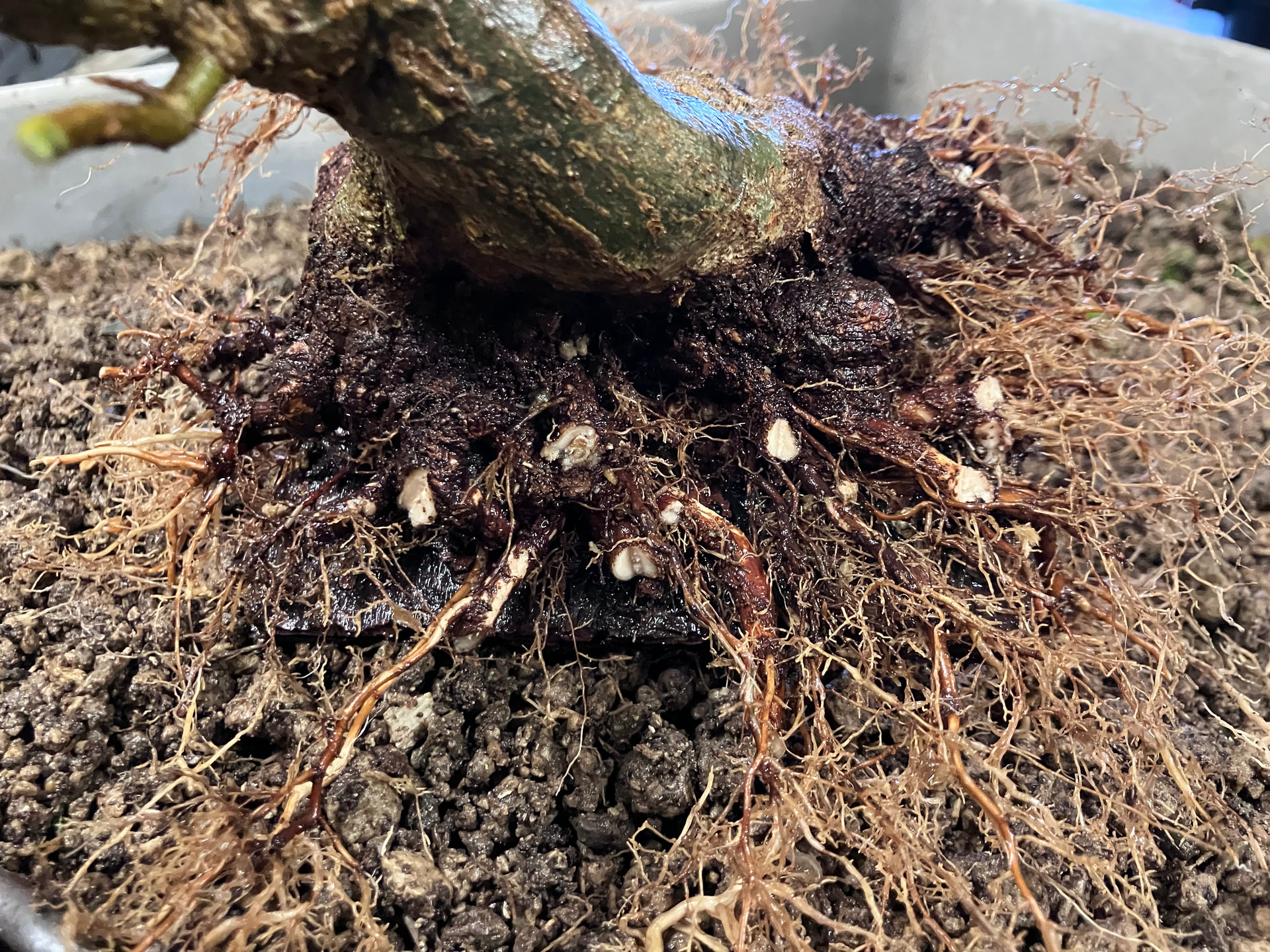 Et puis rincage des racines et tailles réfléchies pour favoriser les petites racines et faire élargir le nebari… tout en favorisant les zones un peu « faible » de l’enracinement (zone et racine entourées) en laissant certaines racines tirer pendant une ou deux saisons. Cela permet d’élargir plus cette zone, et ainsi qu’elle rattrape l’évasement du reste du nebari:
