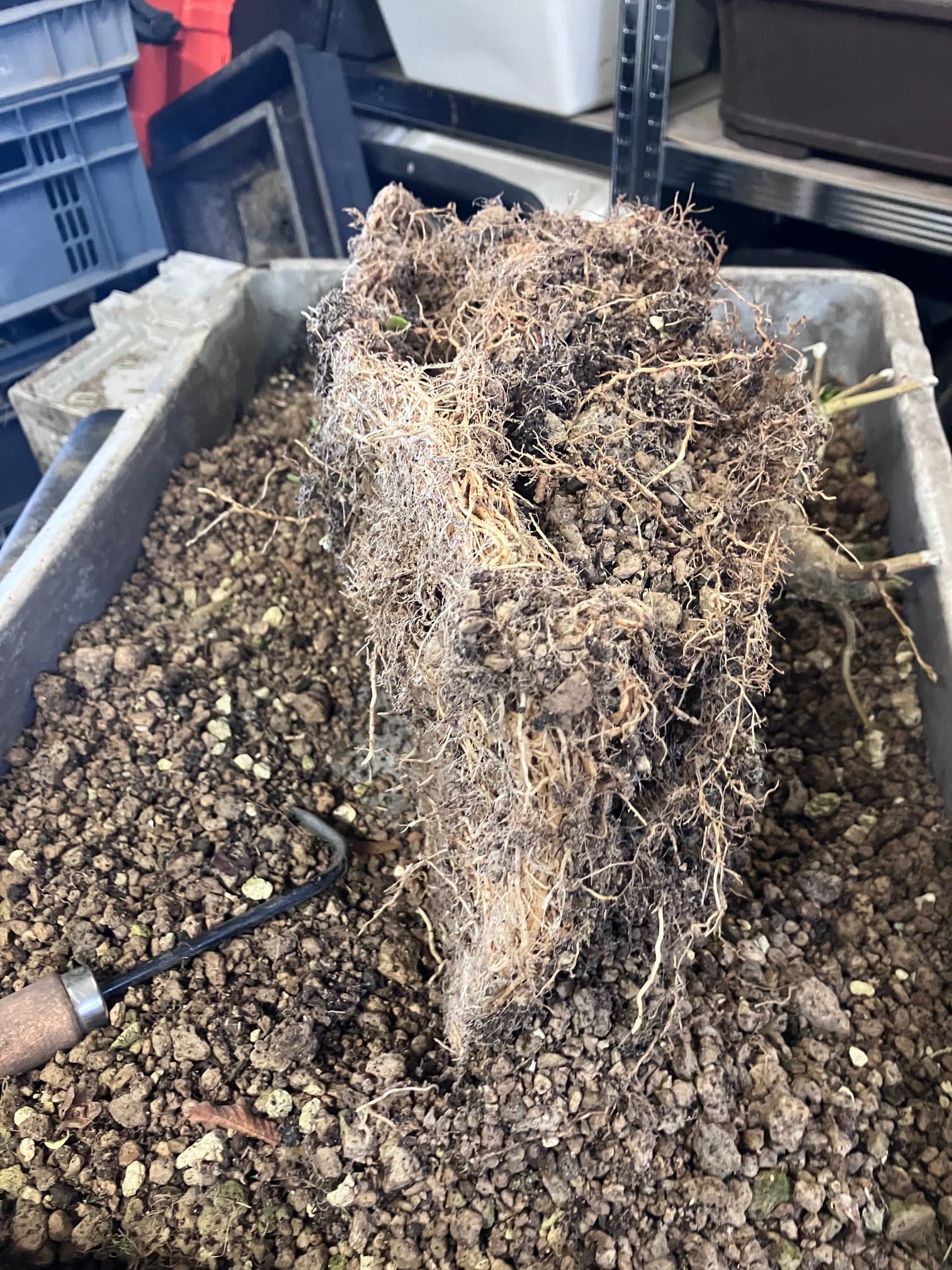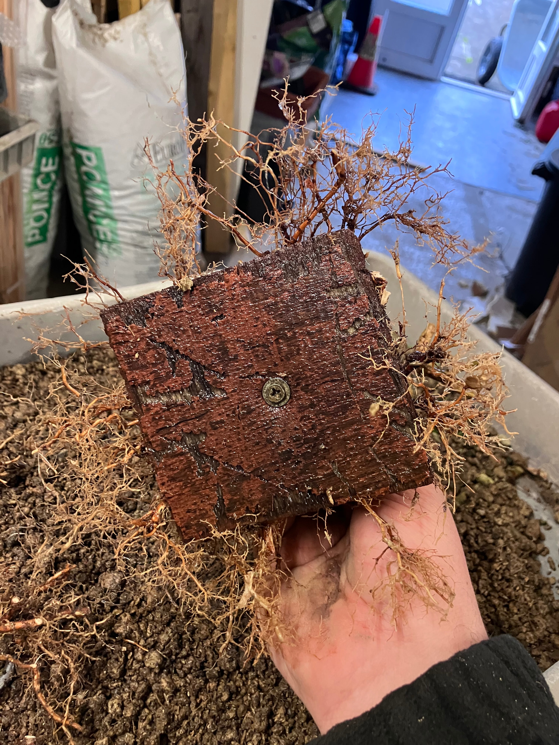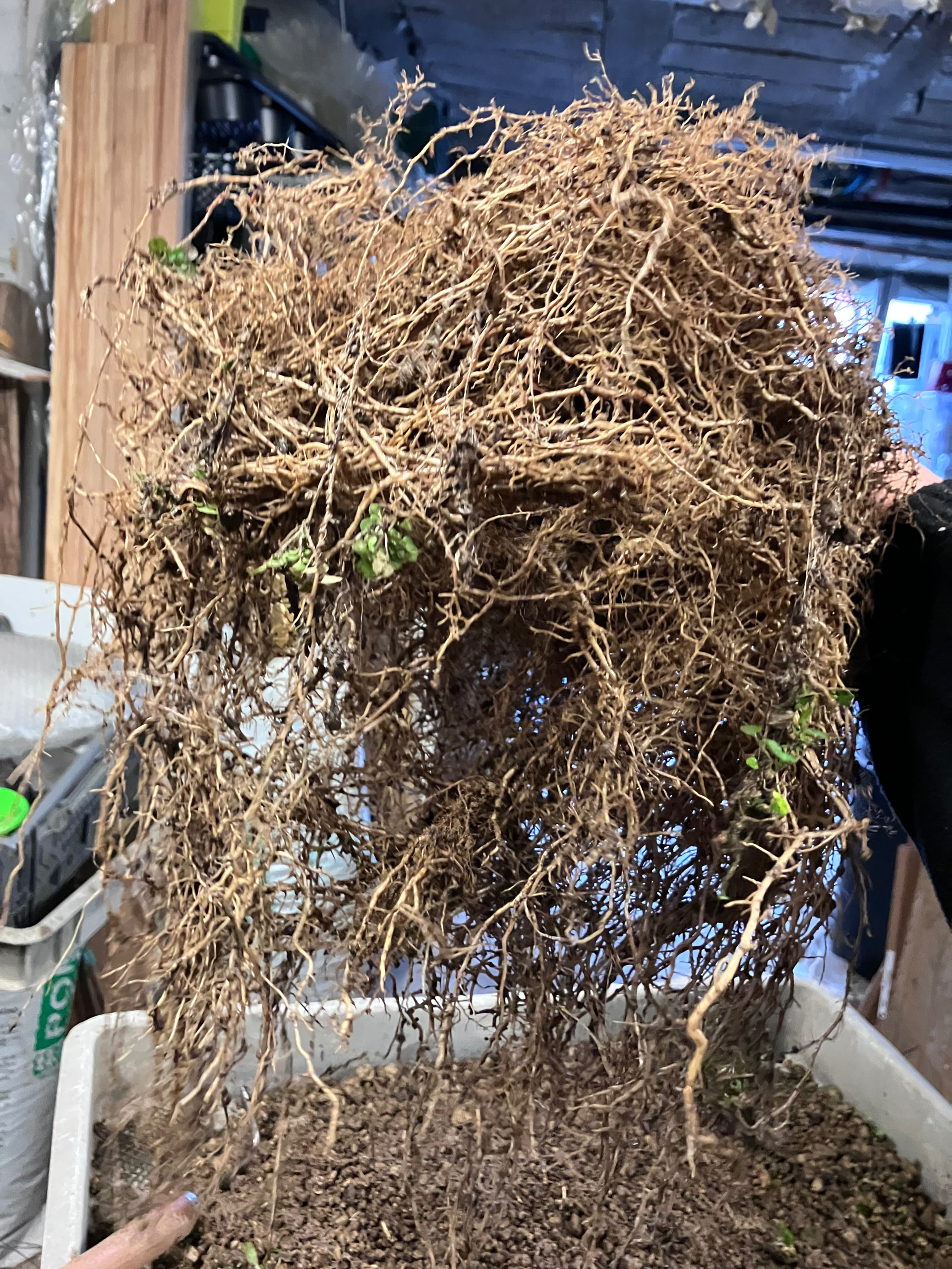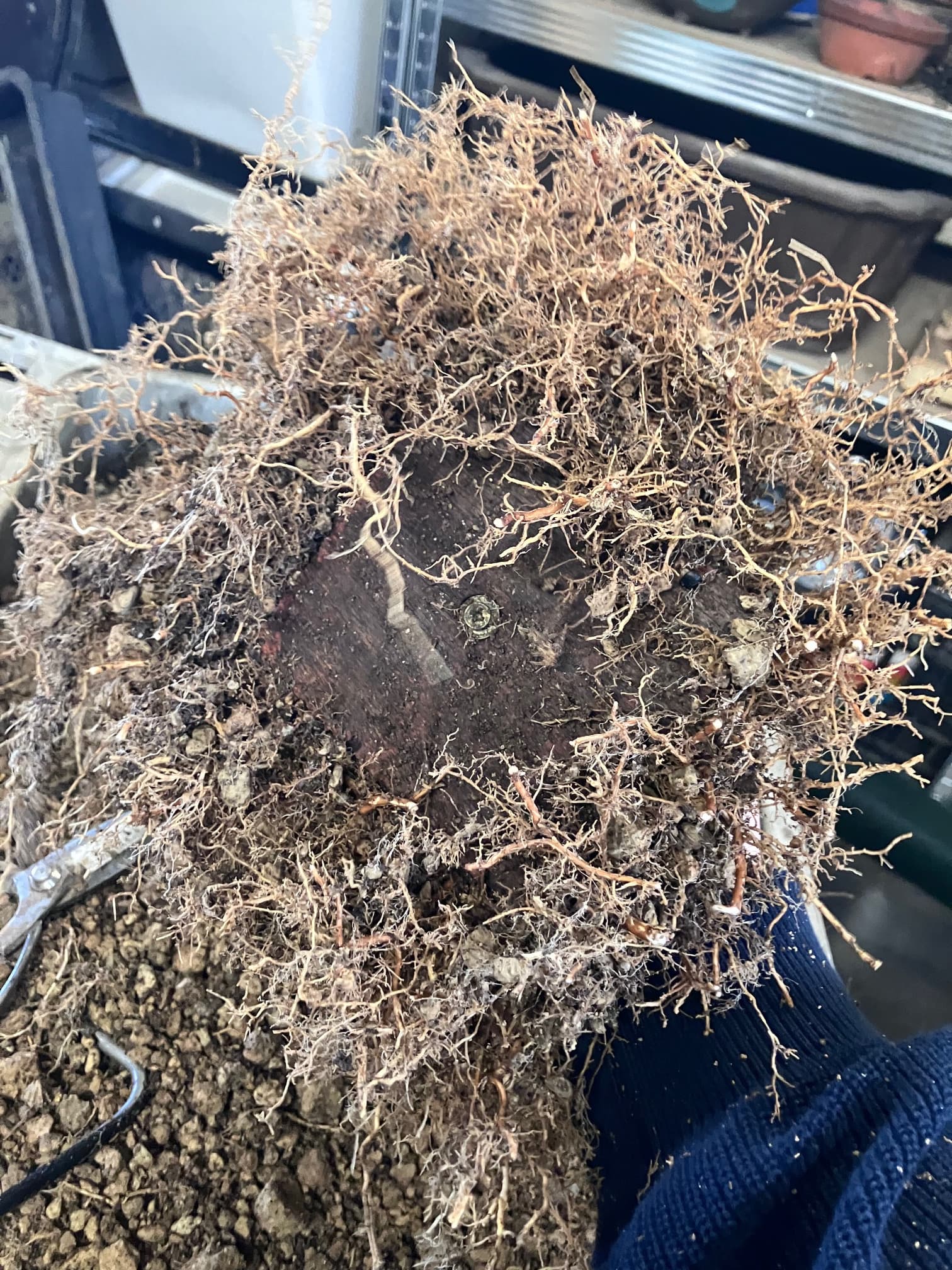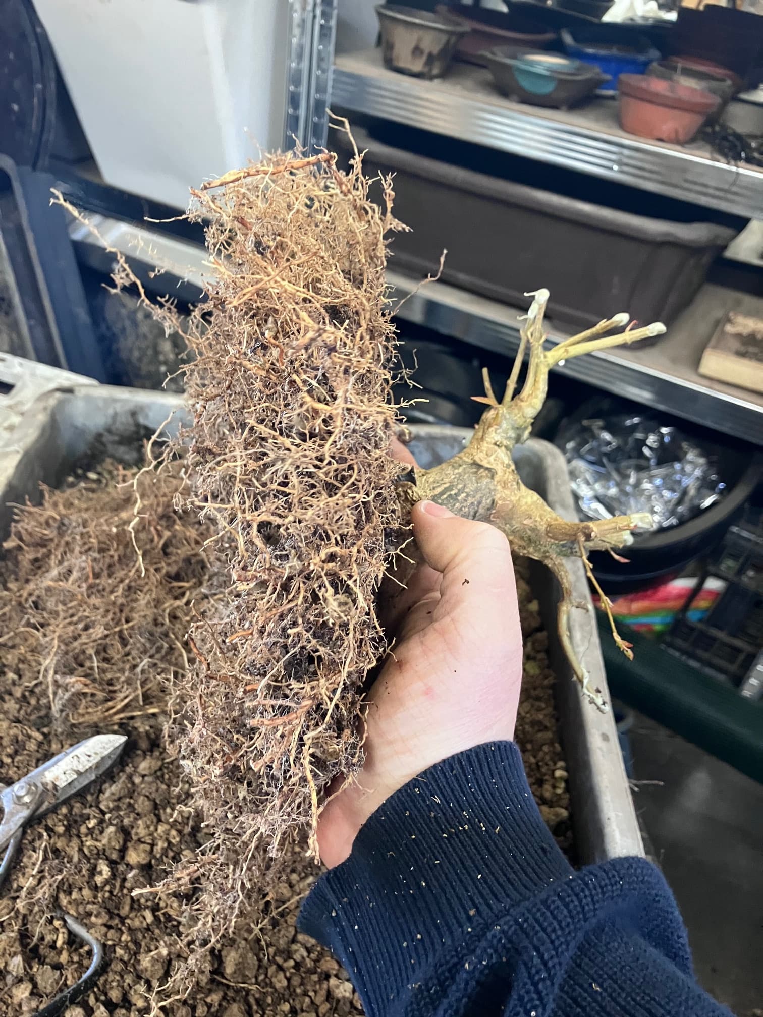 Et puis rincage des racines et tailles réfléchies pour favoriser les petites racines et faire élargir le nebari… tout en favorisant les zones un peu « faible » de l’enracinement (zone et racine entourées) en laissant certaines racines tirer pendant une ou deux saisons. Cela permet d’élargir plus cette zone, et ainsi qu’elle rattrape l’évasement du reste du nebari:
