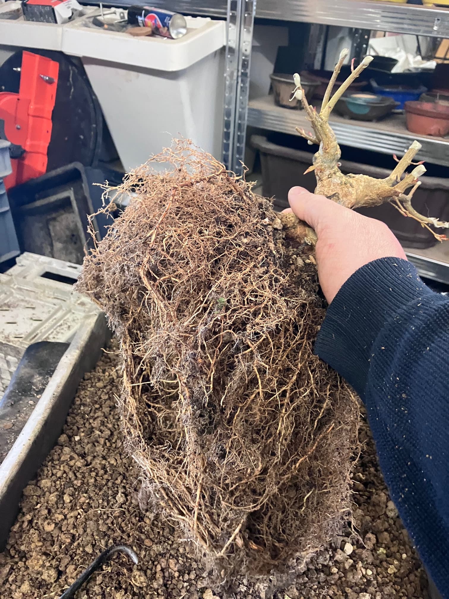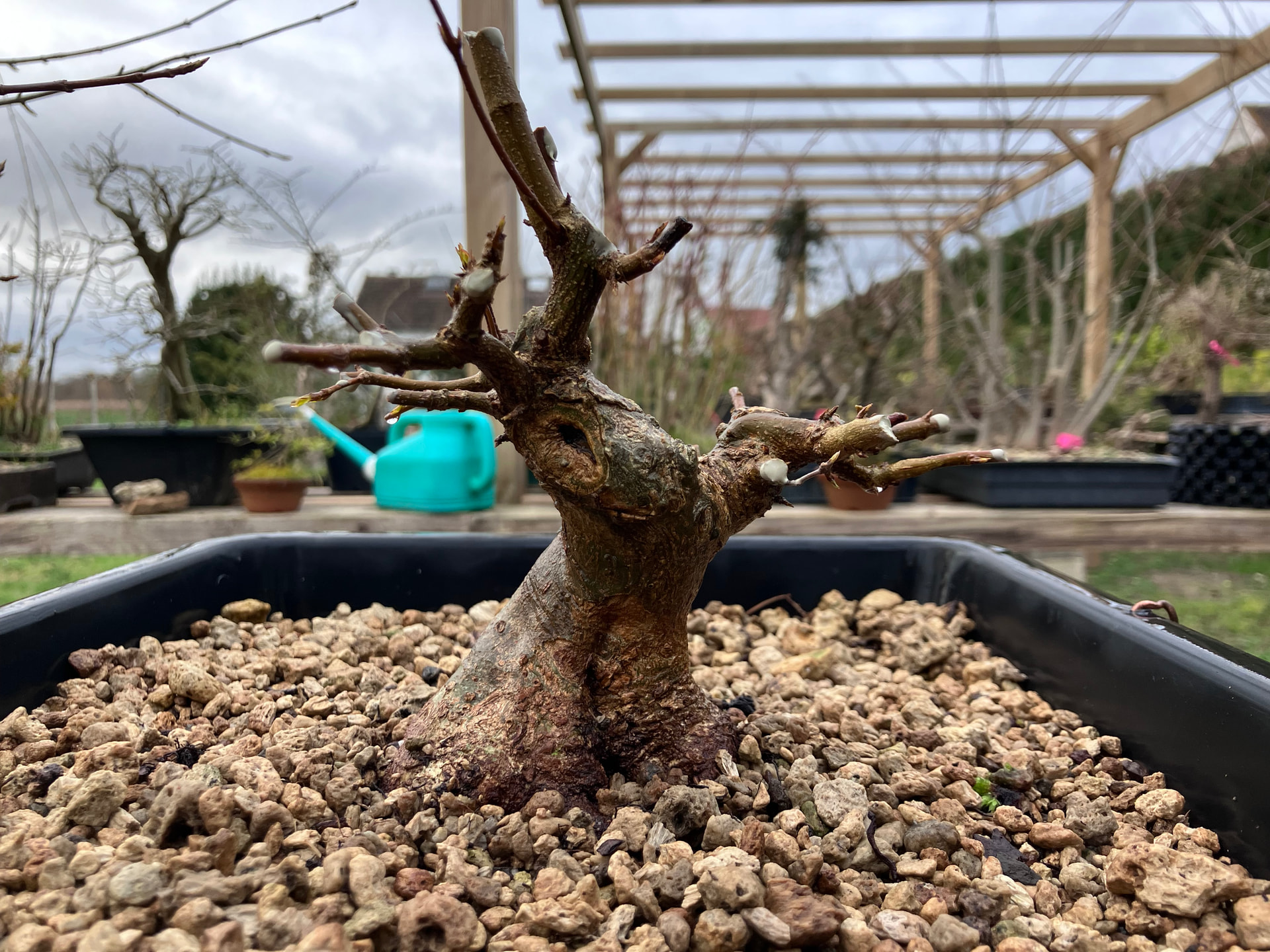 Je fais les tailles de structure au moment du rempotage sur les arbres qui doivent grossir… Par facilité, et parce que je me concentre surtout sur le racinaire pour le moment… la conicité étant plus un avantage collatéral ici