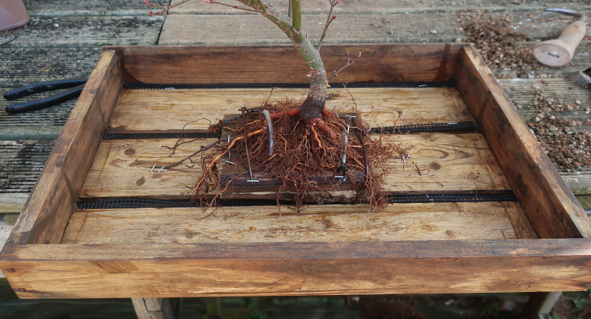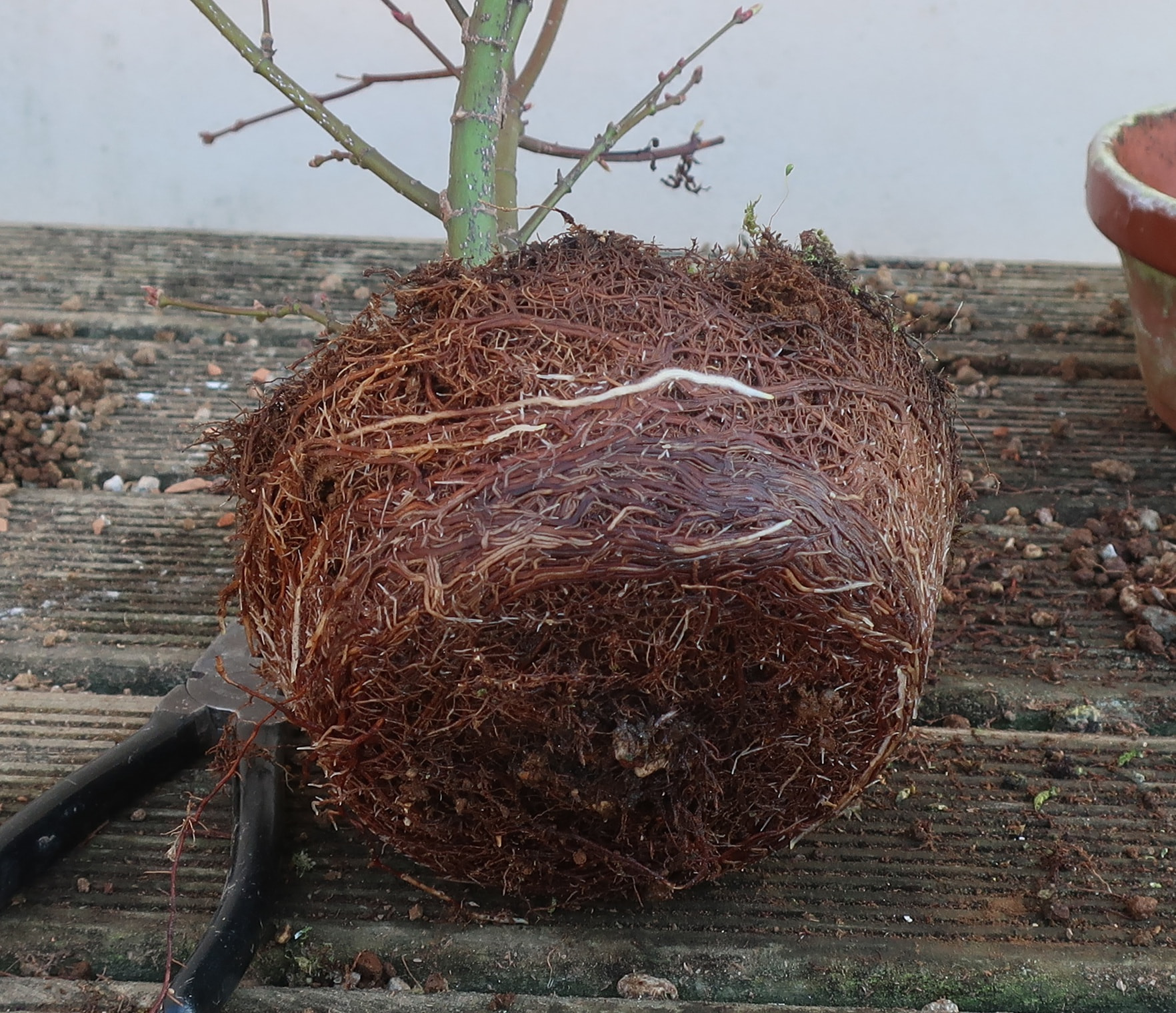 Fin fevrier, l’arbre a commencé à montrer des signe d’activité, donc je l’ai transpoté dans akadama (car le substrat d’origine me semblait trop rétenteur: terreau+ecorces) →