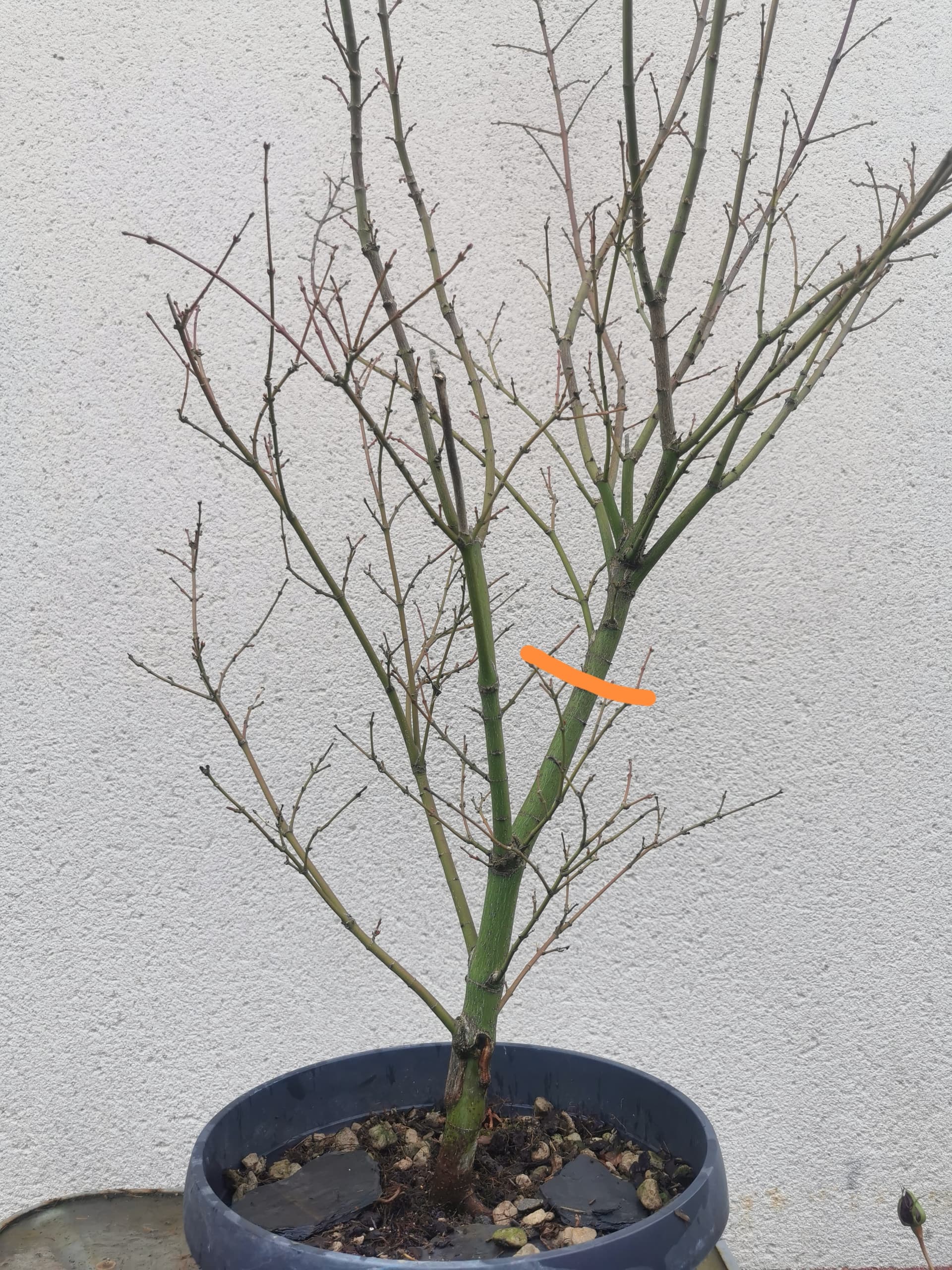 J’ai oublié de présenter mon pink dwarf, sur lequel je suis encore hésitant car la greffe est vraiment pas très jolie… je vais m’essayer au marcottage ce printemps au niveau du trait orange. Arbre encore d’entraînement.