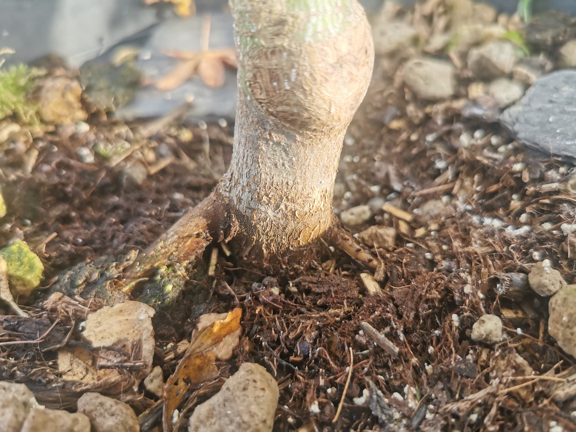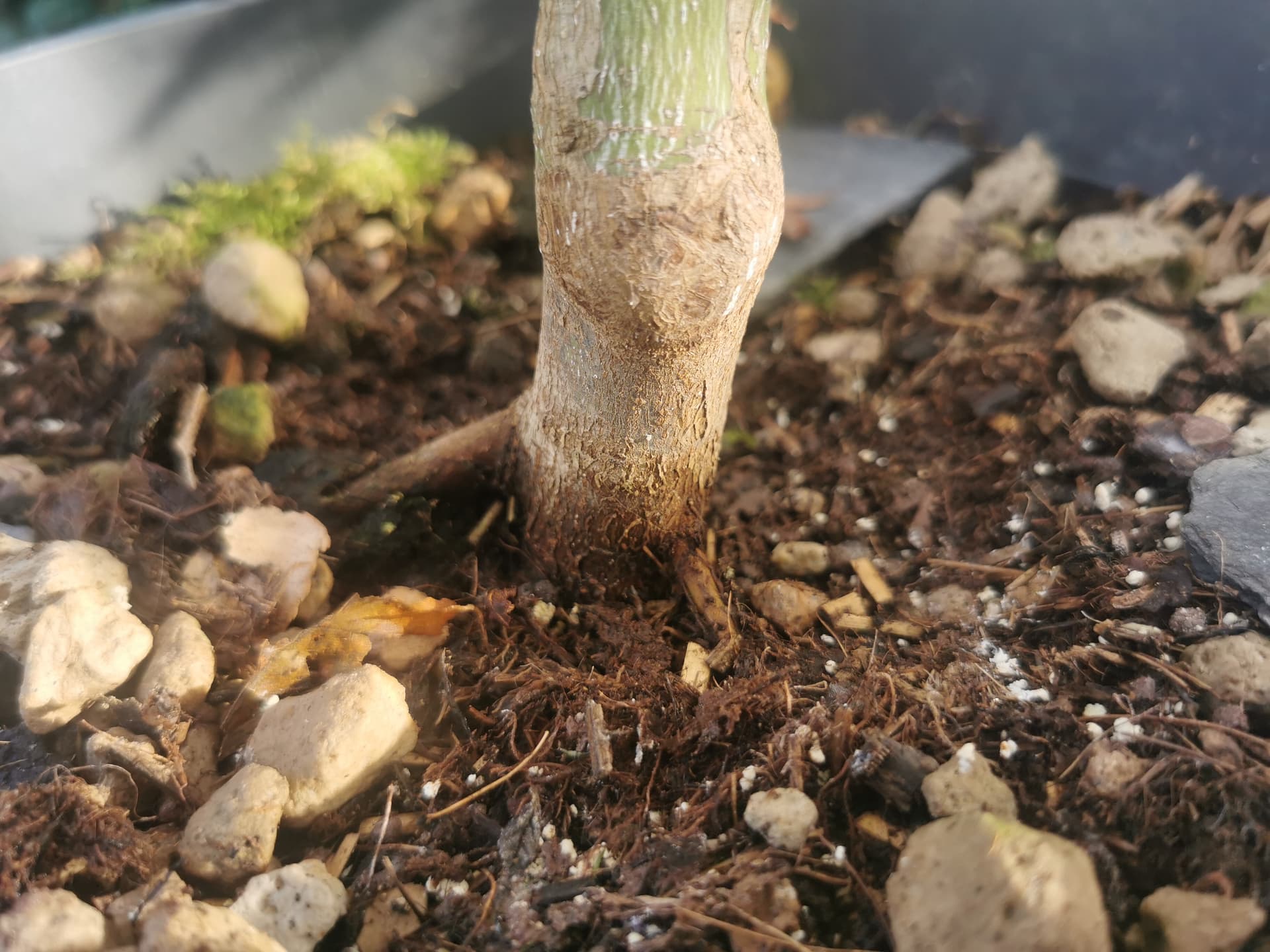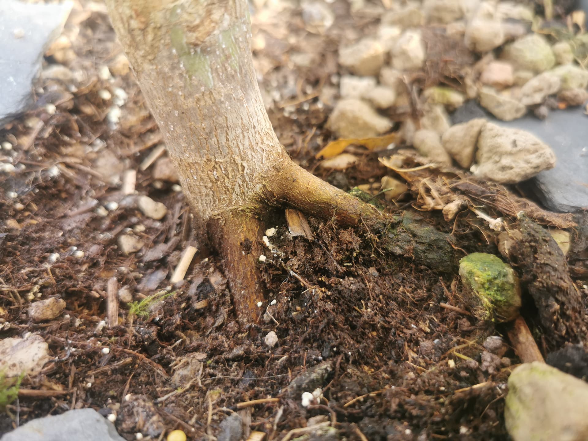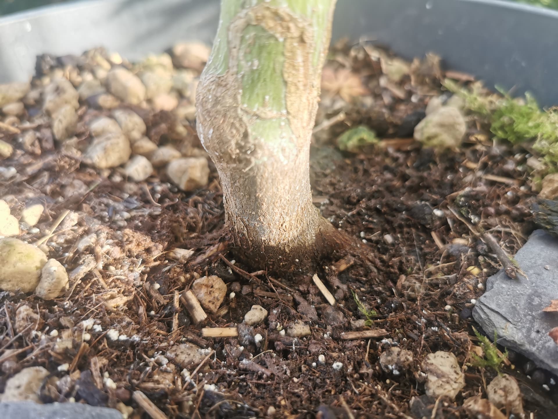 Avant d’acheter un jeune plant, faut dégager le sol et voir si le nebari est bon. Sur les cultivars de palmatum, y’a souvent un point de greffe sur le tronc car la multiplication par greffes est un procédé plus rapide que le bouturage/marcottage. Donc y’en a p’tet un aussi sur ton palma “Ukigumo”.