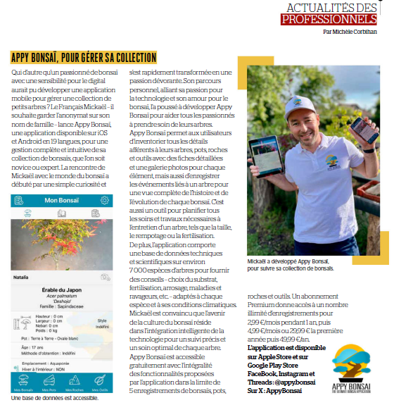 J’ai l’immense honneur de vous annoncer que le magazine Esprit Bonsaï a publié un article consacré à mon application Appy Bonsaï dans son dernier numéro (N°130 de juin - juillet).