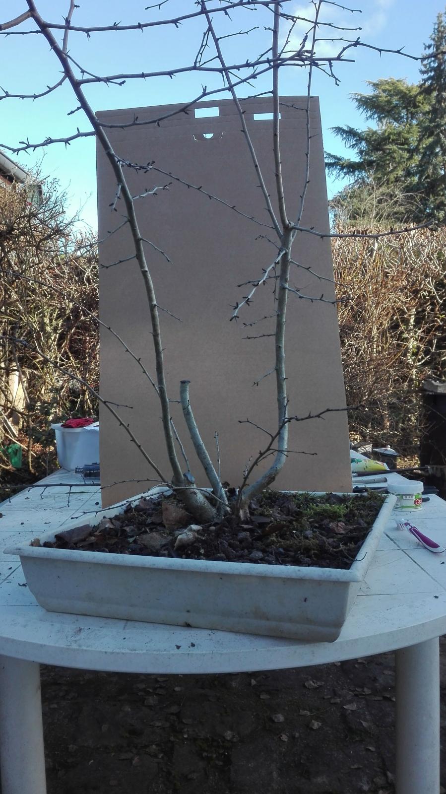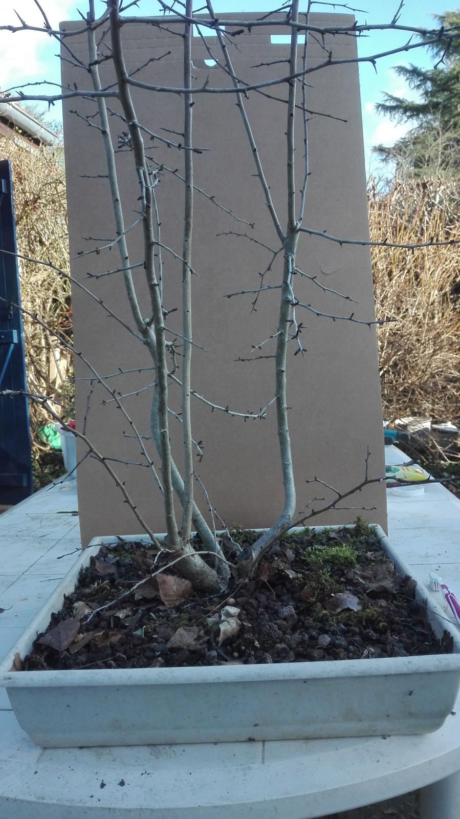 Cette aubépine s'est bien plu dans se caisse apparemment ! J'ai taillé le tronc central pour ralentir son grossissement et essayer de lui trouver une forme plus intéressante. J'ai aussi sélectionné un des deux départs après la coupe sur le tronc principal (gauche) pour commencer à le faire grossir. J'hésite à raccourcir plus ou moins celui de droite. Celui de gauche je le laisse libre pour fermer la coupe et grossir la partie supérieure.