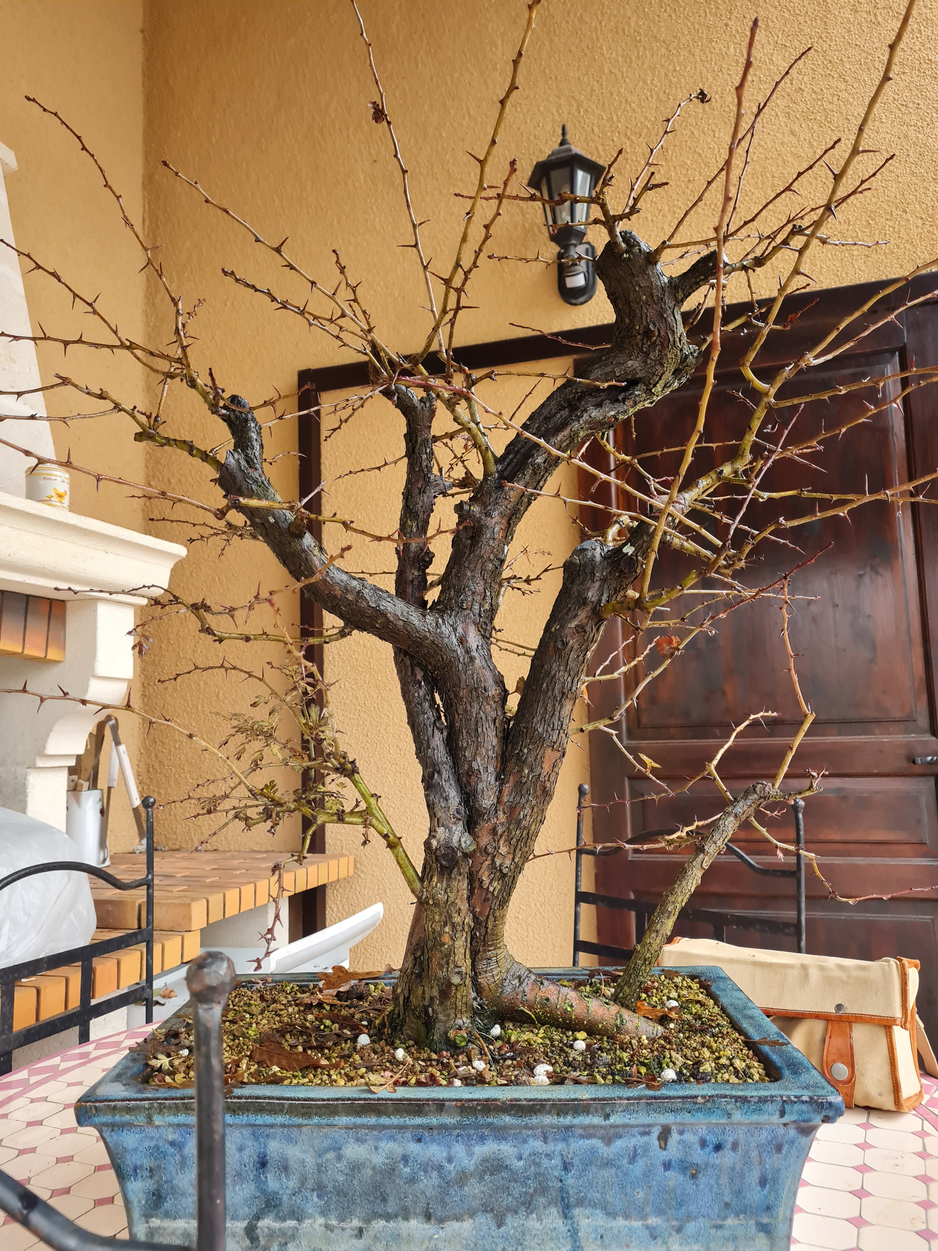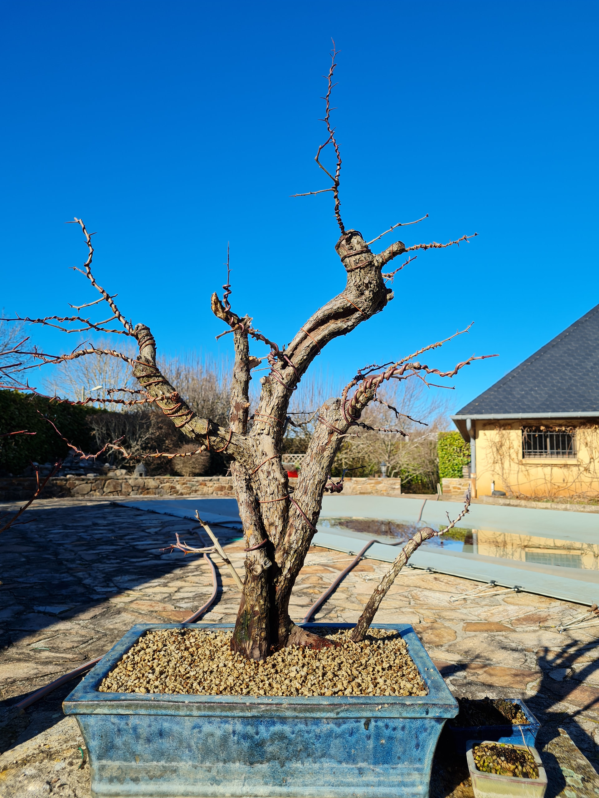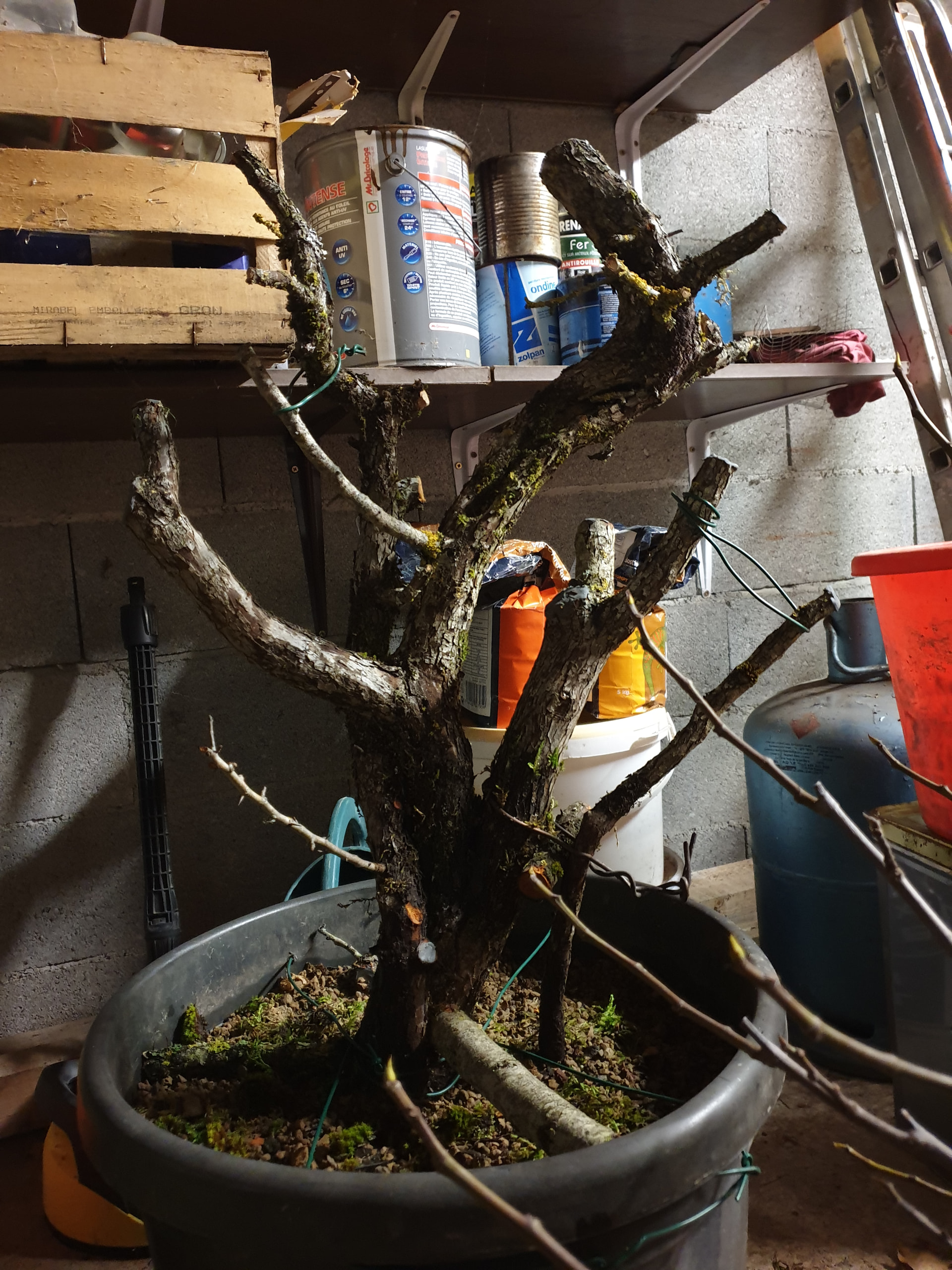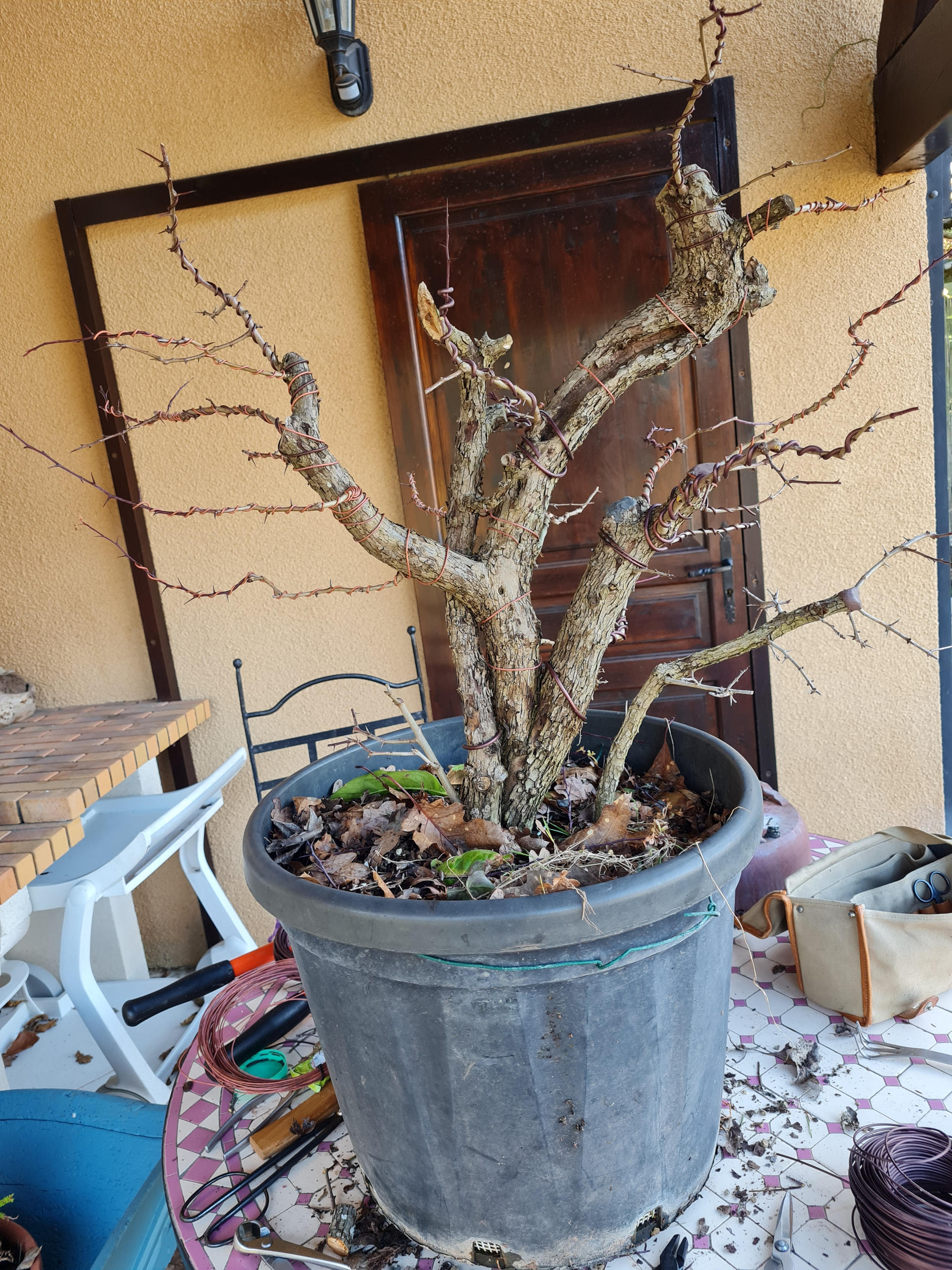 La voici aujourd’hui au printemps 2026, le tronc sec de gauche a cassé avec l’hiver. Je l’avais aussi rempoté une autre fois .. je dirais début 2025 ou 24 je ne sait plus. Je pense que l’année prochaine elle sera rempotée.