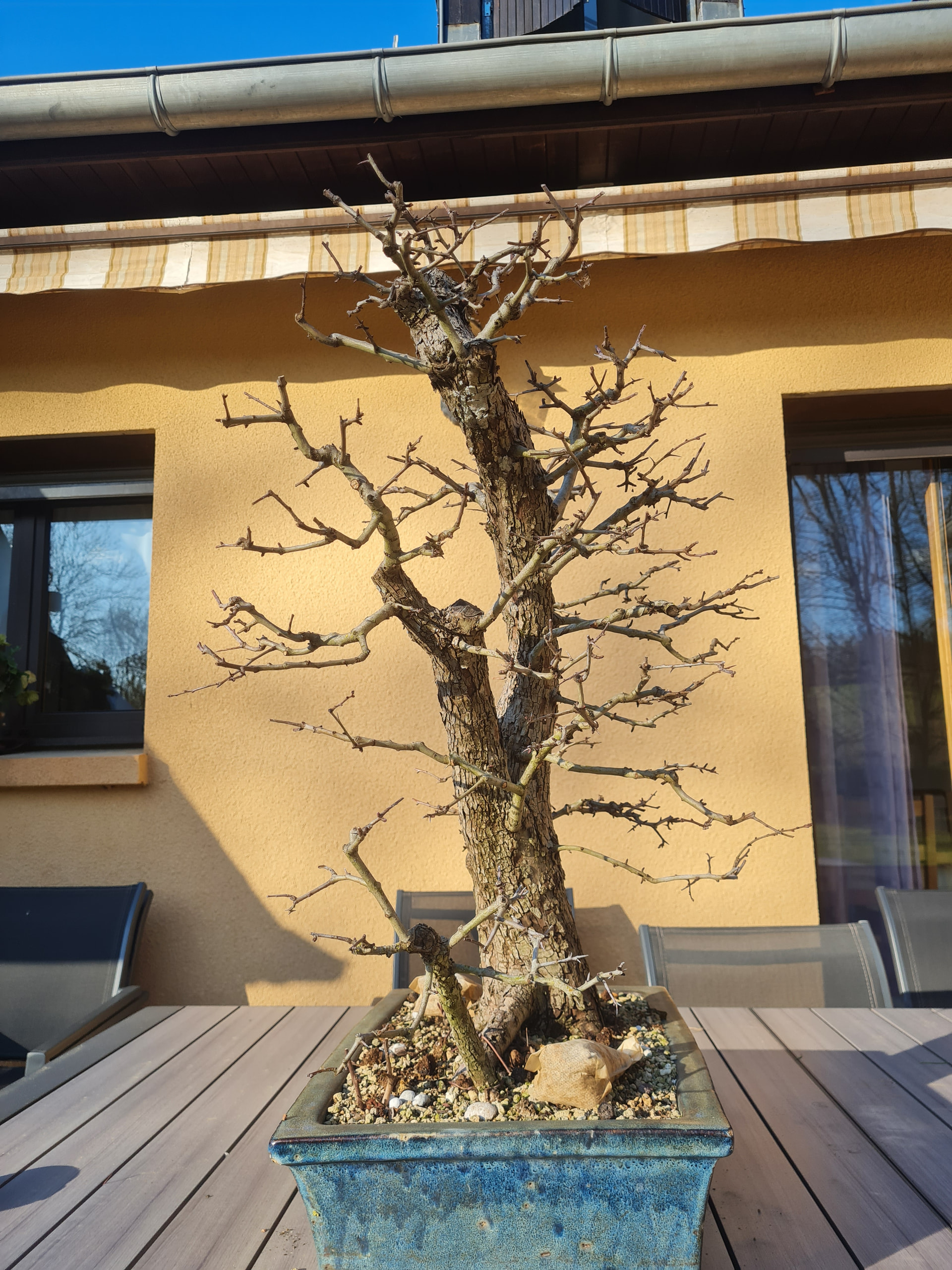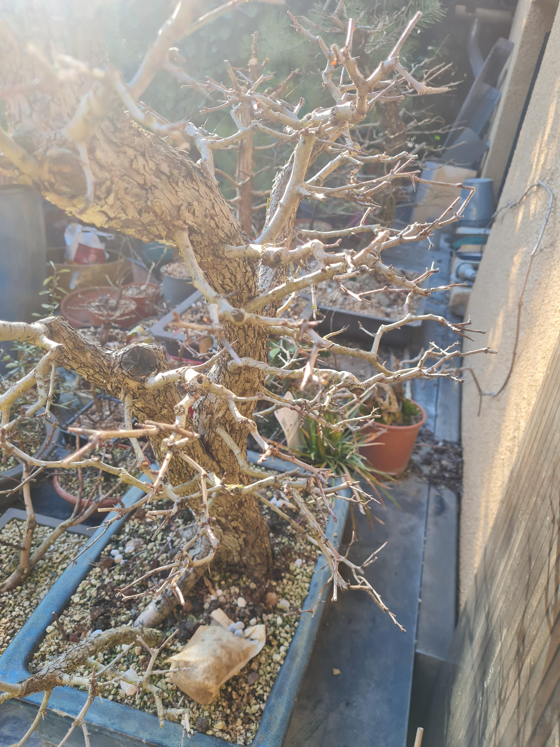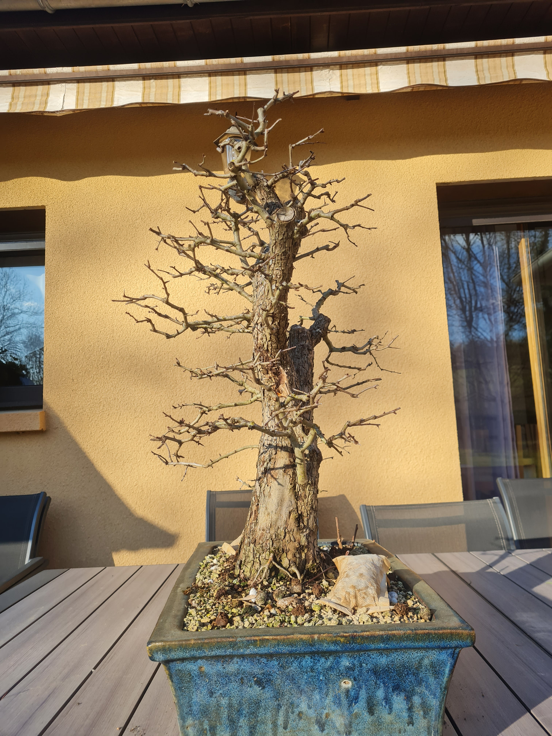 La voici aujourd’hui au printemps 2026, le tronc sec de gauche a cassé avec l’hiver. Je l’avais aussi rempoté une autre fois .. je dirais début 2025 ou 24 je ne sait plus. Je pense que l’année prochaine elle sera rempotée.