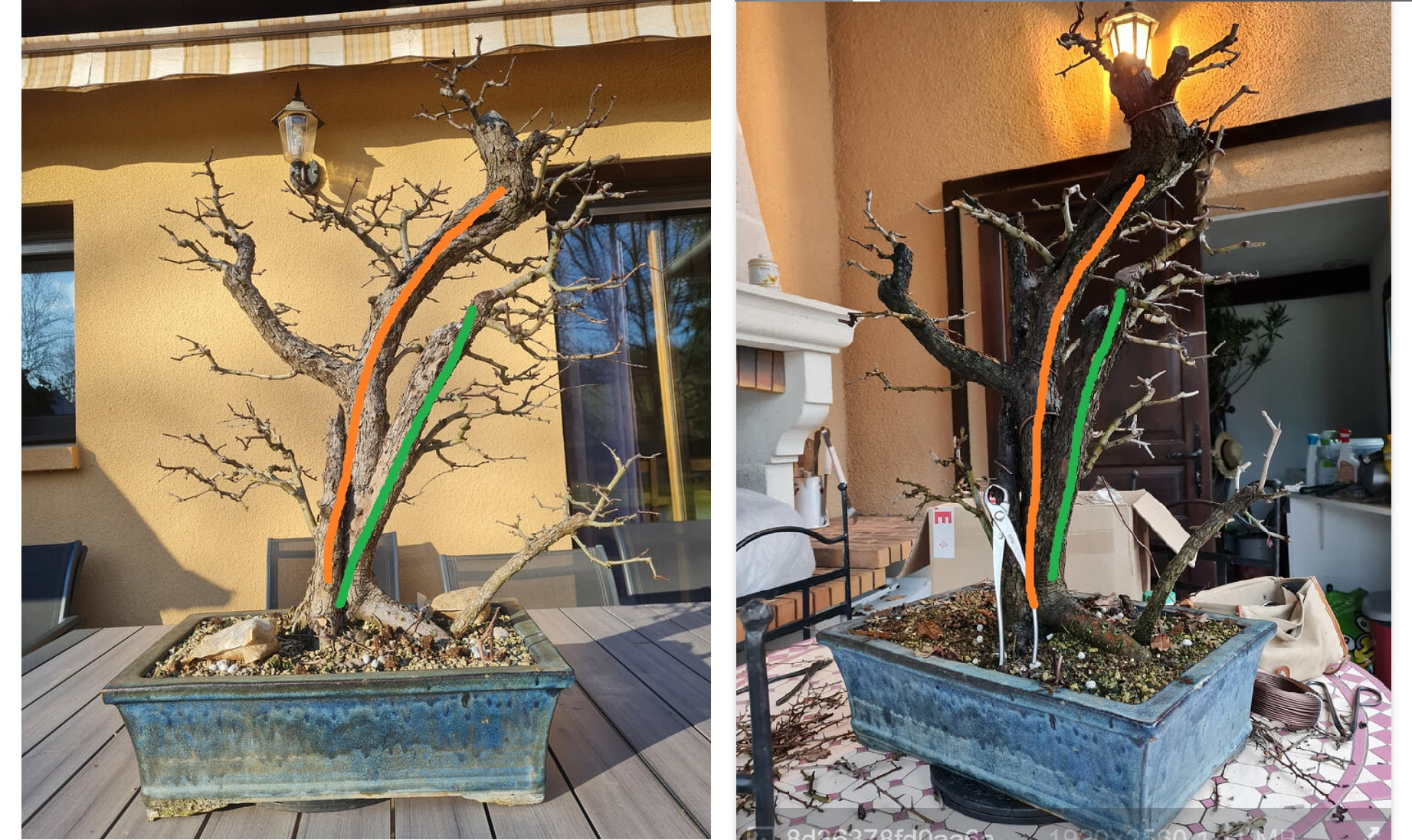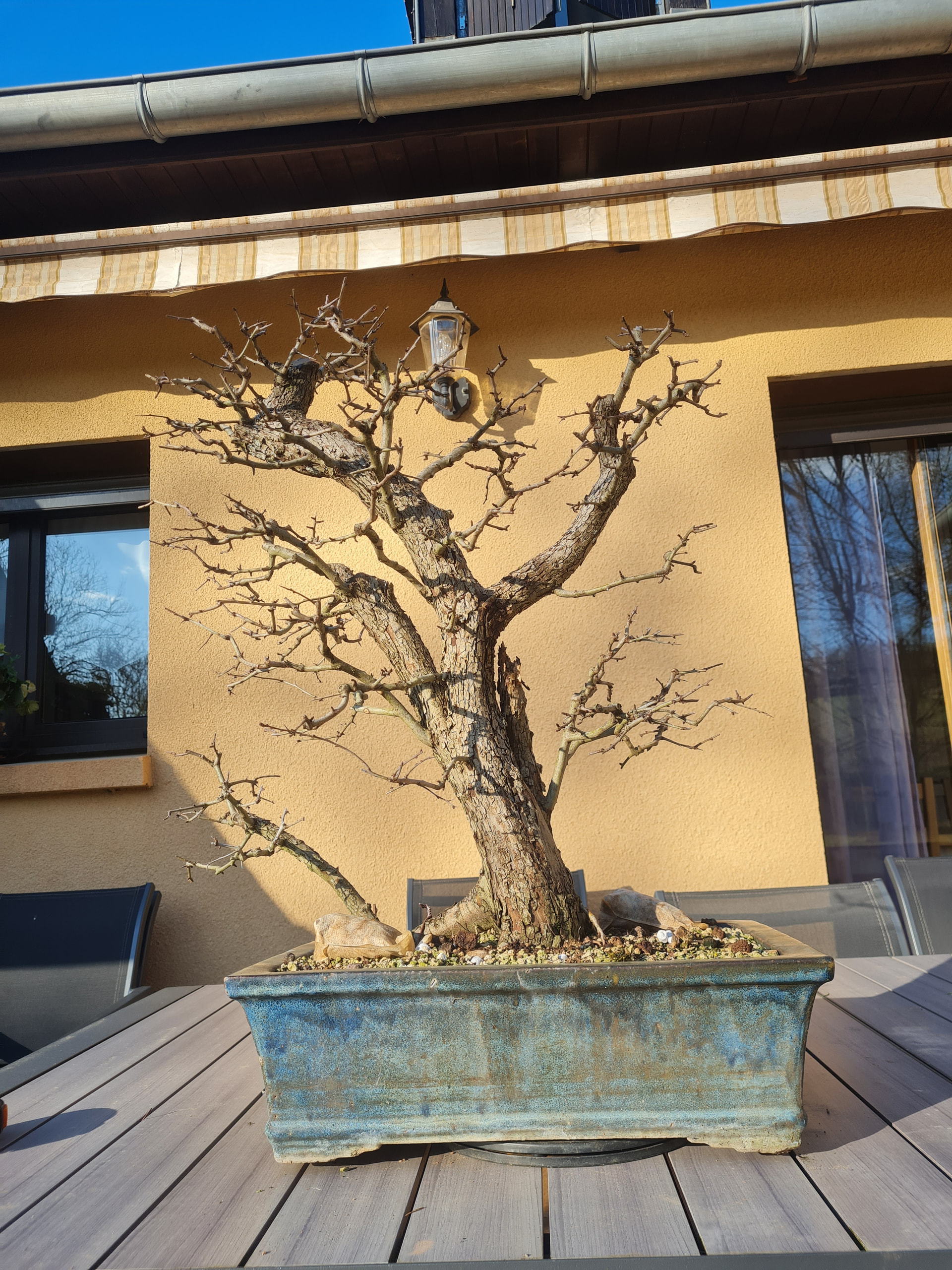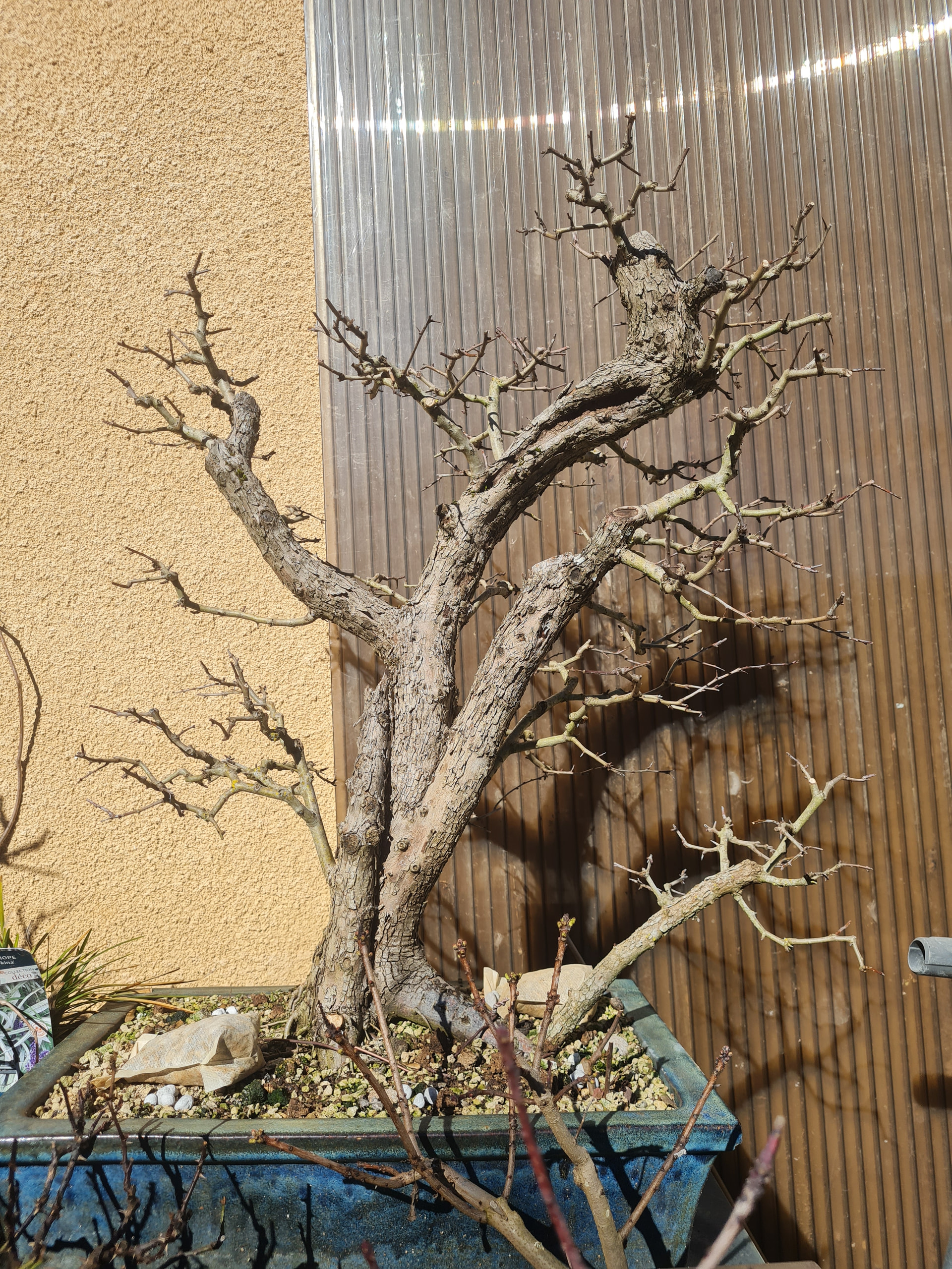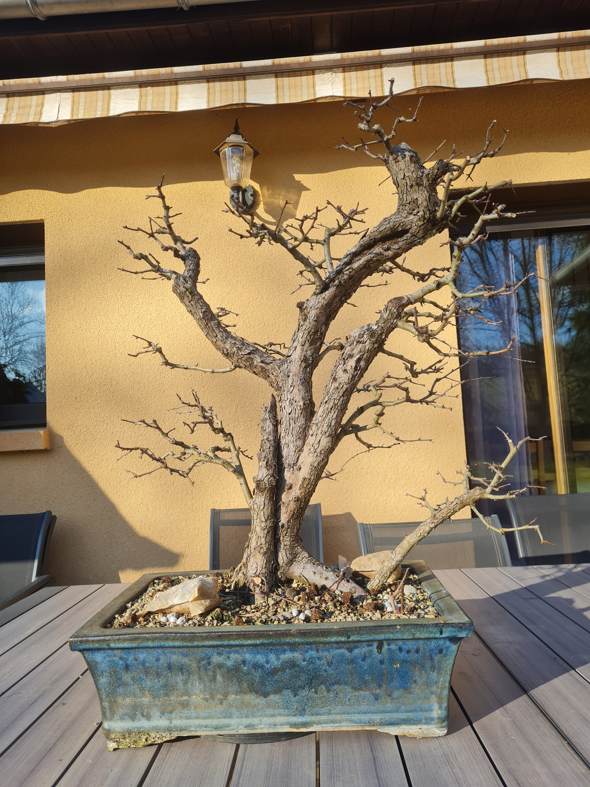 La voici aujourd’hui au printemps 2026, le tronc sec de gauche a cassé avec l’hiver. Je l’avais aussi rempoté une autre fois .. je dirais début 2025 ou 24 je ne sait plus. Je pense que l’année prochaine elle sera rempotée.