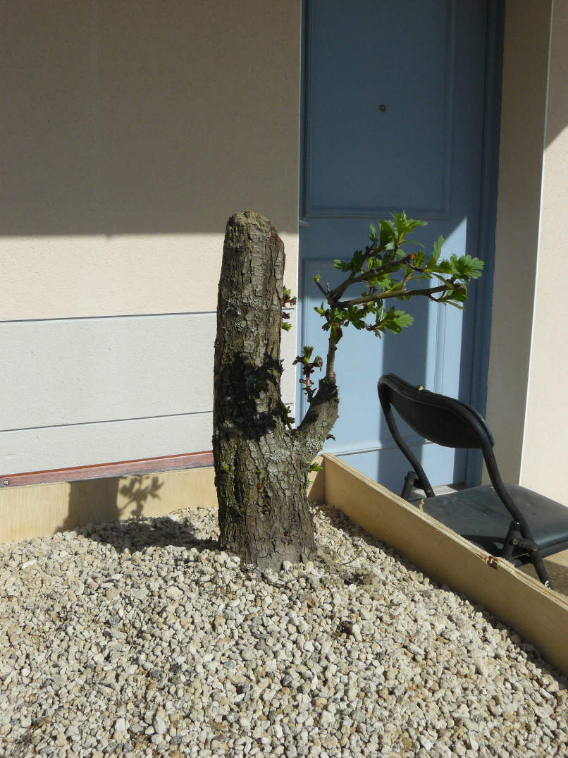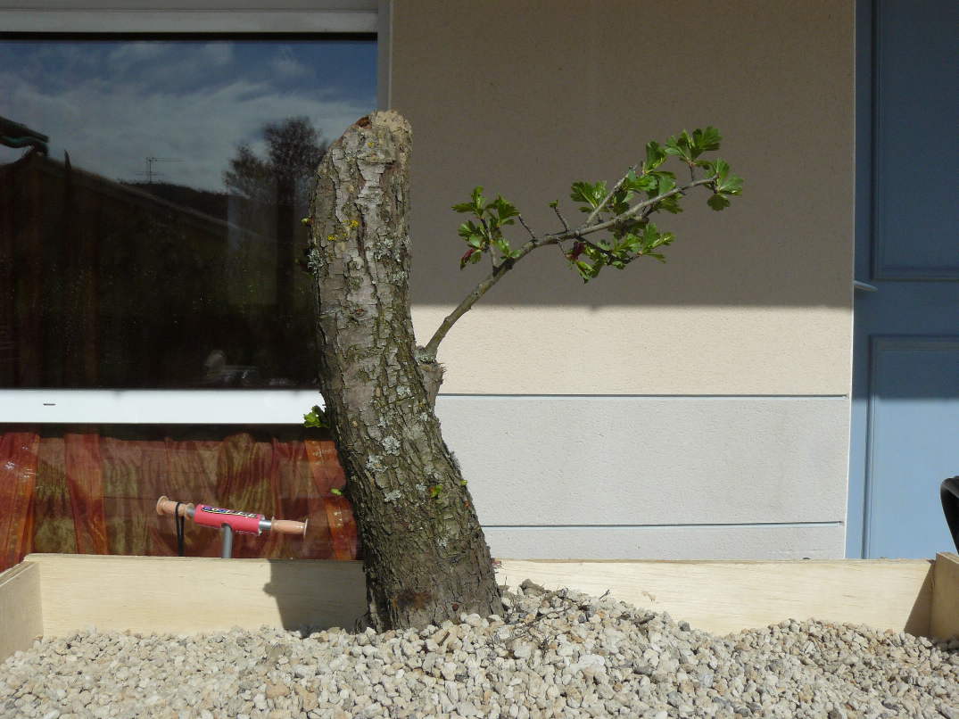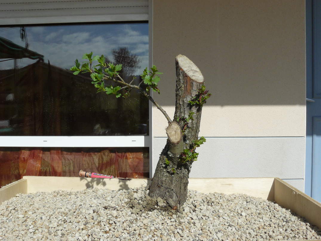 cette aubépine a été prélevée au printemps. Elle démarre fort, mais il va de soit que le prochain travail ne se fera pas avant au mieux l’année prochaine.