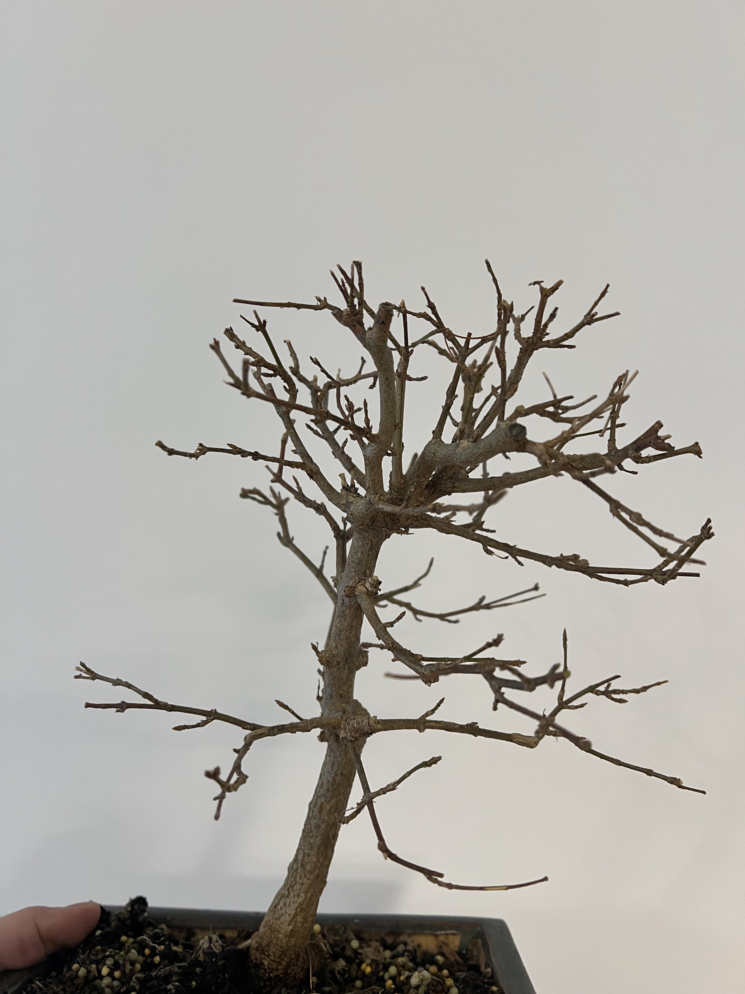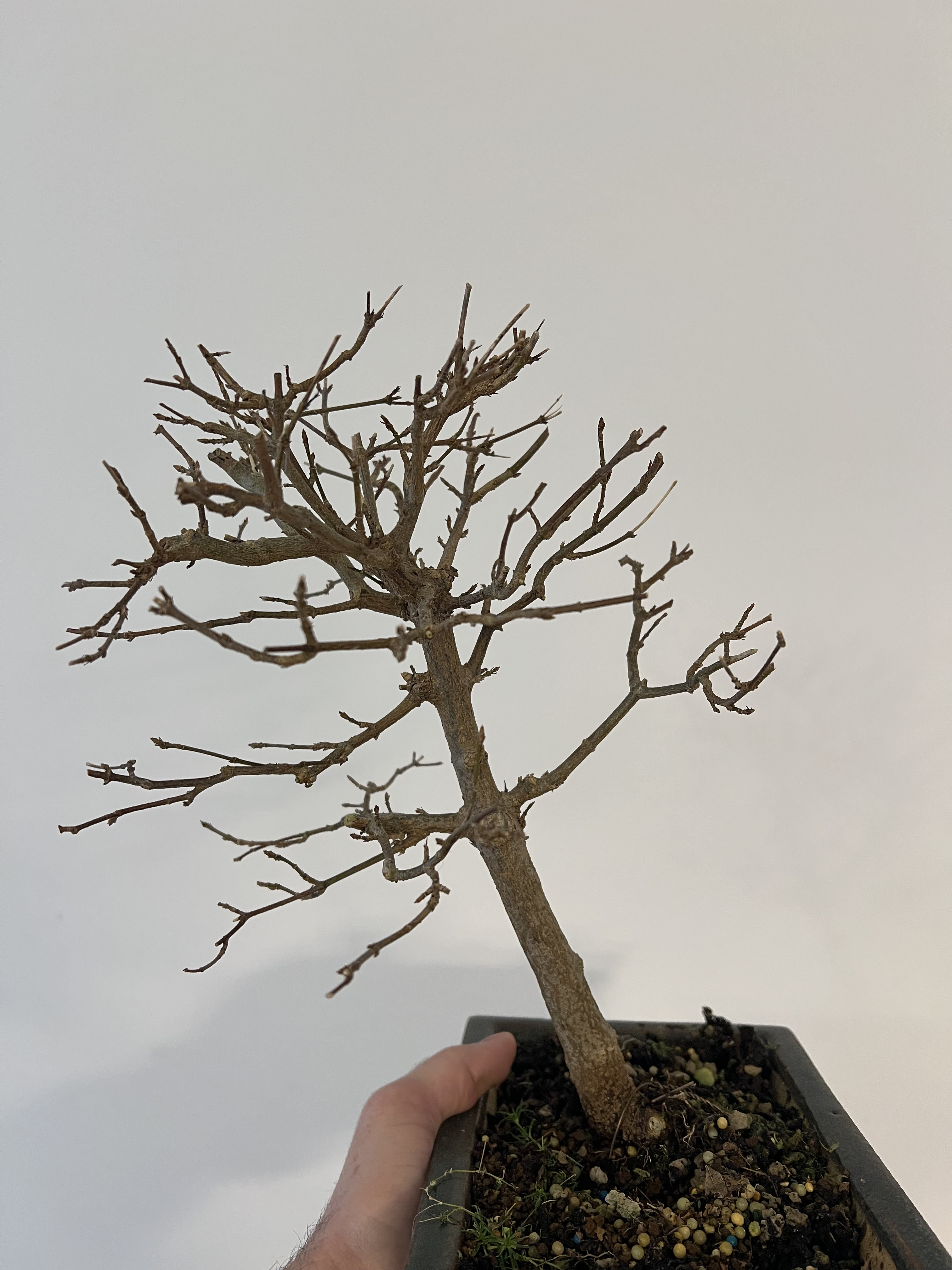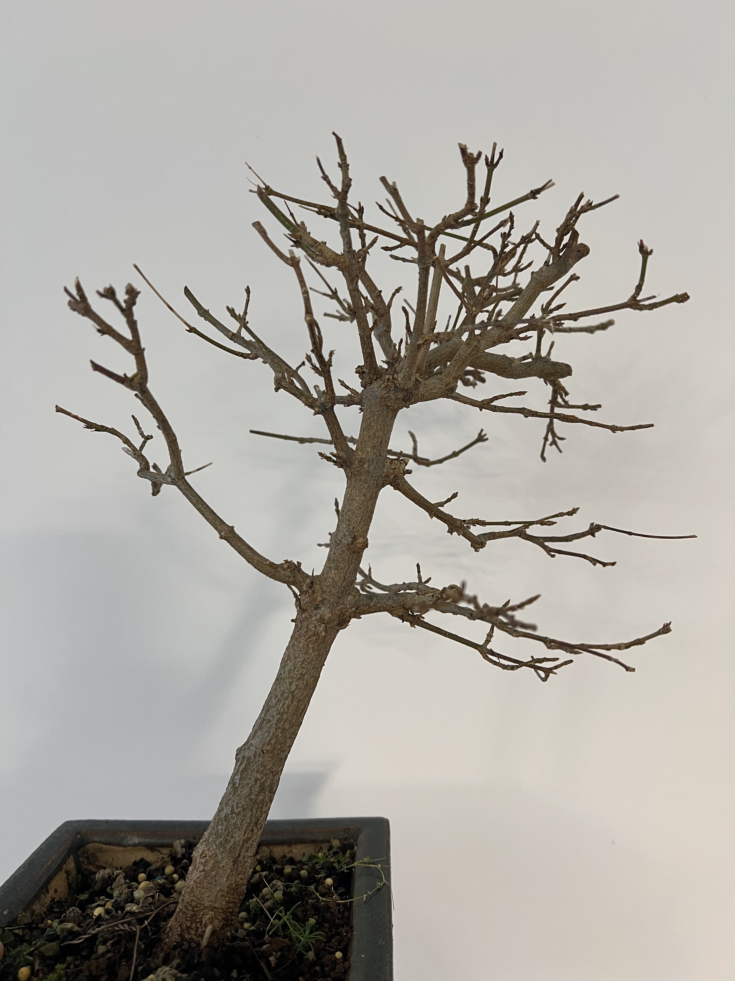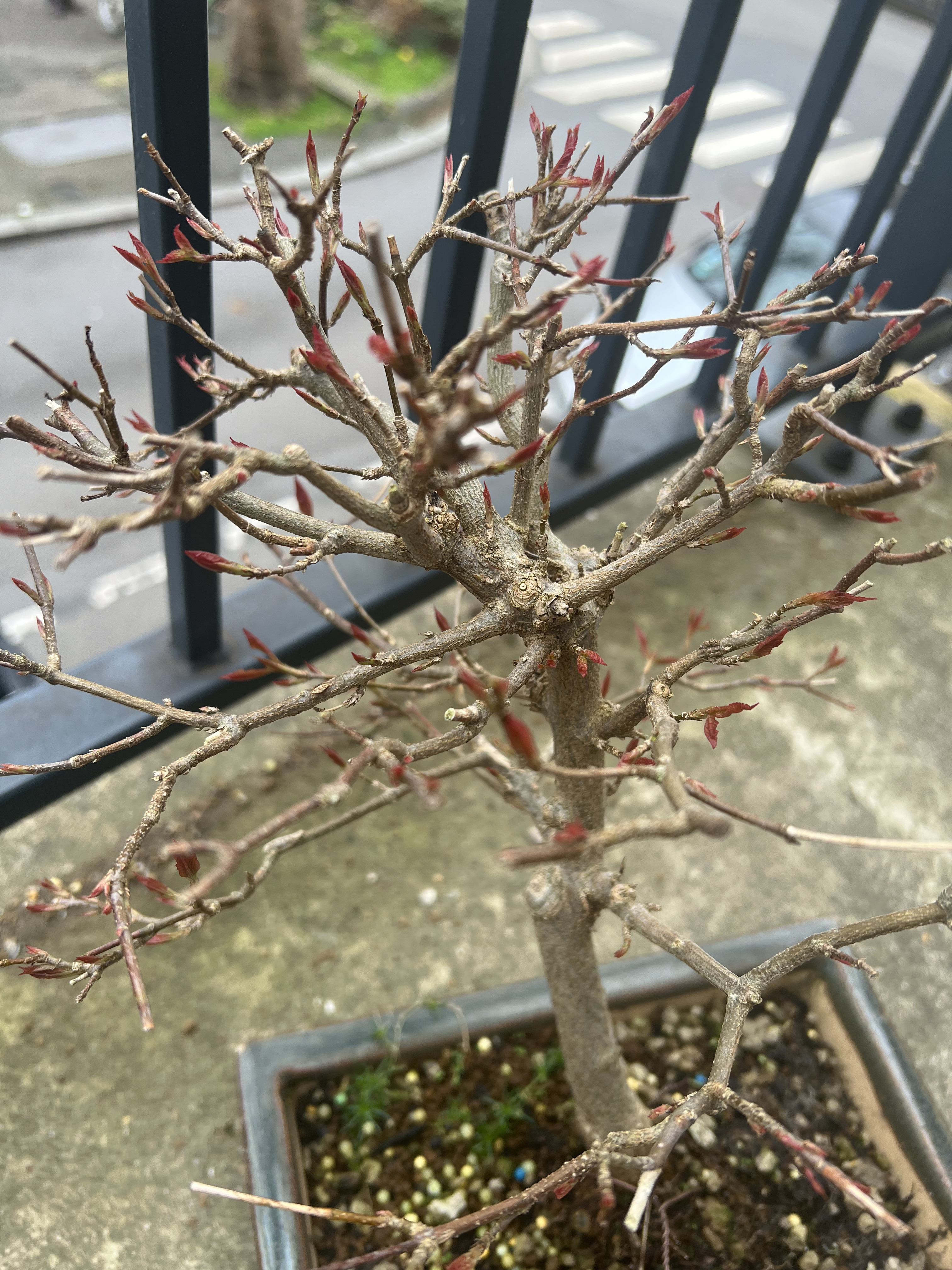 Si tu rempotes la semaine prochaine, il faudra ensuite maintenir l’arbre hors gel. Un pot plus grand sera une très bonne chose car il a l’air à l’étroit. Sur la quantité de racine à enlever, étant donné qu’il s’agit du premier rempotage, tu vas être totalement tributaire de ce que tu vas découvrir. On cherche à avoir des racines radiantes, partants à la même hauteur mais c’est rarement ce que l’on trouve sur ce genre de sujet. Donc il faudrait que tu élimines toutes les racines qui ne rentrent pas dans ce cadre, mais ça ne se fera surement pas en une seule fois : la quantité à enlever serait trop importante. Donc il faudra tout démêler avant de tailler et préserver au maximum les racines qui ont un bon départ. Pour les autres, vue la taille du pot par rapport à l’arbre, supprimer un tiers ou un peu plus de l’ensemble du racinaire parait réaliste. Attention aux bourgeons tout juste ouverts quand on manipule l’arbre : ils sont très fragiles.