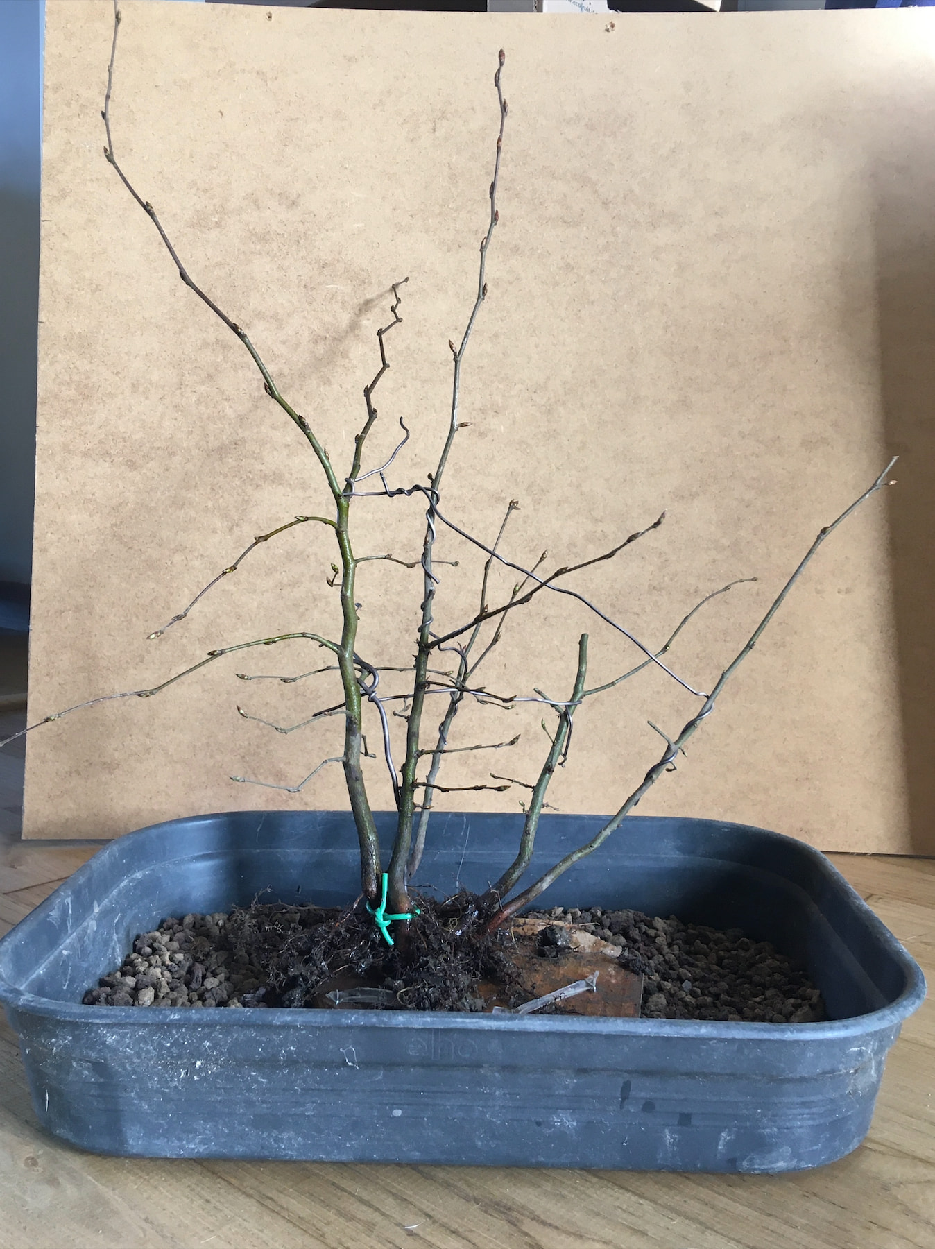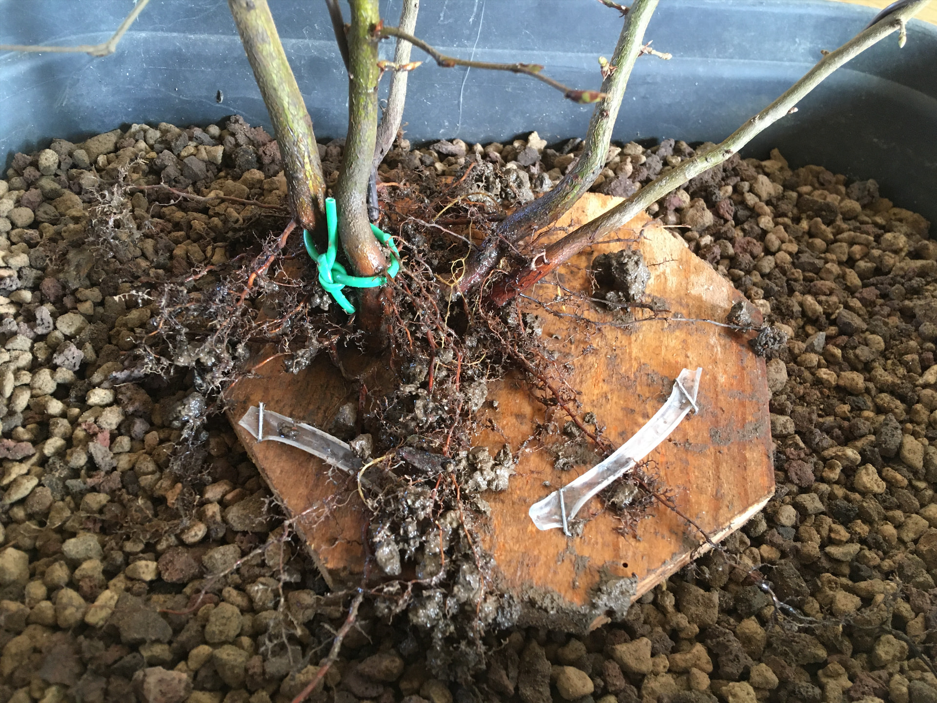 J’ai retiré les fils (placés dans des tubes en plastic souple pour ne pas abimer les racines) en Septembre de la 1ere année, lorsque j’ai nettoyé le nebari pour la 1ere fois →