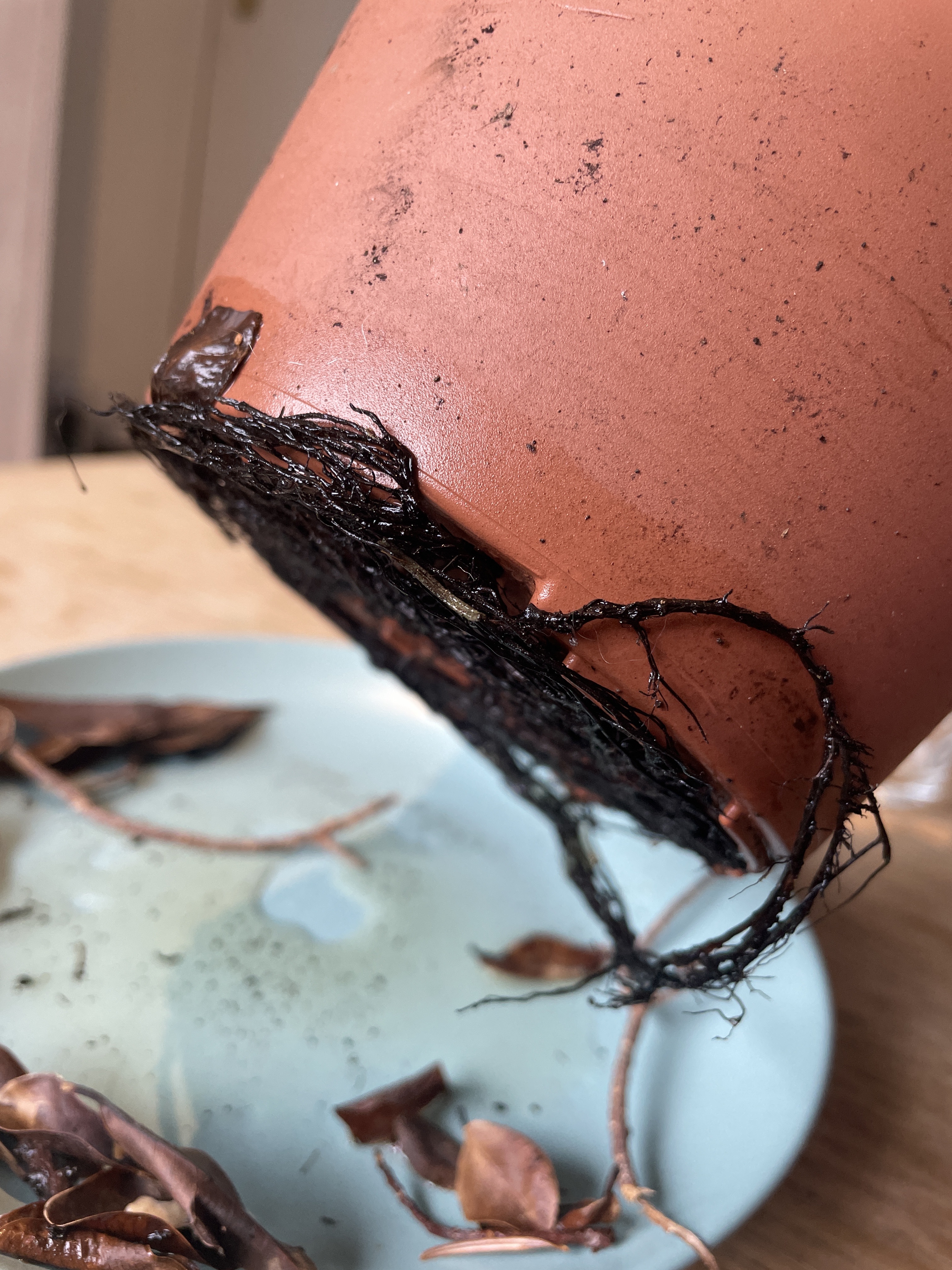 les racines semblent pourries… tu n’as rien à perdre à le sortir du pot et voir si toutes les racines sont noires et molles (pourries). S’il y a encore des racines vivantes, tu peux tenter de le rempoter dans du drainant après avoir coupé les racines mortes, et après avoir retiré toute la terre d’origine , à mon avis.