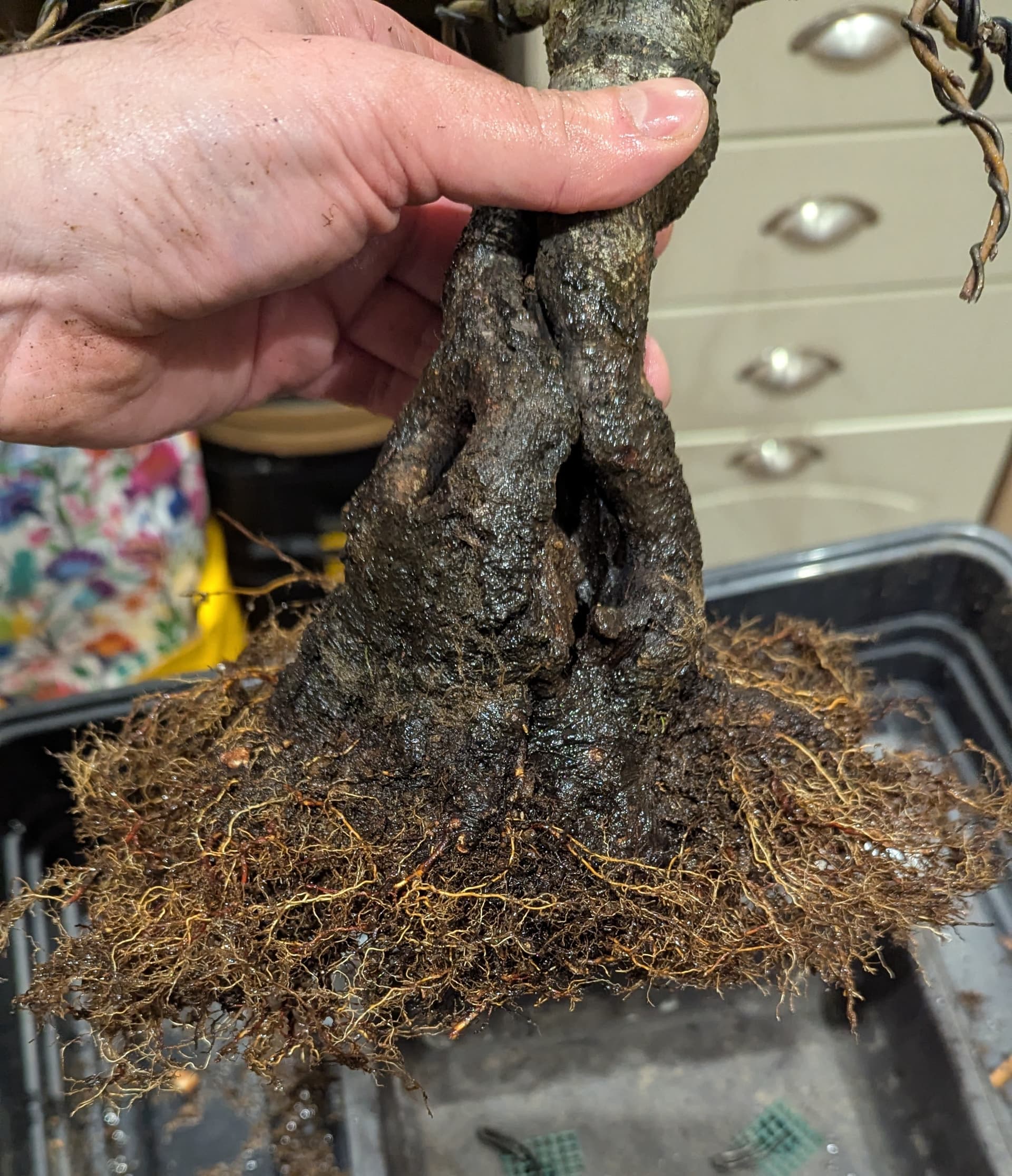Le rempotage a été fait au bon moment : aucune grosse racine sur les bords du pot. Si j’étais encore en phase de construction, j’aurais pu le laisser dans son pot précédent encore une ou deux années.
