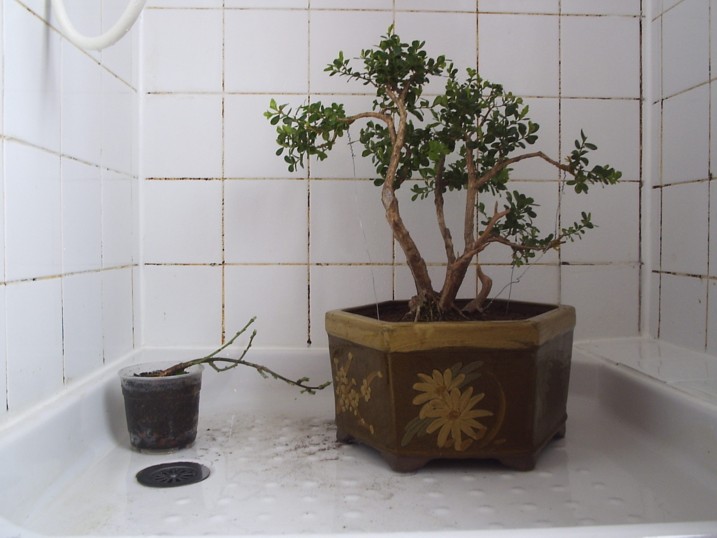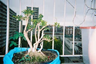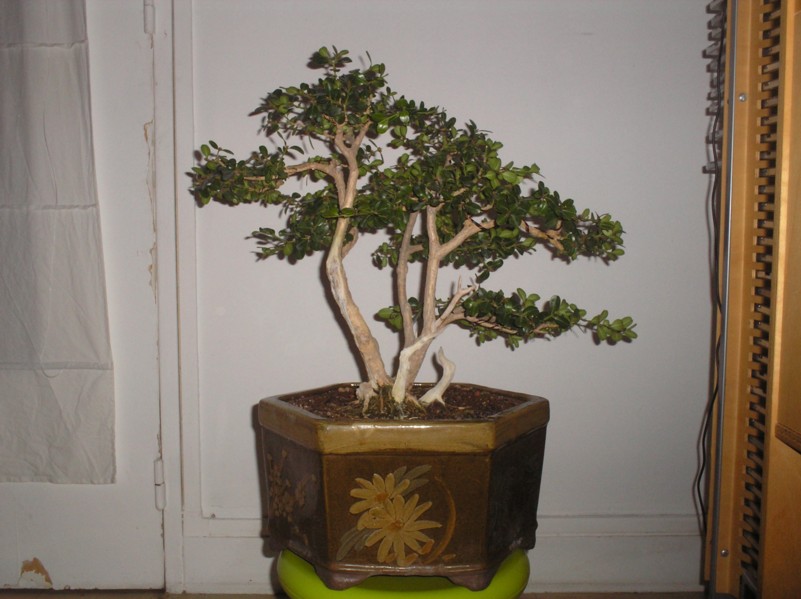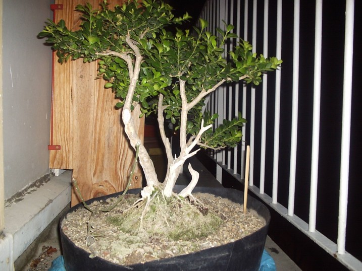 J’ai aperçu un buis qui végétait parmi d’autre plantes agonisantes ,je me suis permis de lui offrir un autre destin que la mort ;et avec les conseils de M. Coiffier ,j’ai dégagé la broussaille ,avant de réduire considérablement sa masse racinaire monstrueuse …Cétait en mars 2003…