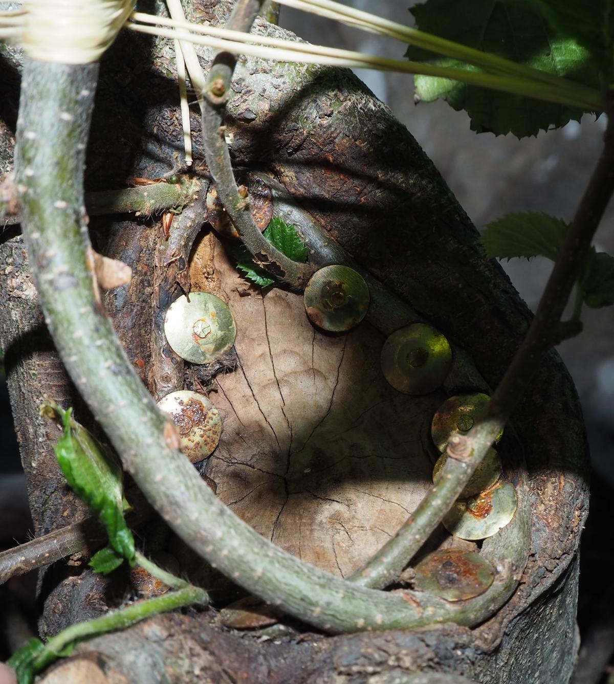 Très intéressante ta tentative pour fermer la coupe, par contre je me poserais la question de peut-être enlever les punaises avant qu’elles ne mordent de trop le greffon et qu’elles fassent de vilaines marques. Cela pourrait être gênant pour faire coïncider au bourrelet le deuxième tour que tu songes faire au greffon.
