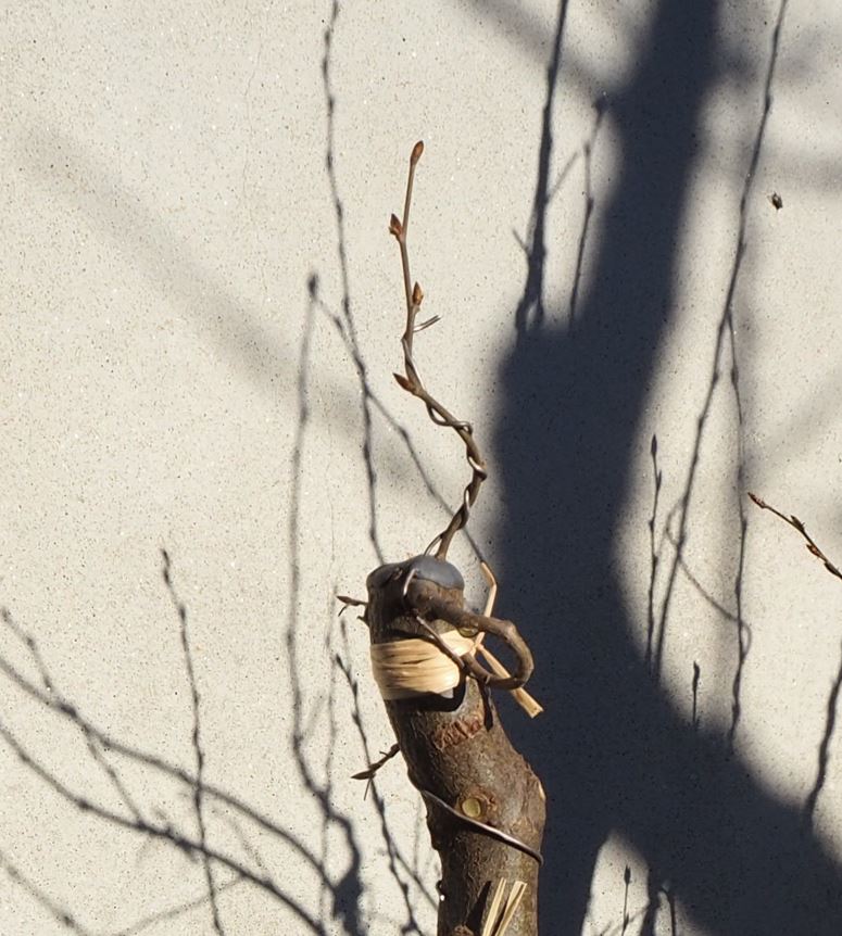 Aujourd’hui je note que la partie de la greffe effectuée dans le même sens de circulation sève que celle de l’arbre s’est assemblée très rapidement.