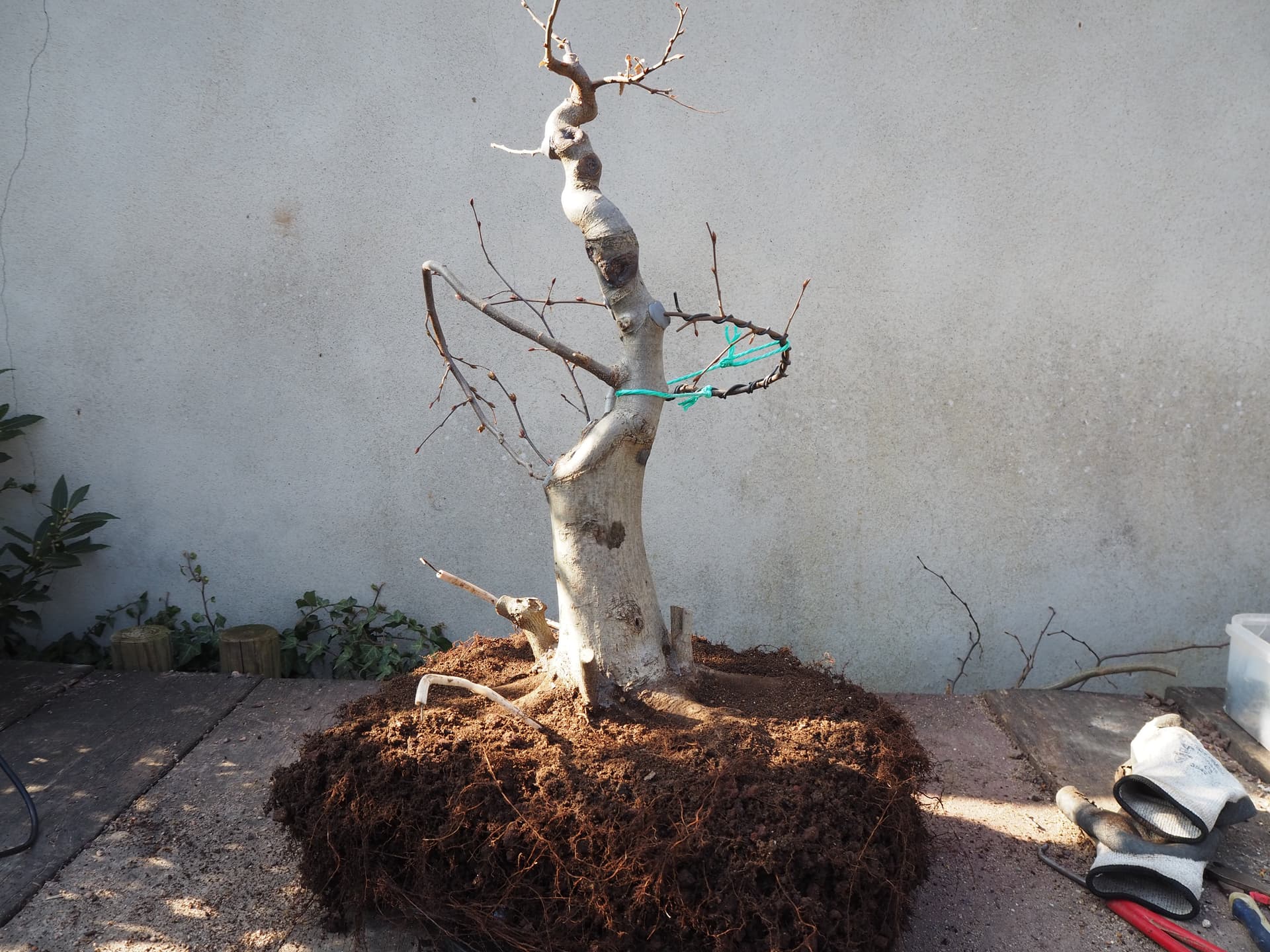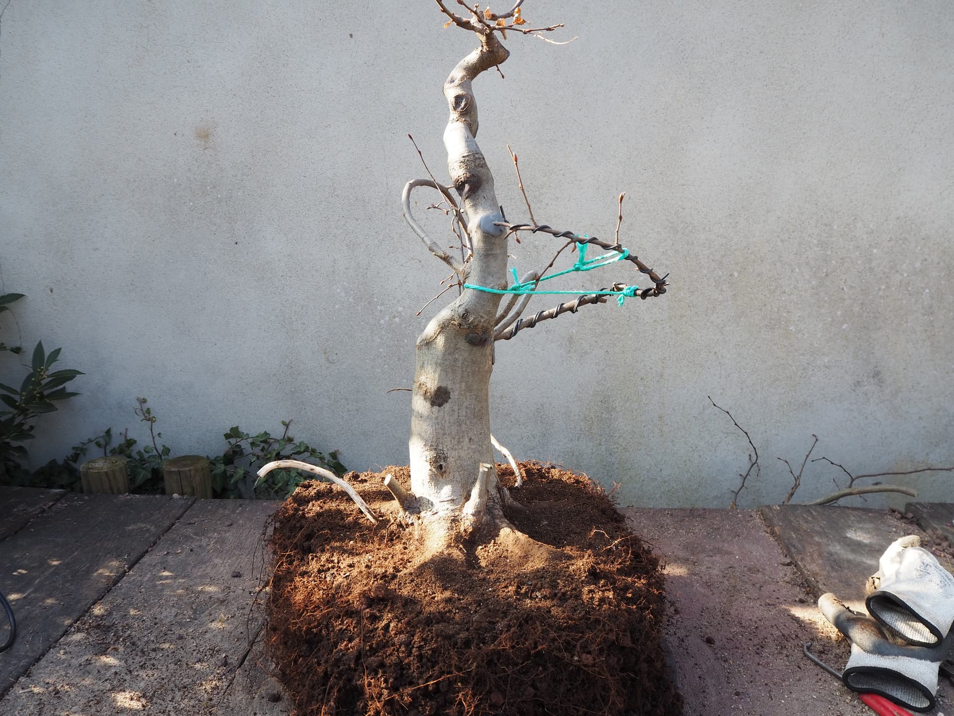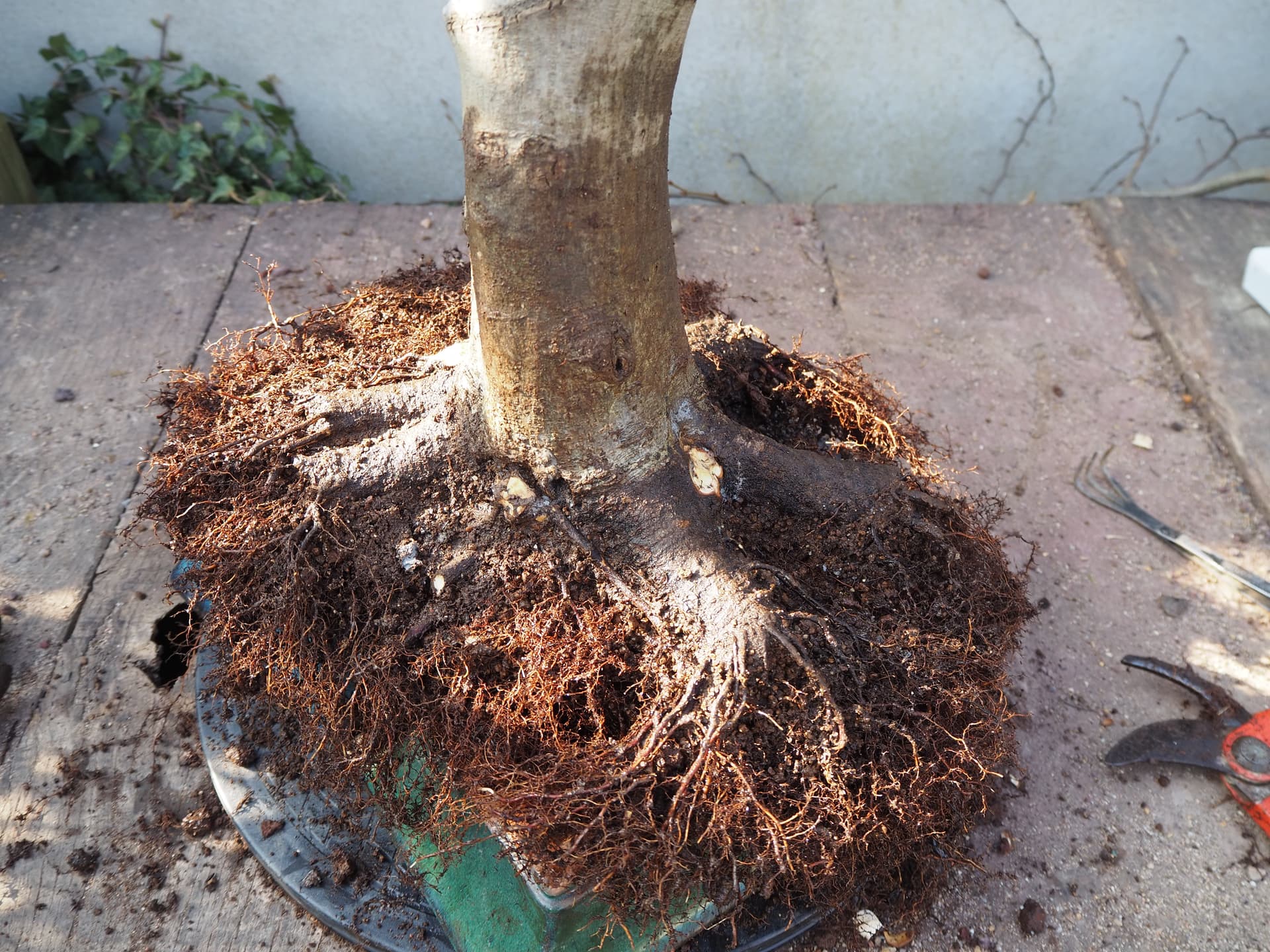 Ensuite j’ai sorti l’arbre de sa caisse pour travailler le racinaire.