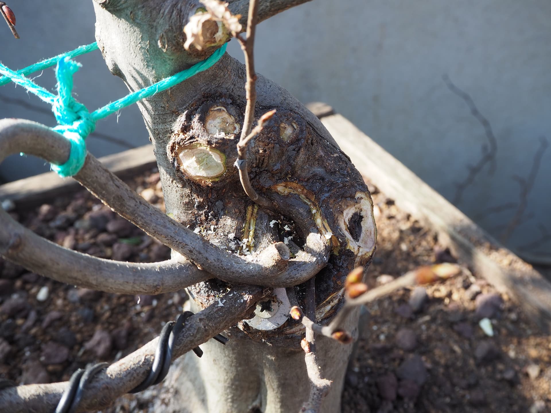 C’est une ebauche, au printemps j’ai prévu de gratter legerement les parties de l’ecorce du greffon enroulé l’année derniere qui sont au contact du cal d’origine pour favoriser la fusion.