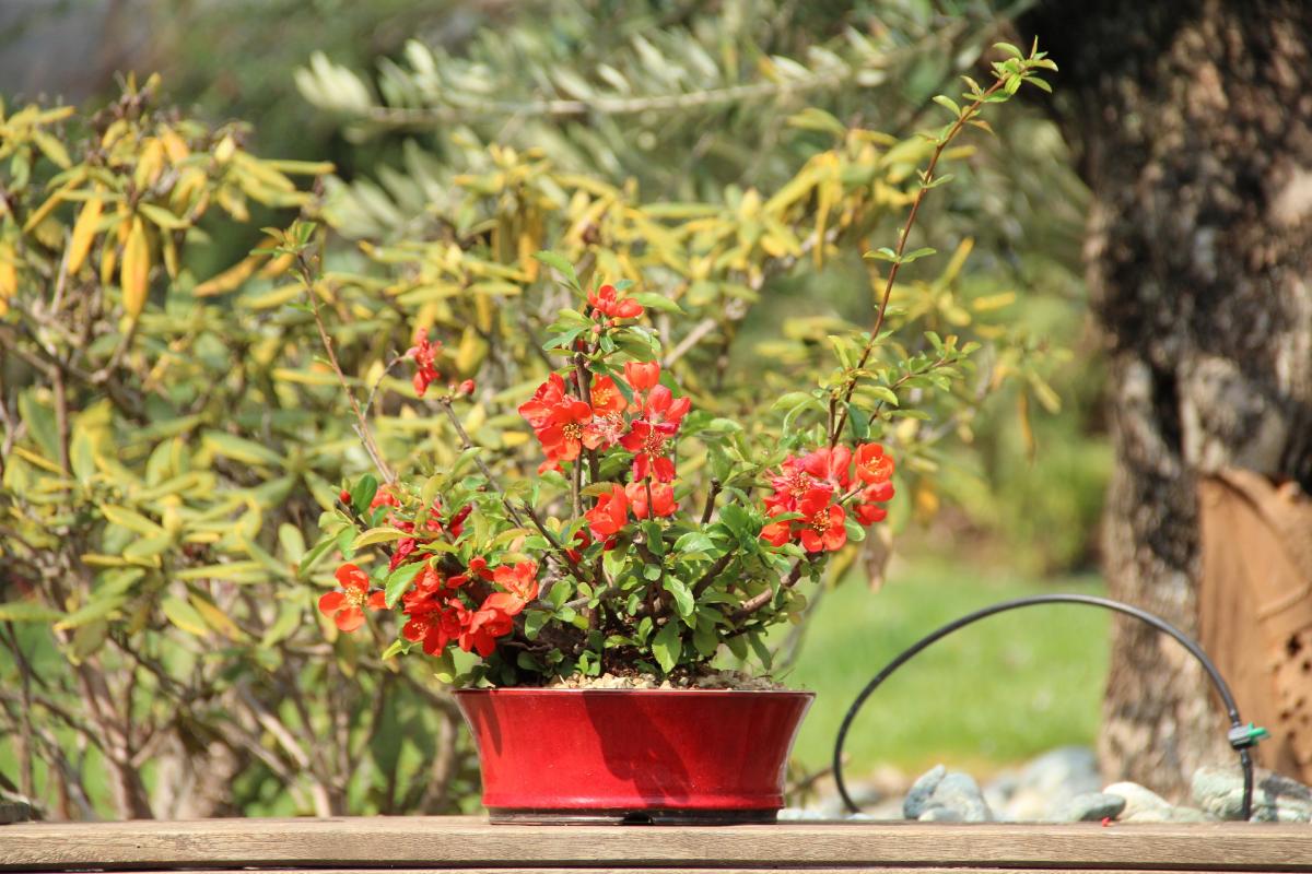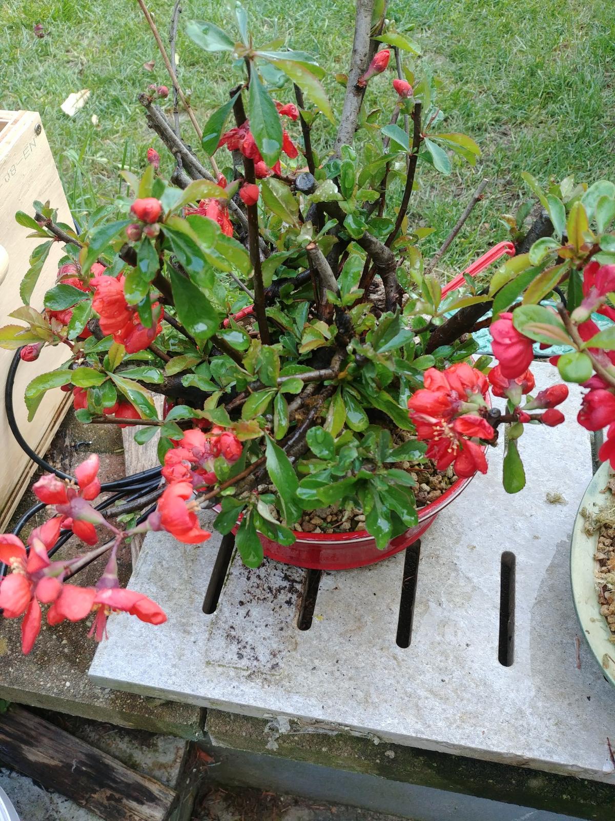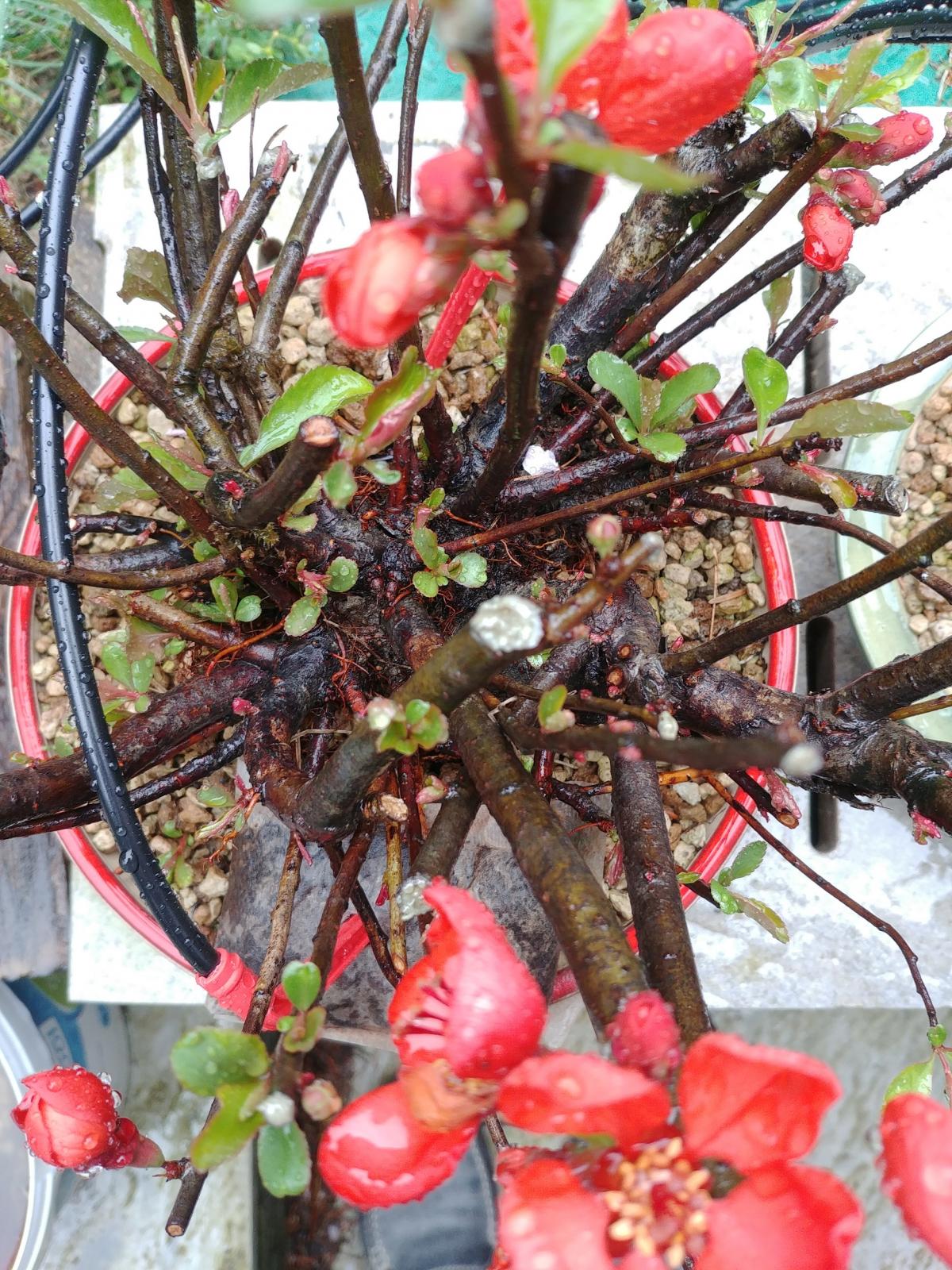 Mise à jour: le chancre des raçines est une infection bactérielle qui arrive surtout si on rempote le chaenomeles au printemps. La recommendation actuelle au Japon est de le rempoter uniquement à l'automne.