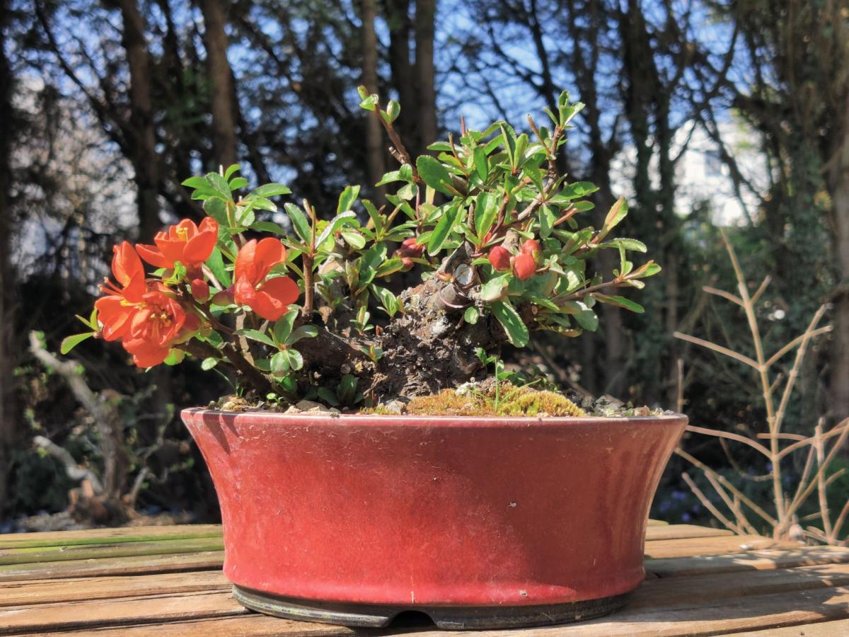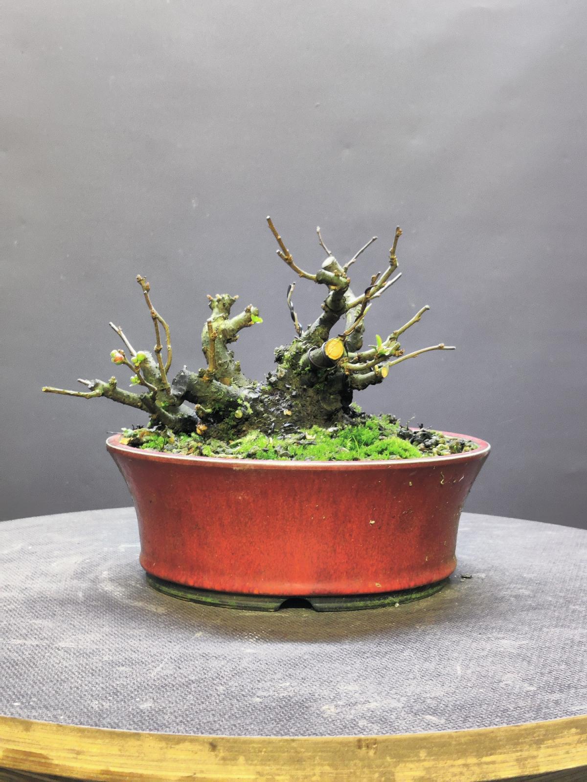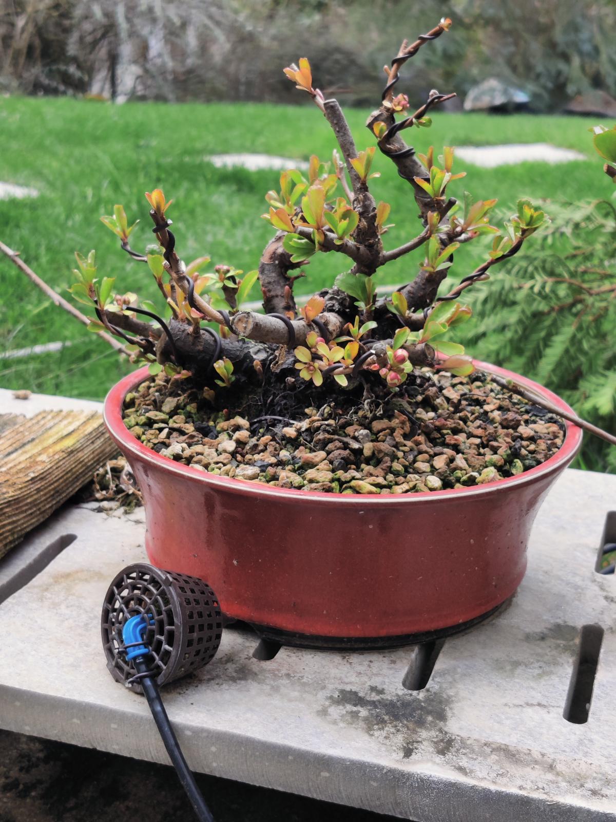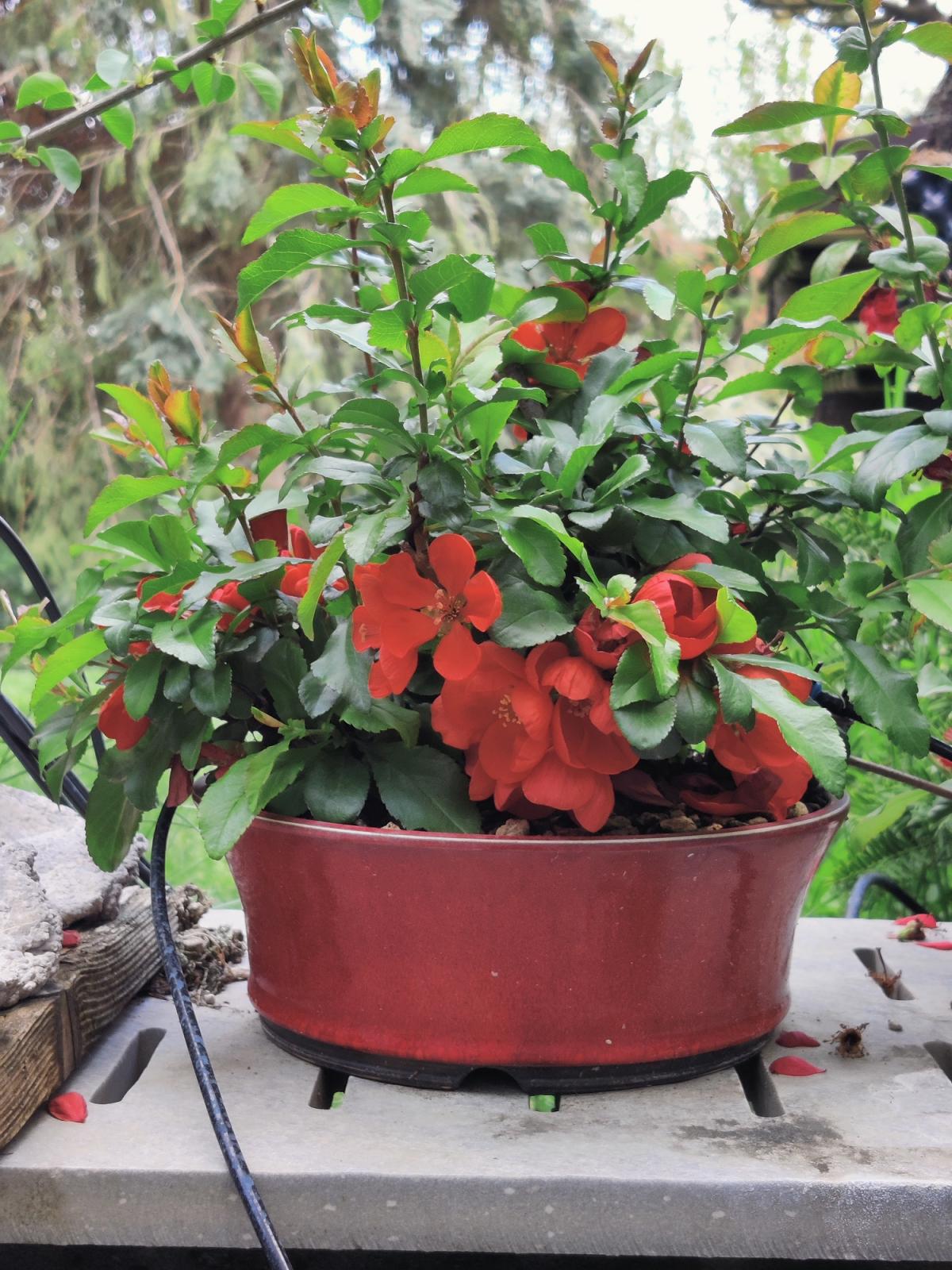 et pour le pot rouge, je trouve qu'il est vraiment super! si ton but maintenant est de faire de la fine ramification pour densifier ton arbre ce pot ira très bien en contraste avec la forme globale de l'arbre en arrondie/convexe et le pot concave et également le rappelle de rouge du pot avec les fleurs rouges!