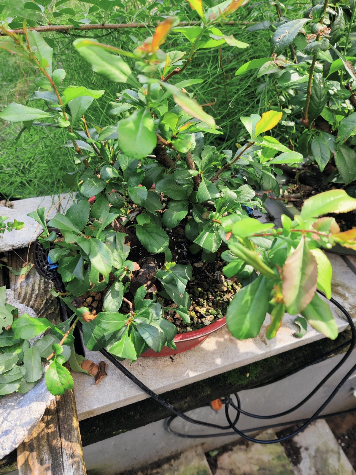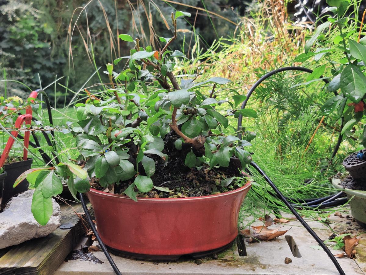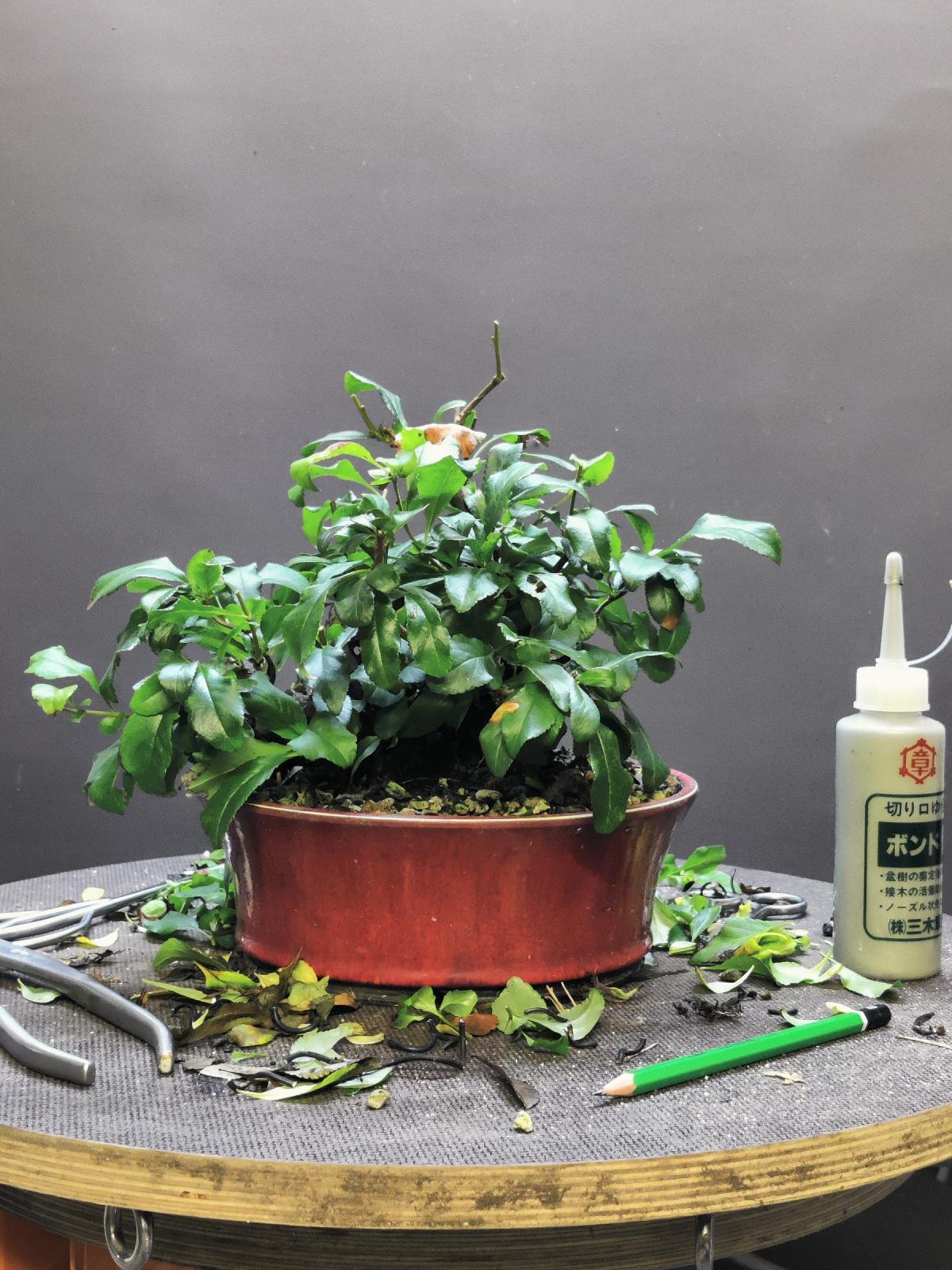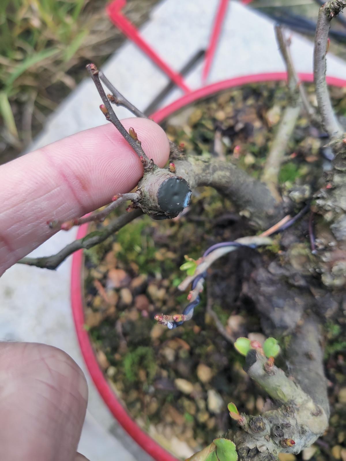et pour le pot rouge, je trouve qu'il est vraiment super! si ton but maintenant est de faire de la fine ramification pour densifier ton arbre ce pot ira très bien en contraste avec la forme globale de l'arbre en arrondie/convexe et le pot concave et également le rappelle de rouge du pot avec les fleurs rouges!