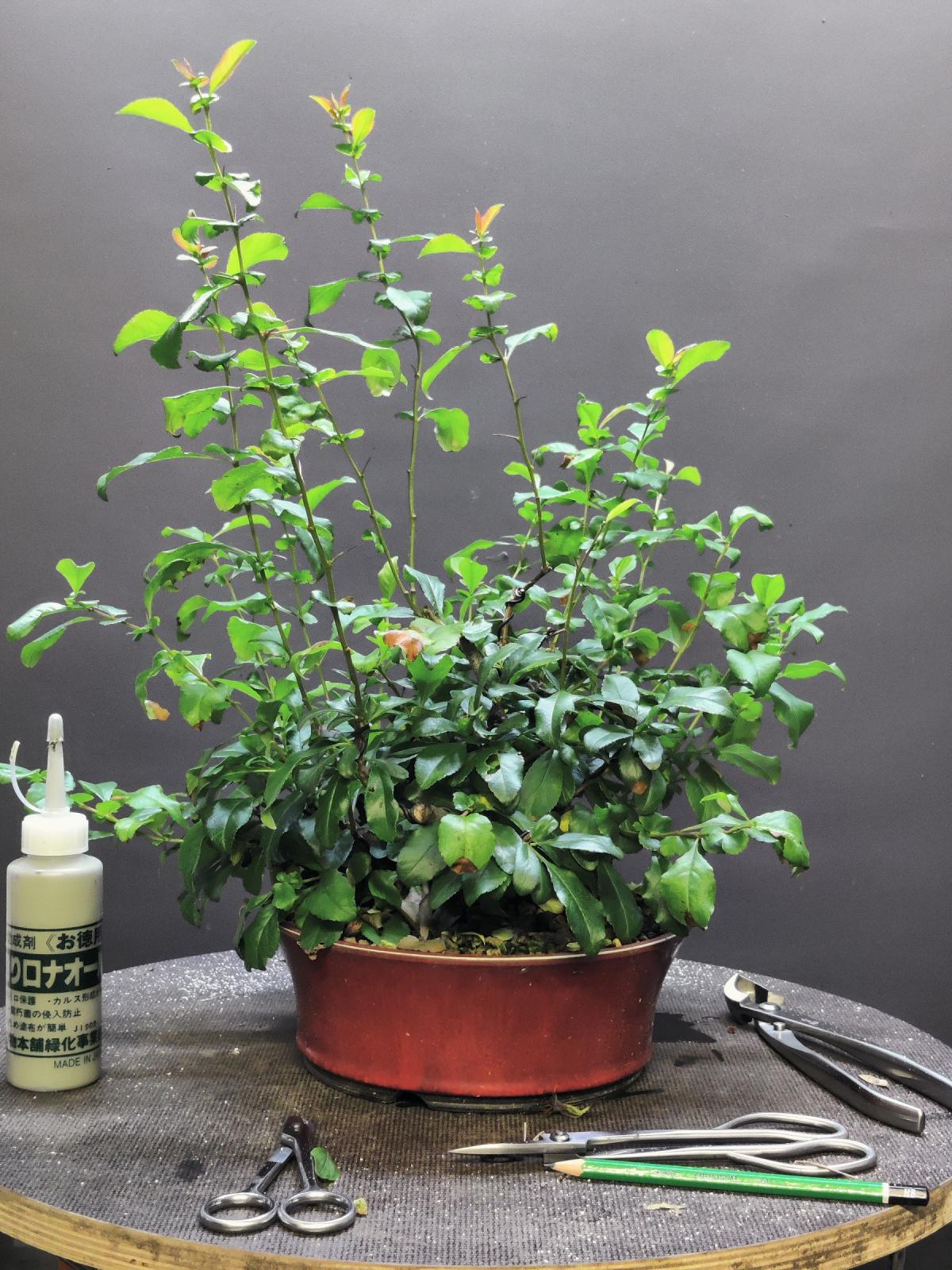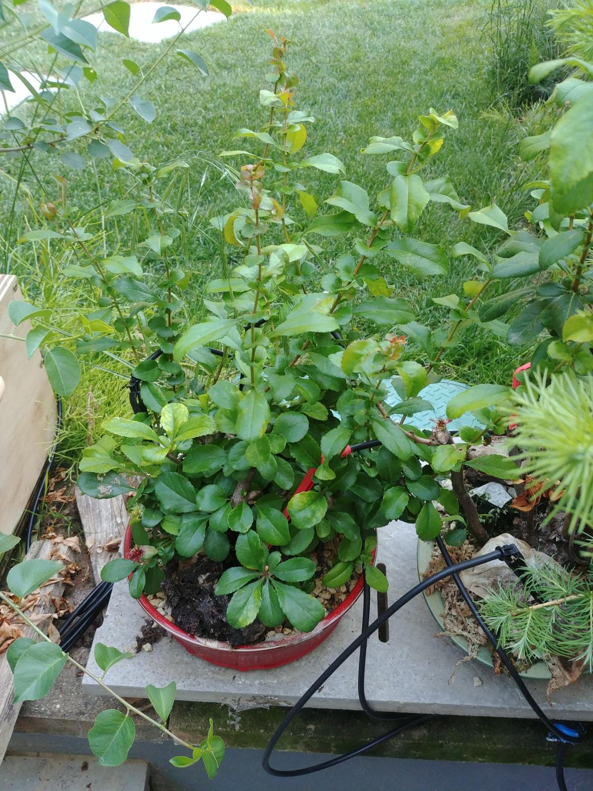Je n'ai toujours pas trouvé la bonne équation pour faire ramifier durant la saison. Autant la réaction à la taille de décembre était bonne ama, autant les tailles en verts ne produisent que de nouvelles pousses à partir du bourgeons terminal, bon comme sur pas mal d'arbres vous me direz. Donc difficile de ramifier. Je vais le laisser tranquille et revenir dessus cet hiver, peut être tenter un défoliation totale l'année prochaine, on verra. Si certains d'entre vous mènent avec succès cette espèce, vos recommandations m'intéressent !