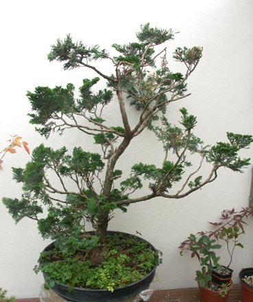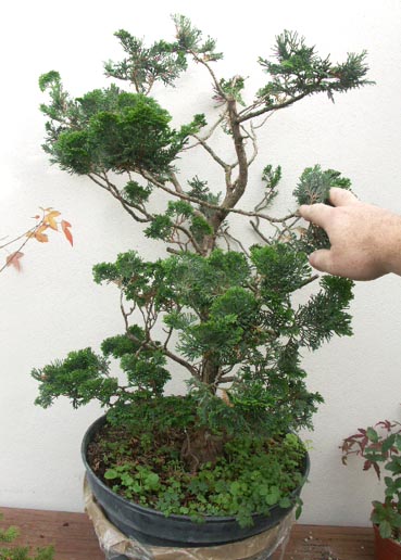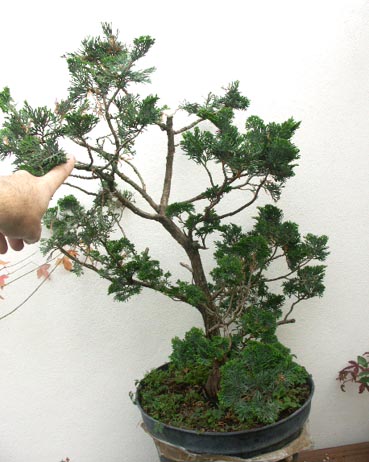 Une autre option serait de garder toutes les branches que tu as, redresser celle qui est le plus en haut pour refaire une cime, et travailler les autres pour faire de jolis plateaux.