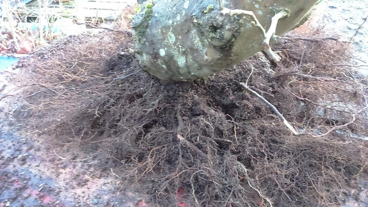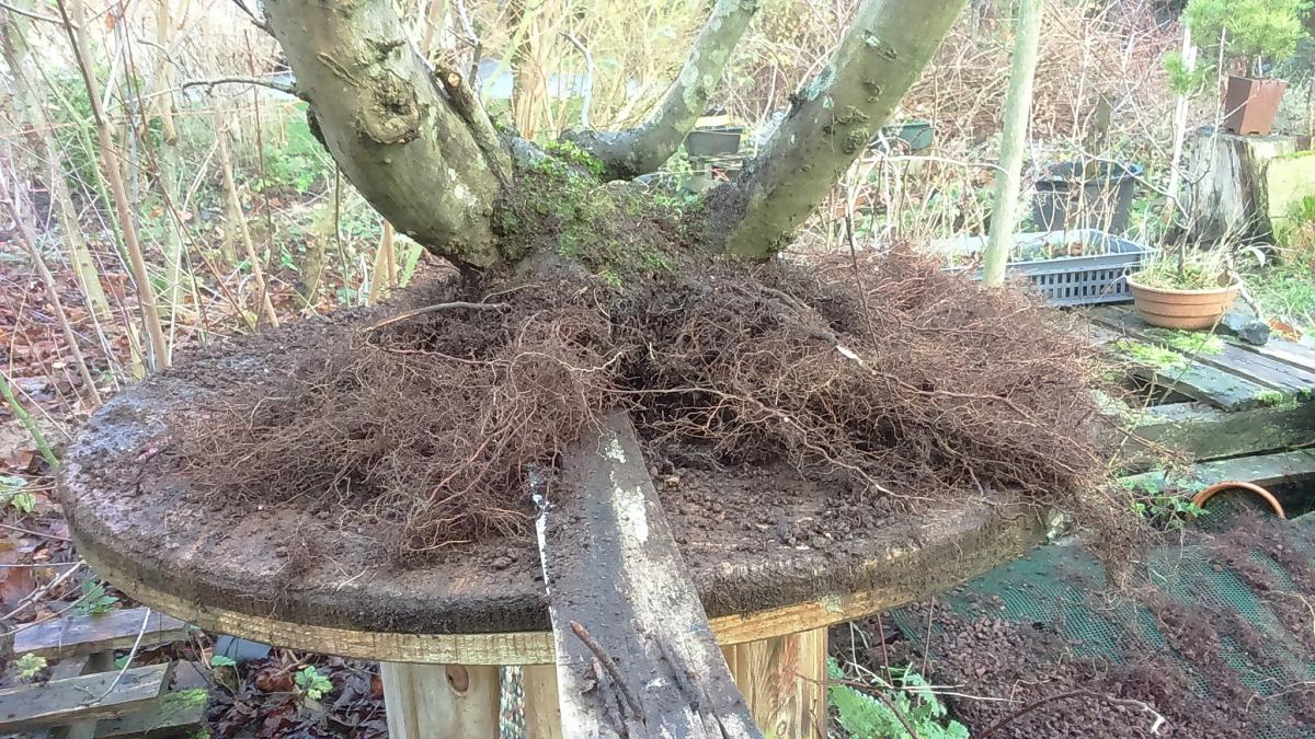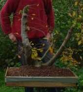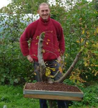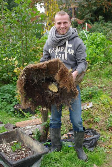 bon voilà, après 1h30 de travaille, la bête est dans sa cage, avec wam on va rentrer se mettre au chaud et boire une bonne ch’ti, une bonne mousse de chez nous, ça se mérite!!! je pense que l’arbre avec sa motte, à laquelle on n’a pas trop toucher, tourne autour des 15kg, autant dire que dans sa caisse de bois, avec le substrat, ça pèse un âne mort, celui là, je ne vais pas le promener partout.