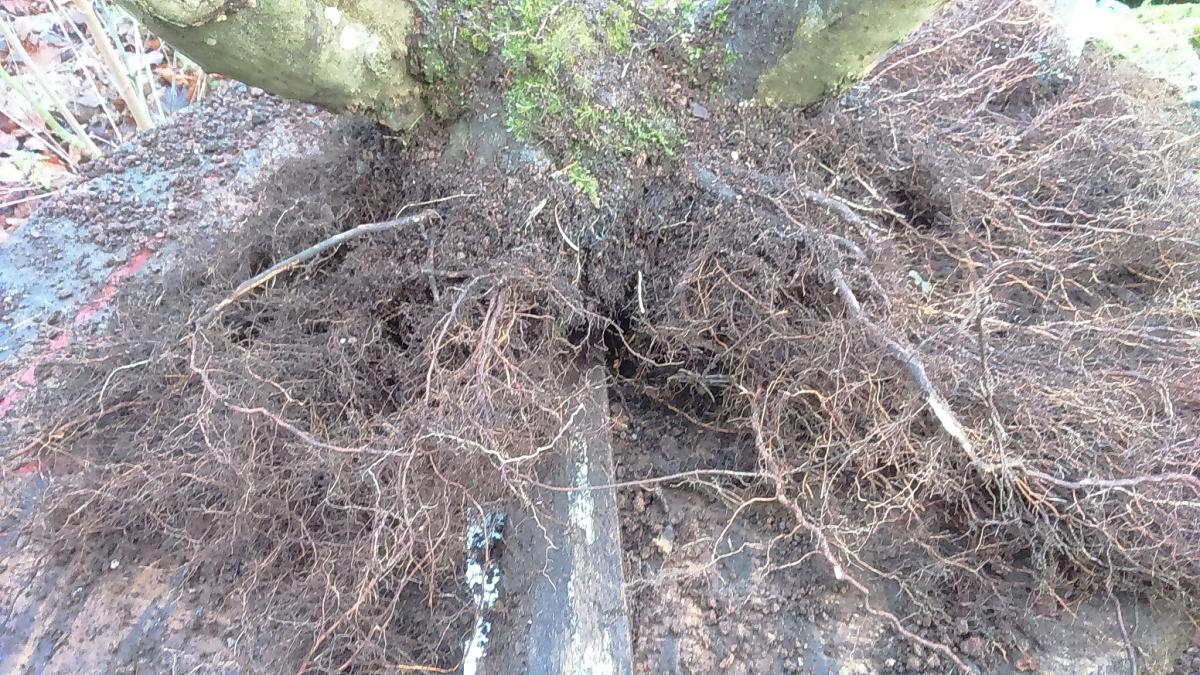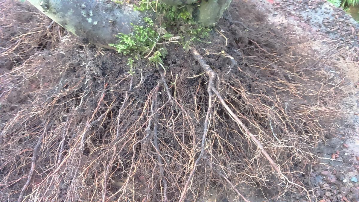 un petit bidouillage maison, un cadre de lattes fixées à l’arbre, dessus des ardoises et tout le tour des plinthes de bois de 10 cm, pas d’autres solutions pour les racines que de s’étaler…