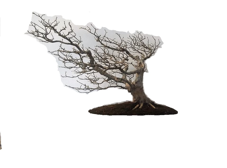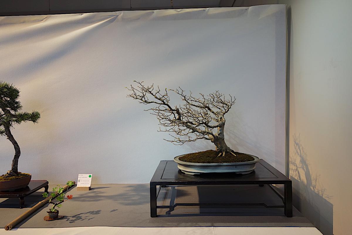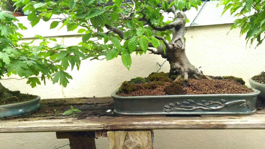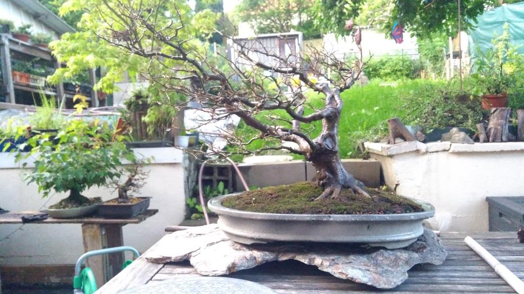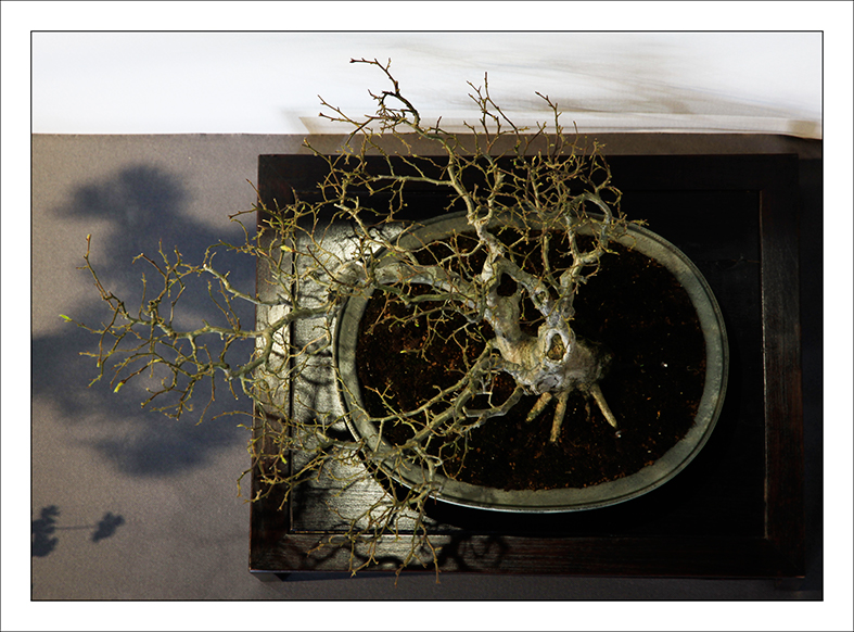 Le profil du sol, sur ta présentation actuelle, est très intéressant : relevé un peu plus à droite. Je crois que je l’accentuerais un peu plus et bascule de l’arbre. La position dans le pot aussi, je l’aurais accentuer vers la droite.