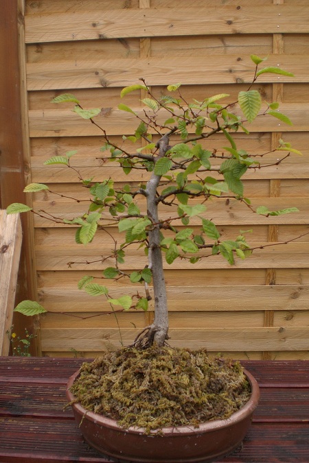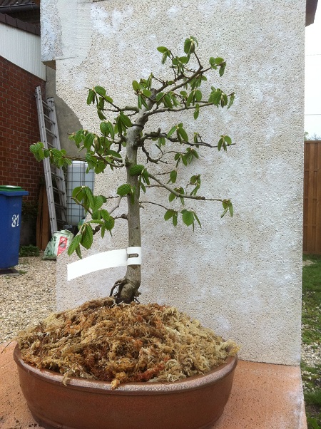 Le voici maintenant. Je l’ai défolié pour qu’on voit un peu plus sa structure. Je l’ai laissé poussé, car je compte le marcotter l’année prochaine. Ai-je bien fait ou faut-il que je le taille et le laisser pousser l’année prochaine? Il a de mauvaises racines qui plongent profondément. J’ai dû faire un mont d’akadama pour couvrit un maximum de racine. J’ai recouvert le pot de sphaigne pour maximiser la protection des racines…