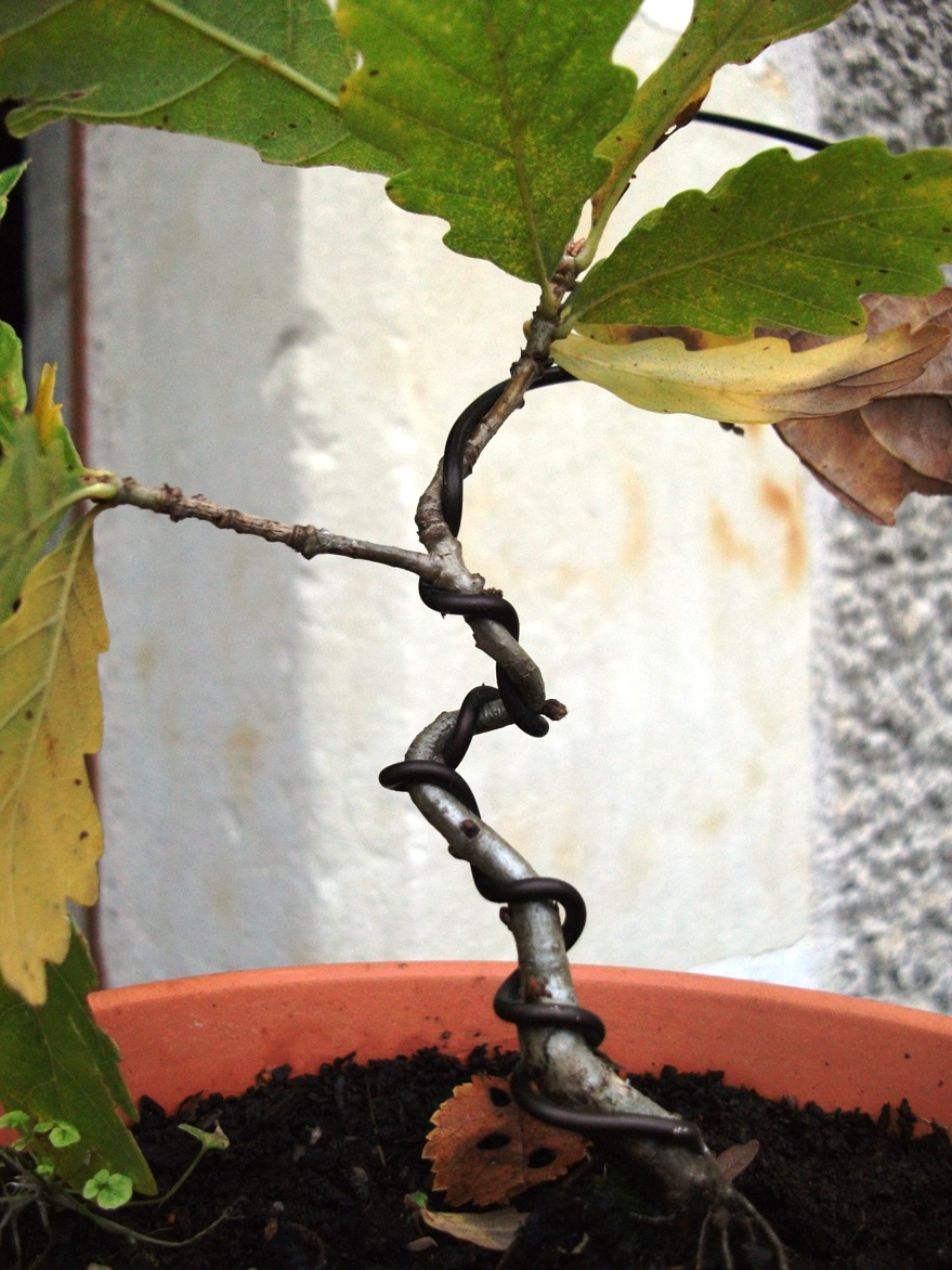 …un jeune semis de 2/3 ans…une ligature franche pour donner un peu de mouvement au tronc. La cime sera remise +/- dans l’axe du tronc