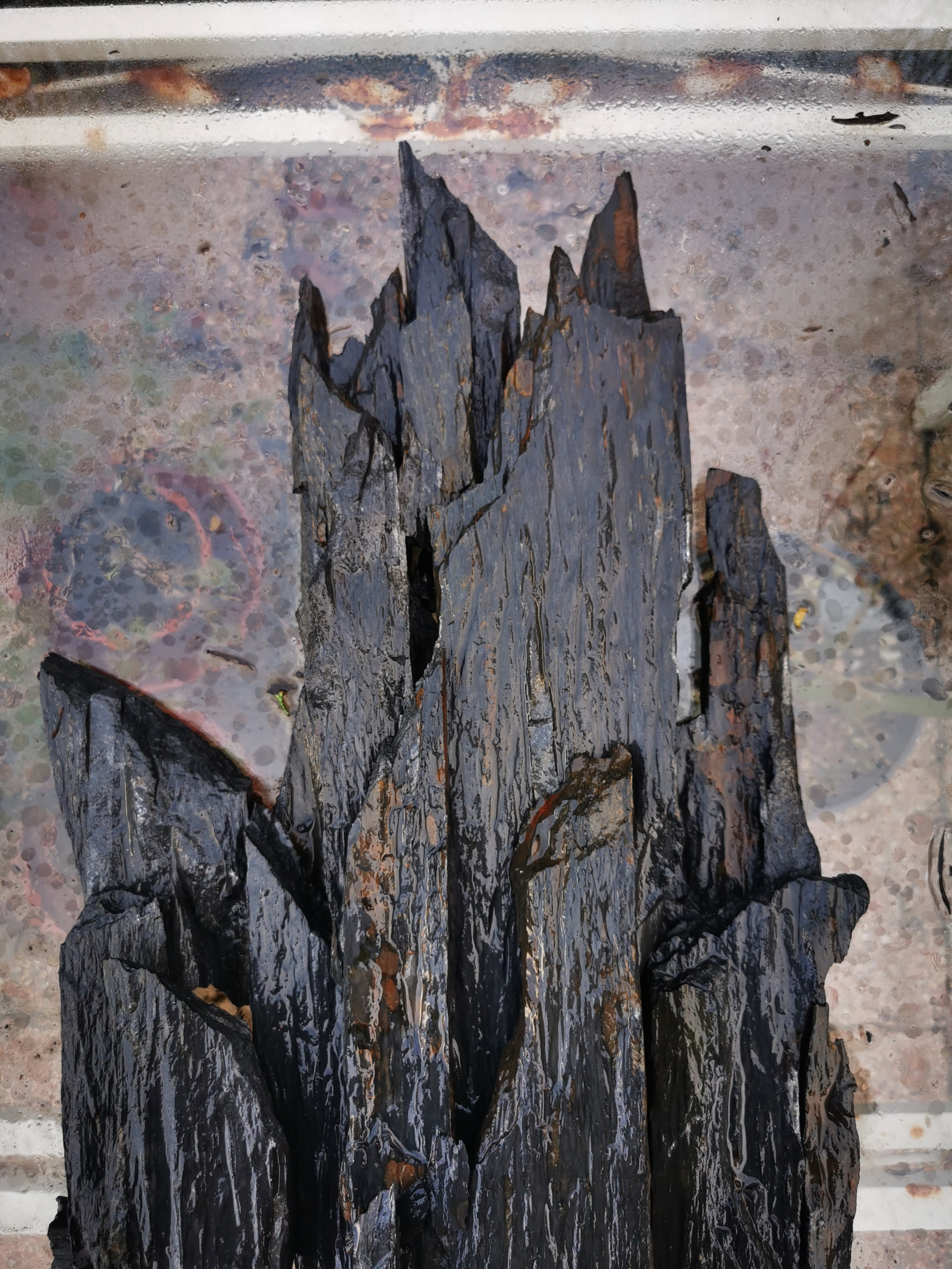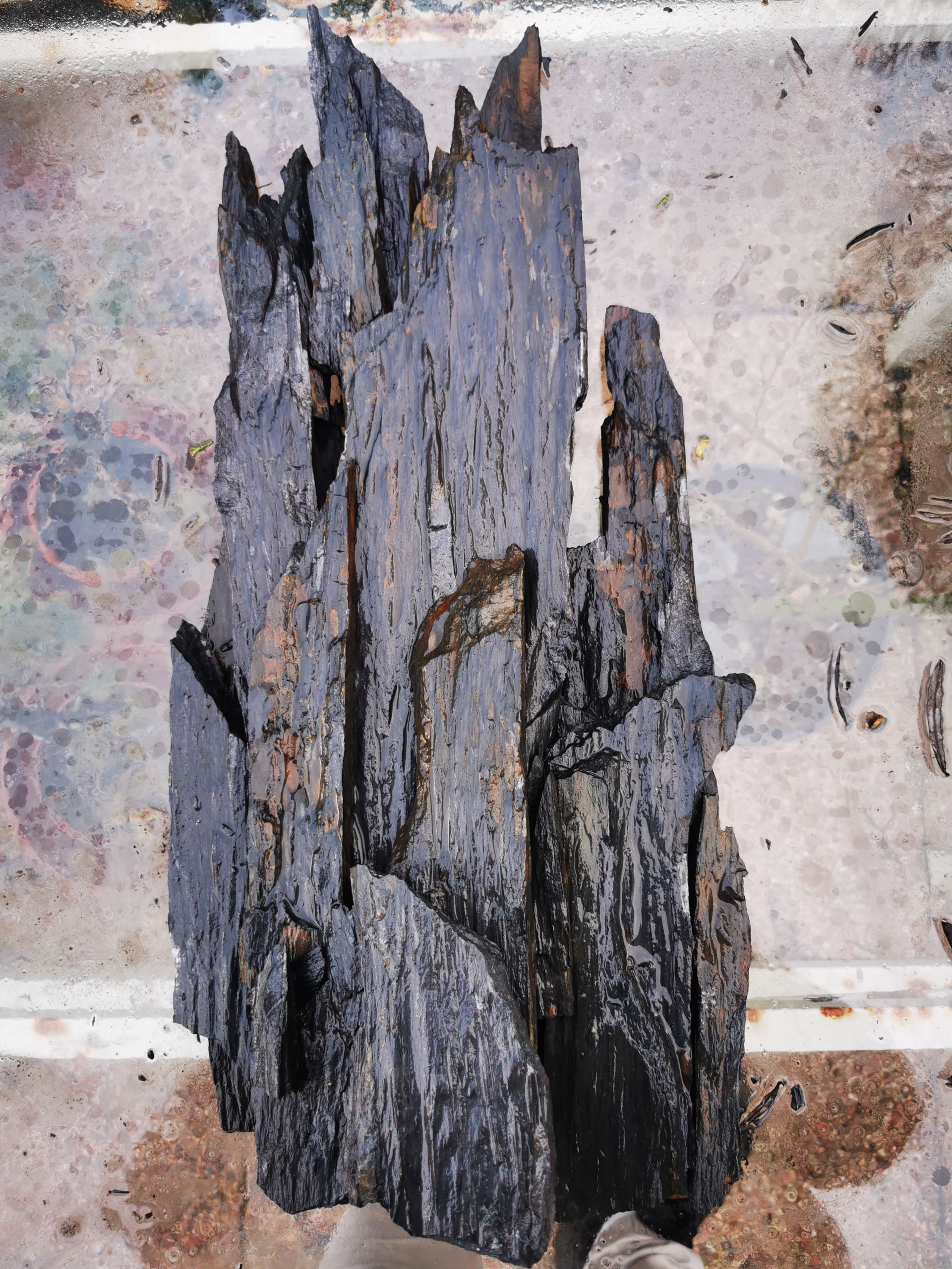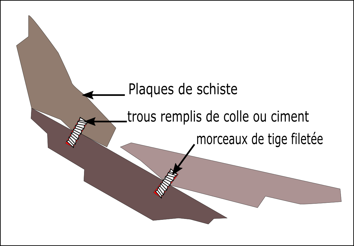 Attention à l’inconvénient du schiste, matériau à structure lamellaire, dont les collages entre plaques ne tiennent absolument pas sous un moindre effort, quelque soit la colle, époxy aussi bien que ciments divers.