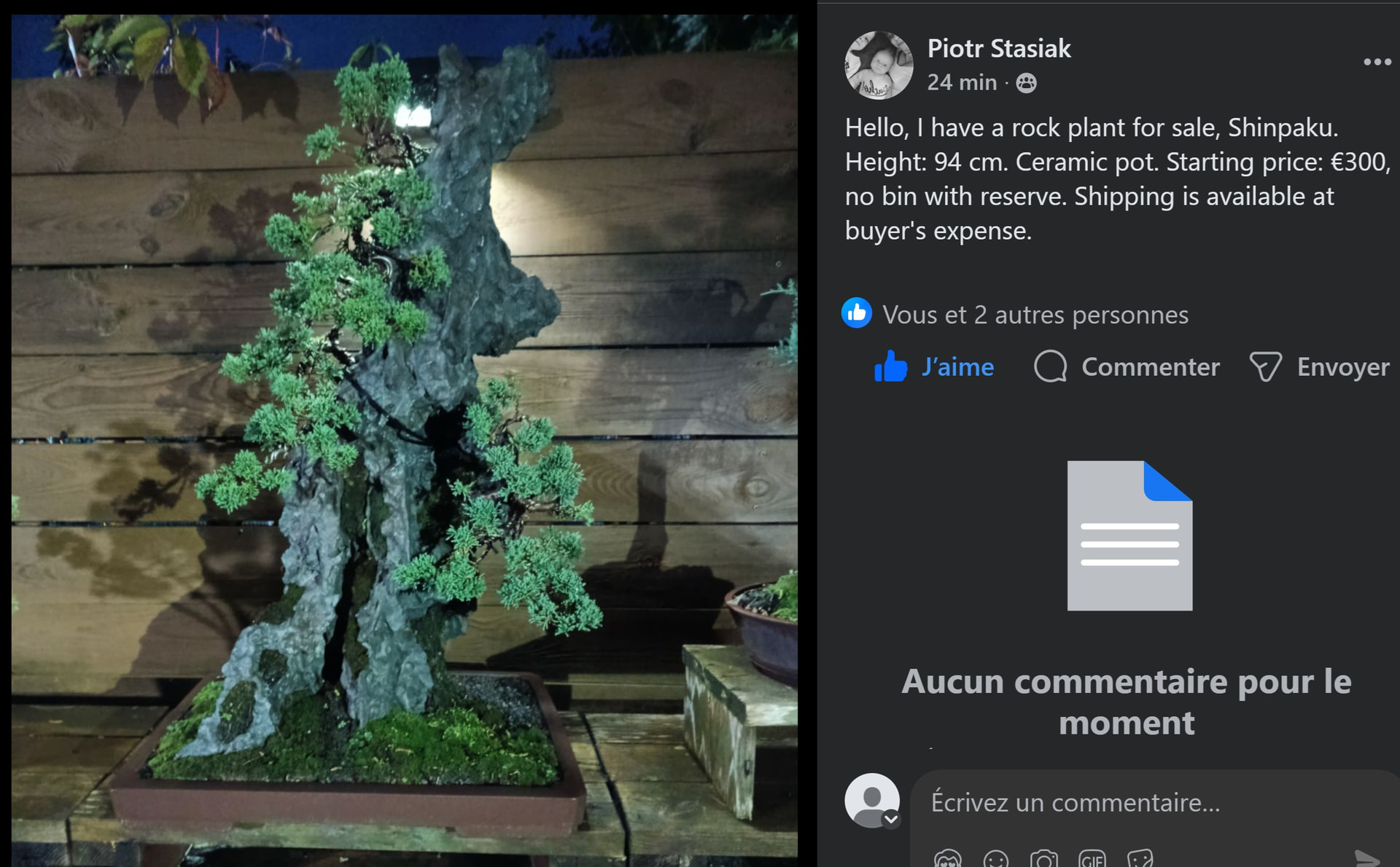 Si il s’agit de la composition de Piotrs Stasiak dont il est question je range mon avis tranché. Mais même pour une pierre artificielle avec deux junip dessus 1900€ ça reste une très très jolie somme, je préférerais investir cette somme dans un ou deux jolis yamadori. Et en effet @hin175 chacun est libre d’acheter ce qu’il veut au prix qui lui va.