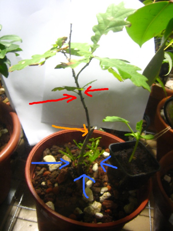 a la base du tronc et sous terre (flèches bleu), qui poussent très vite (branches et feuilles).
