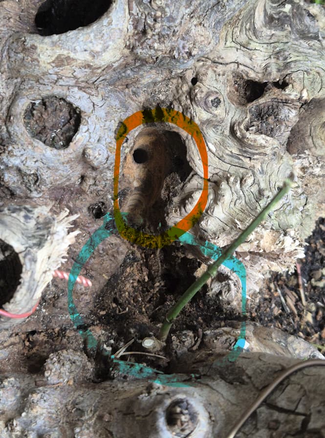 Hier j’ai creusé / aspiré / xylophénisé les cavités. Celle où je voudrais planter un plan était en partie vermoulue (bleu)