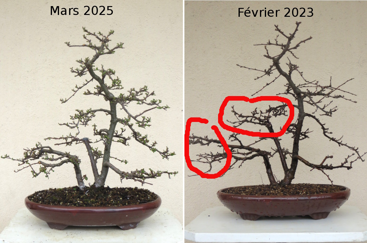 C'est une forme à deux troncs qui en paraît trois. Le troisième, un peu raide, se positionne au milieu dans la vue de face . De fait, c'est une branche très basse qui est plutôt orienté vers l'arrière.