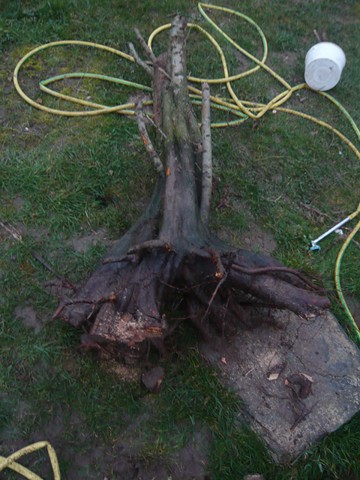 Ouf, a yé et suis vanné… Jviens de prélever avec une patite scie pliante,une bêche et des petits outils à main quelque chose qui une fois sortie est devenu beaucoup plus gros que ce que jmimaginais du premier regard quand j’ai flashé sur ses cannelures… Bref place au photo… et pourvu qu’elle reprenne (suis pas certain).