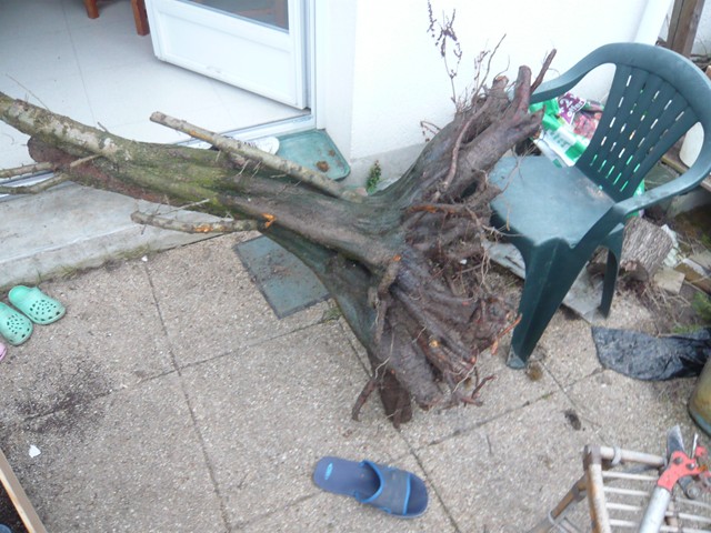 IL y a eu du dégât dans la bataille, une terre glaiseuse qui pesais bien le poid de l’arbre entre les racines, donc obliger de l’enlever avant le retour, avec certainement quelques precieuses radicelles dans les mottes.