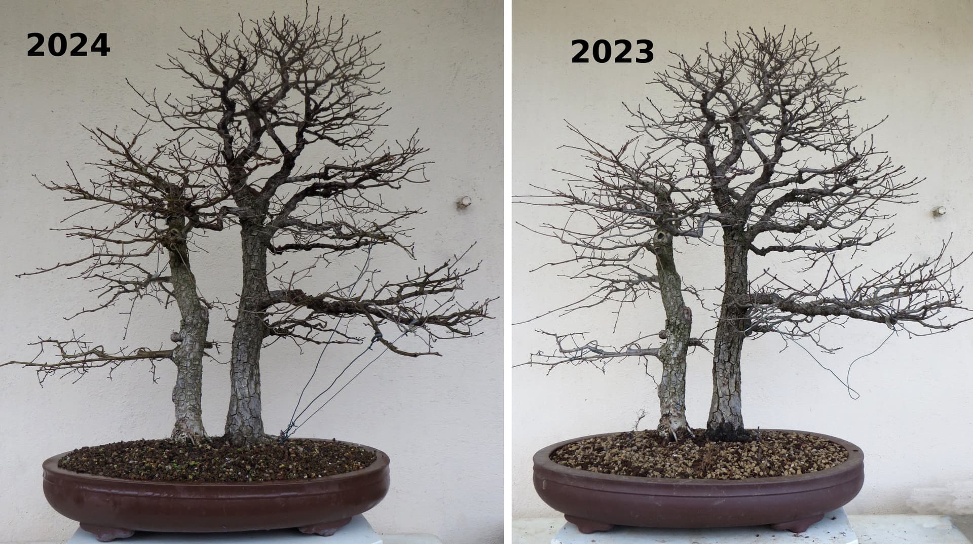 Le dernier rempotage avec repositionnement des deux arbres l’un par rapport à l’autre date de 2023 !! voir ici.