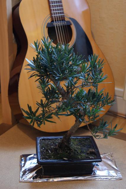 Voilà mon bonsai, un podocarpus maki (selon l’étiquette et un livre sur les différents bonsaï)