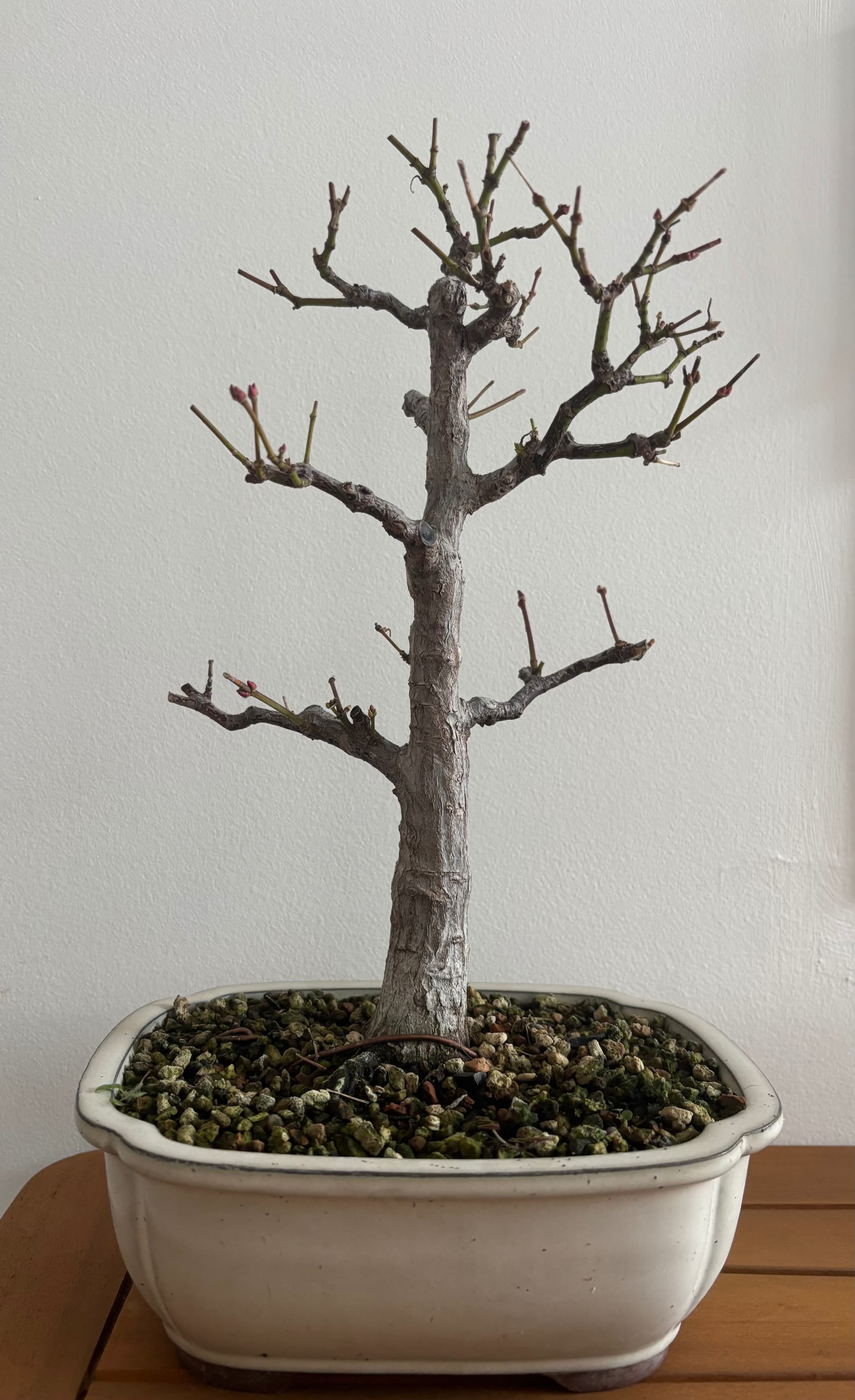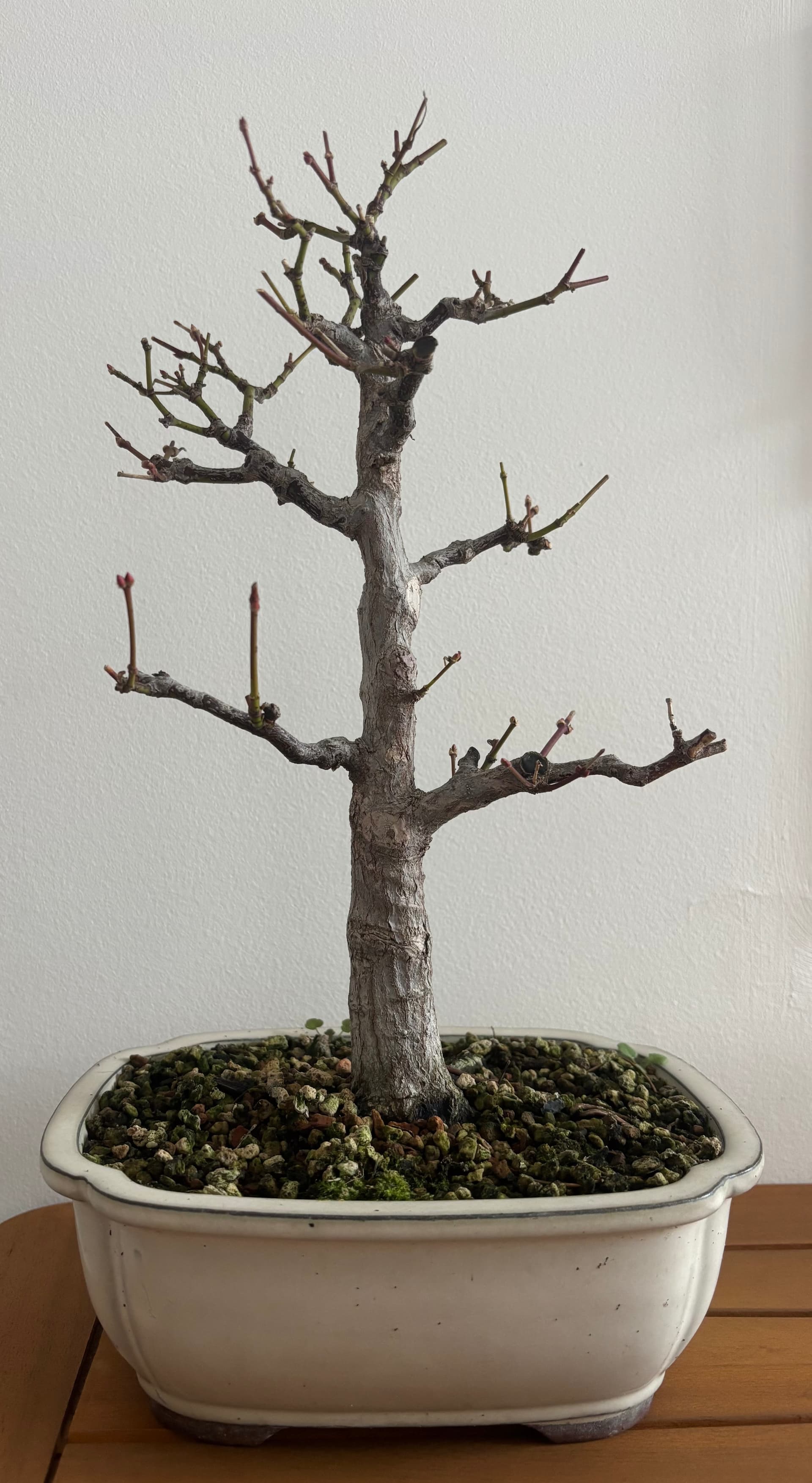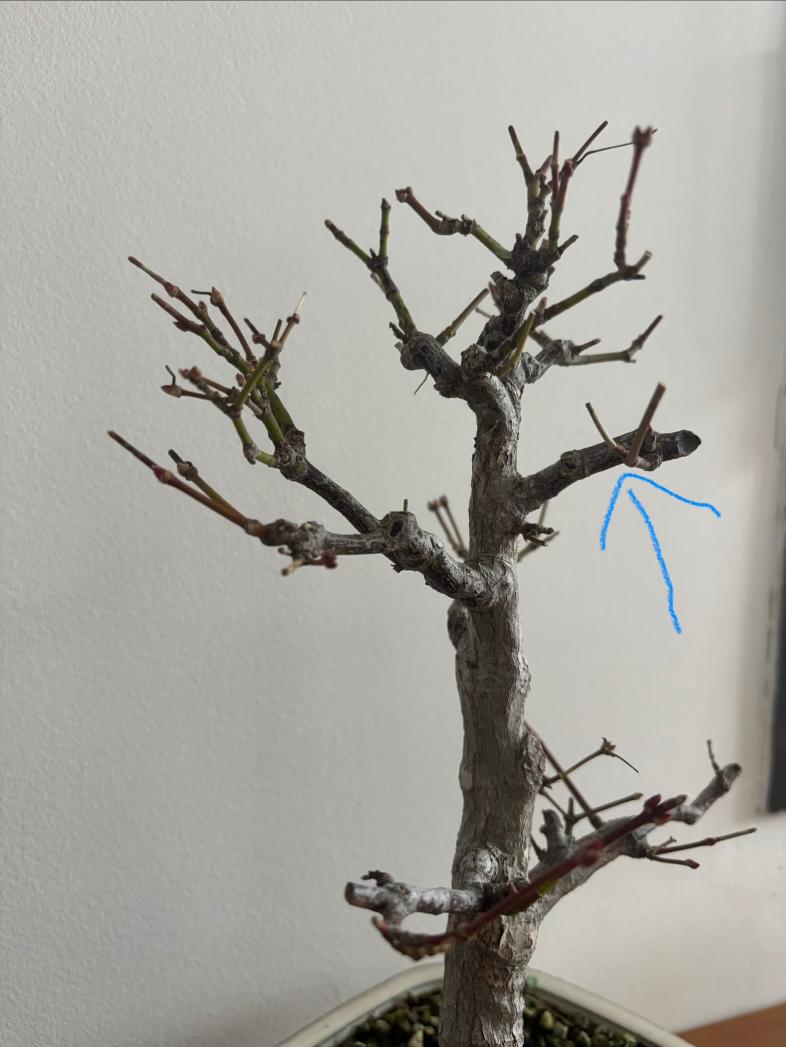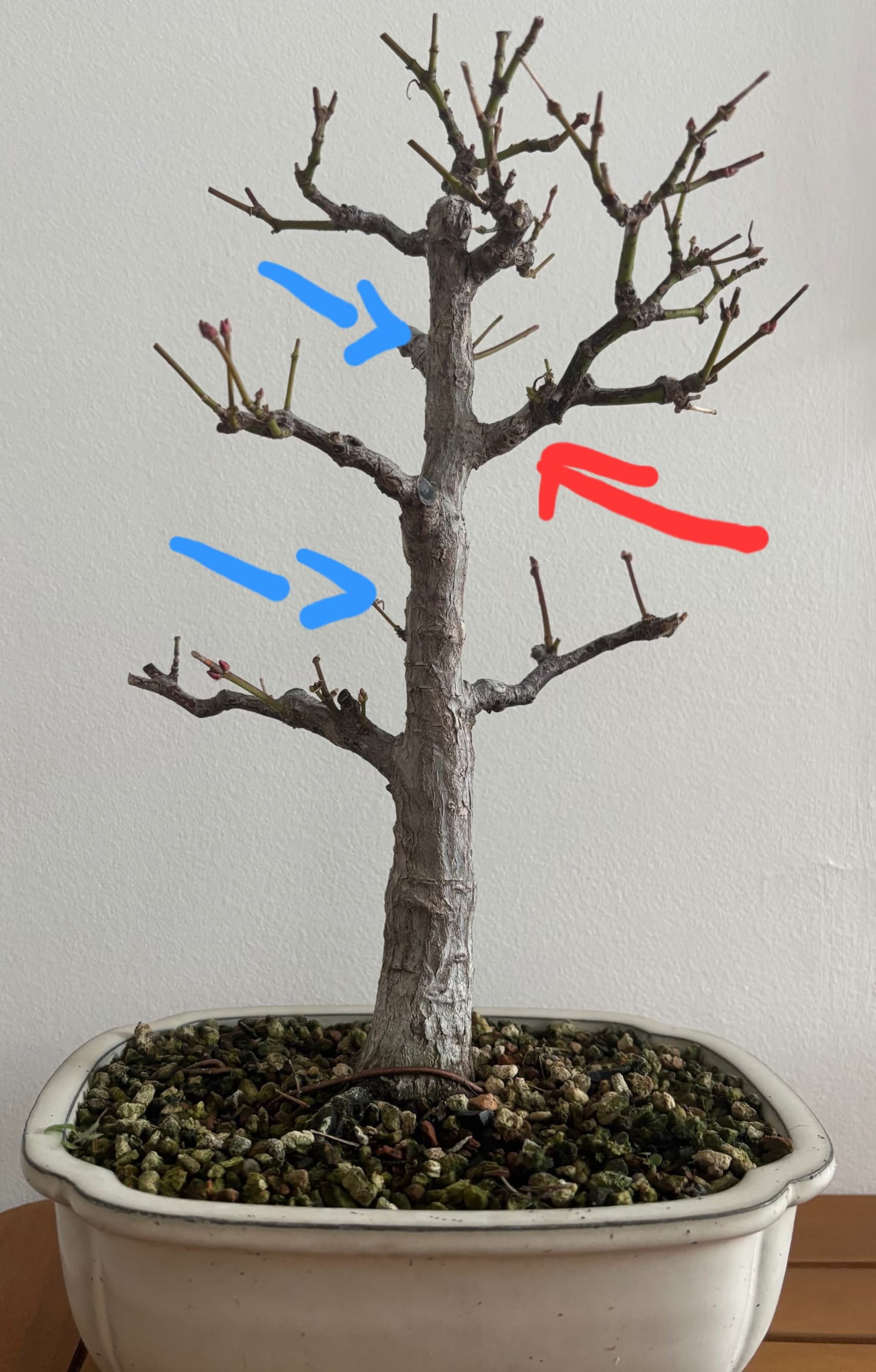 Perso ce que je ferais c’est de le mettre dans un pot plus large et plat pour faire tirer les racines et les branches. Et j’essaierai juste de bien calmer la branche la plus développée (flècherouge) le temps de développer la ramification des branches basses. Pareil pour les branches du sommet
