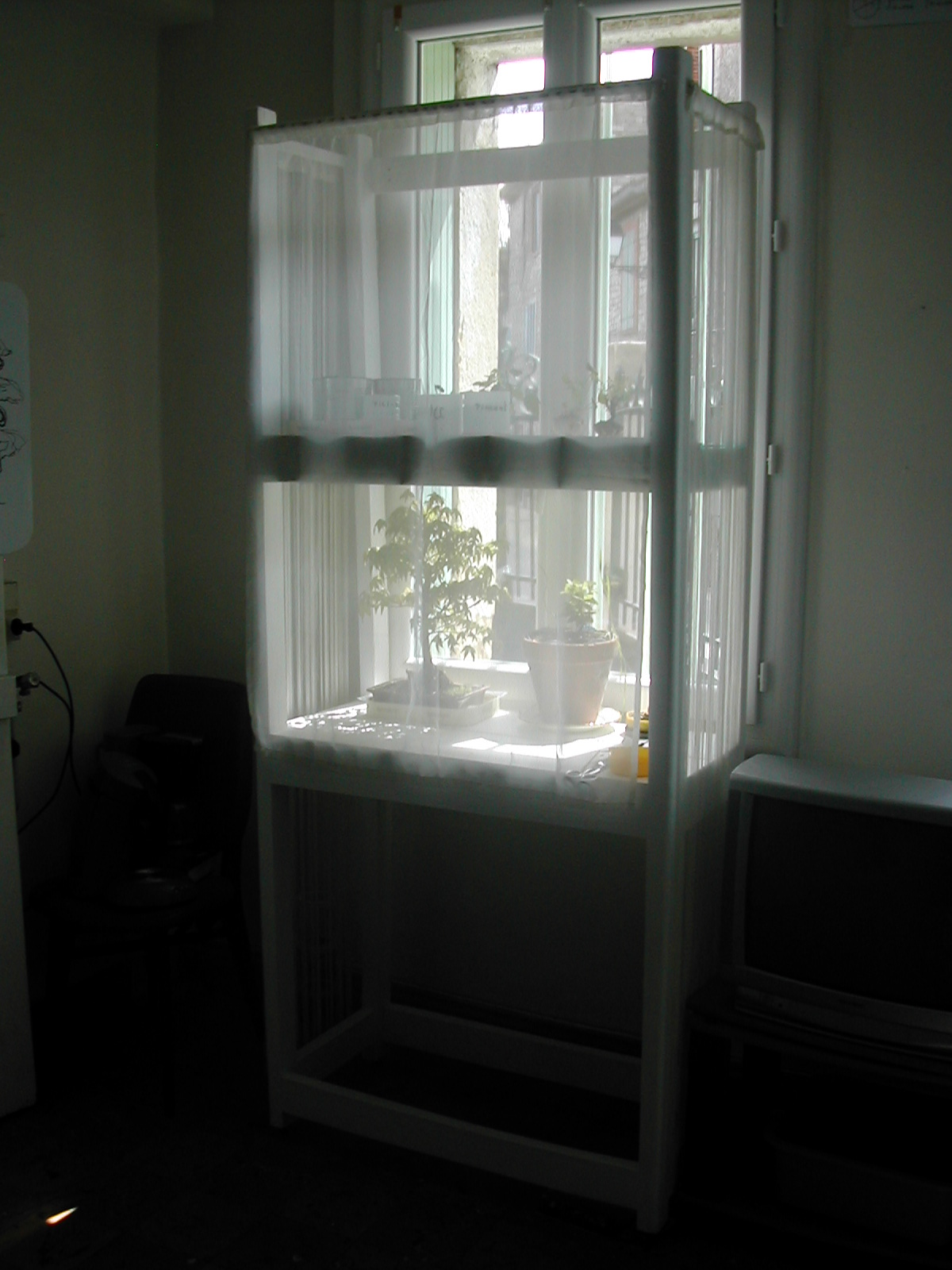J'ai donc fait cette étagère à roulette (pour pouvoir accéder à la fenêtre quand même) j'ai enlevè les rideau de la fenêtre et les est mis sur l’étagère :