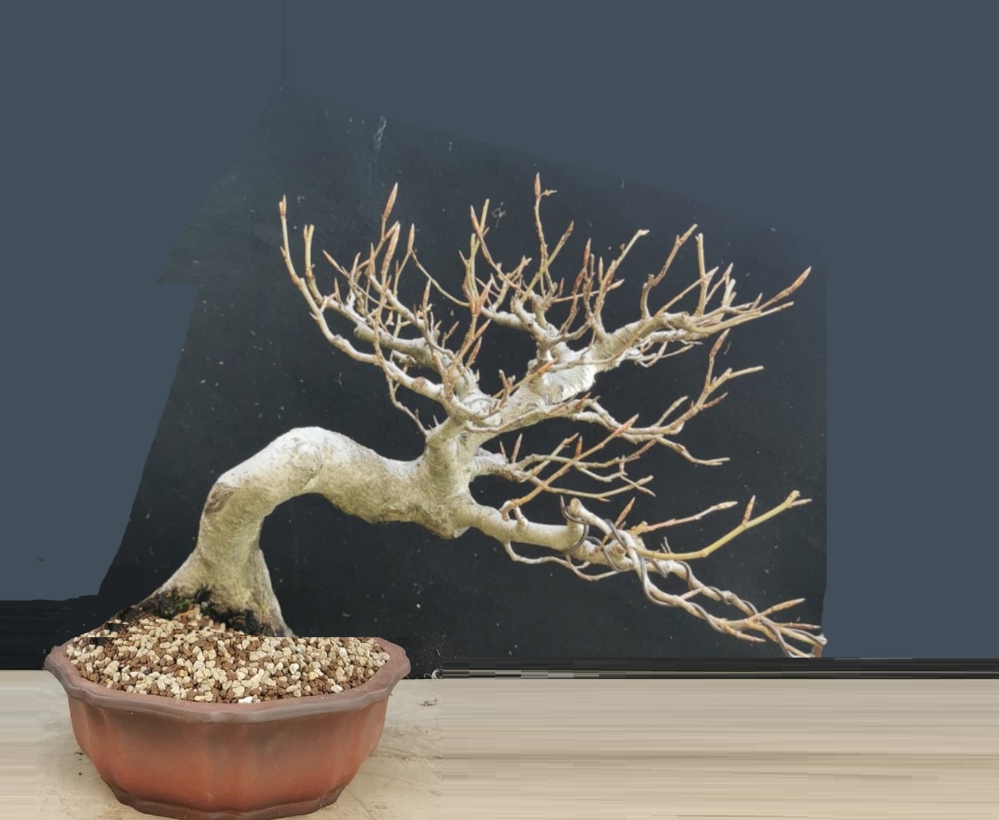 Oui c’est bien ça, le racinaire ne me laisse pas beaucoup de marge de manœuvre, une très grosse racine qui est le prolongement du tronc file sur la droite, je n’ai pas pris le risque de la rogner car elle porte beaucoup de racines et que je n’ai pas trop envie de lui mettre un coup derrière les oreilles. Ç’est quasi impossible de redresser cet arbre vers la gauche, le racinaire ne suit pas, la seule possibilité qui m’a été donnée c’ est le redresser vers l’arrière.