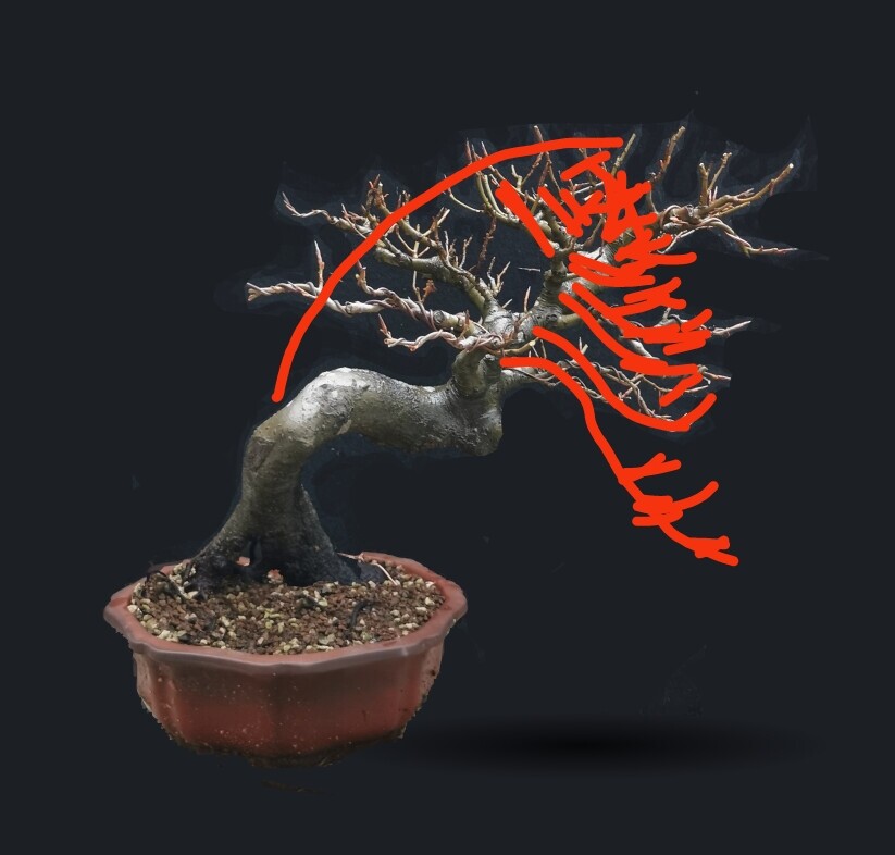 J’y avais pensé il y a quelques temps, ça pourrait très bien être une ligne de conduite pour mener cet arbre, cela amène une dynamique différente à l’arbre, peut être plus de légèreté à l’ensemble. Cela pourrait faire grincer des dents les puristes, l’arbre commencerait avec une branche arrière, moi ça m’en toucherai une sans faire bouger l’autre
