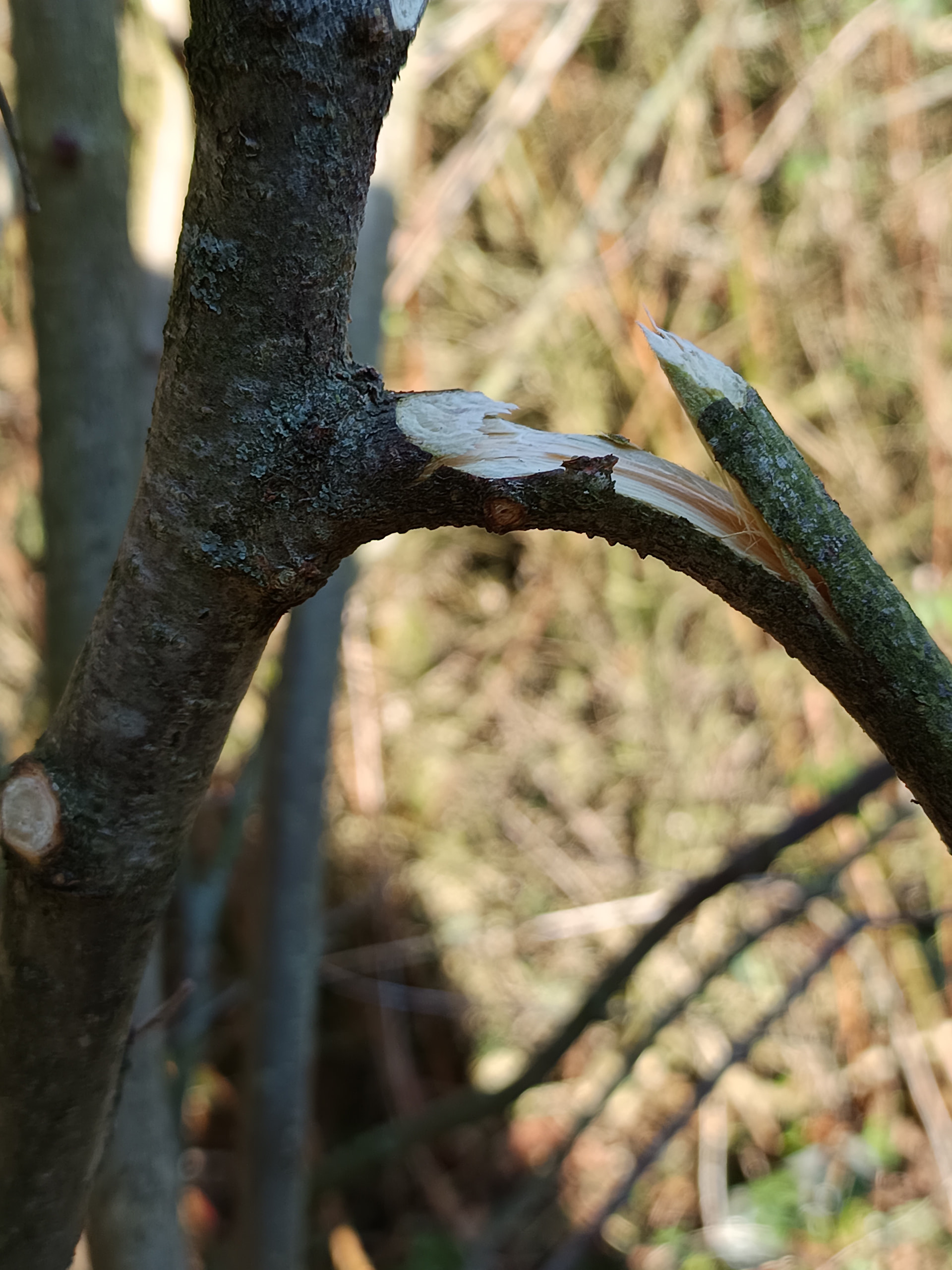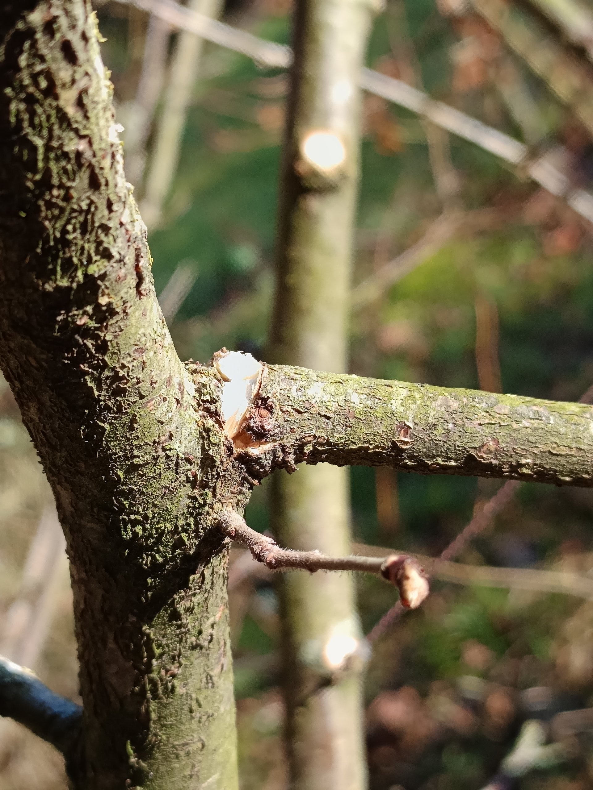Pour la seconde branche, je la prends à pleine main le plus possible à sa naissance contre le tronc et je tords vers le bas, la branche s’arrache légèrement du tronc
