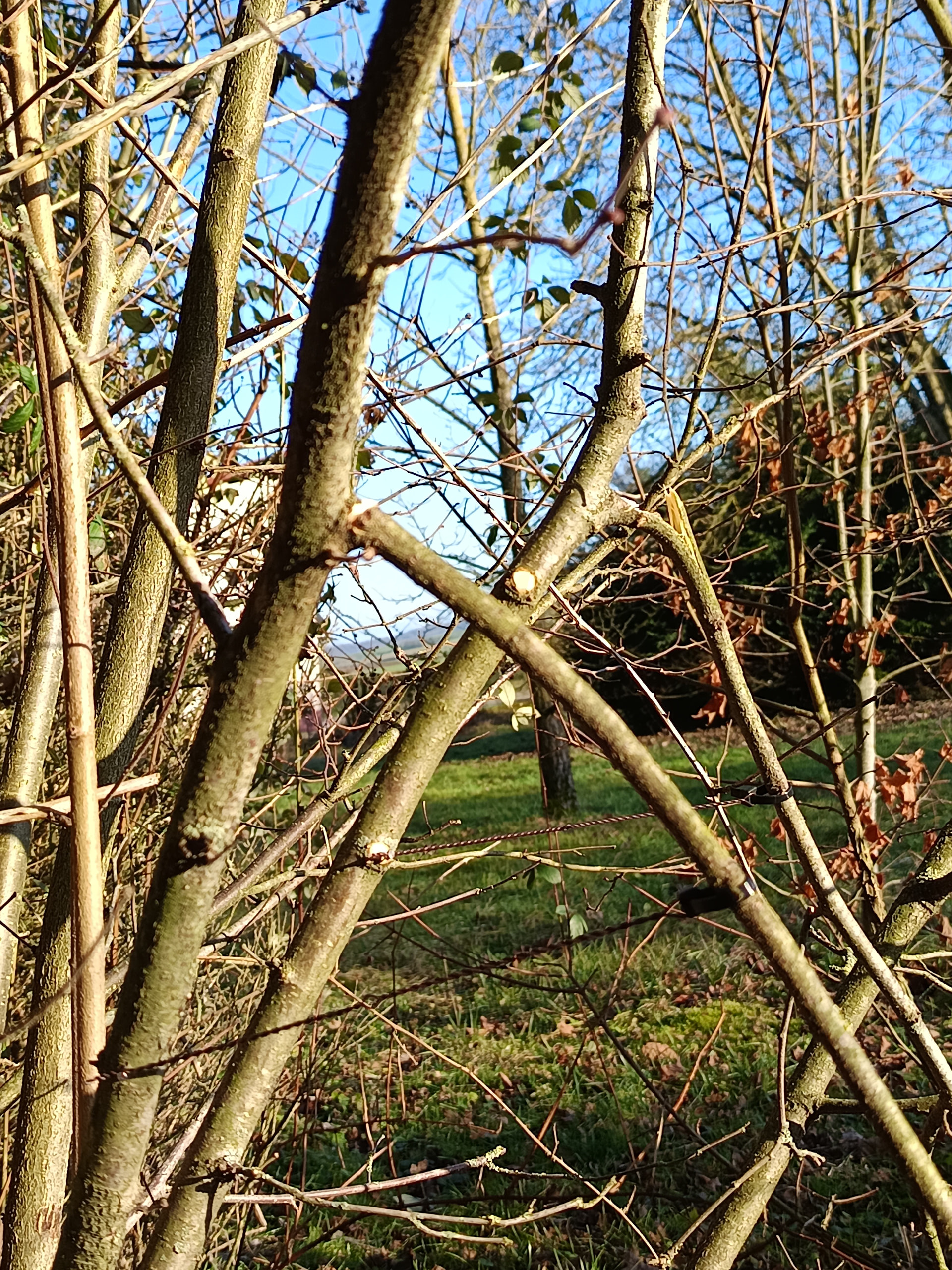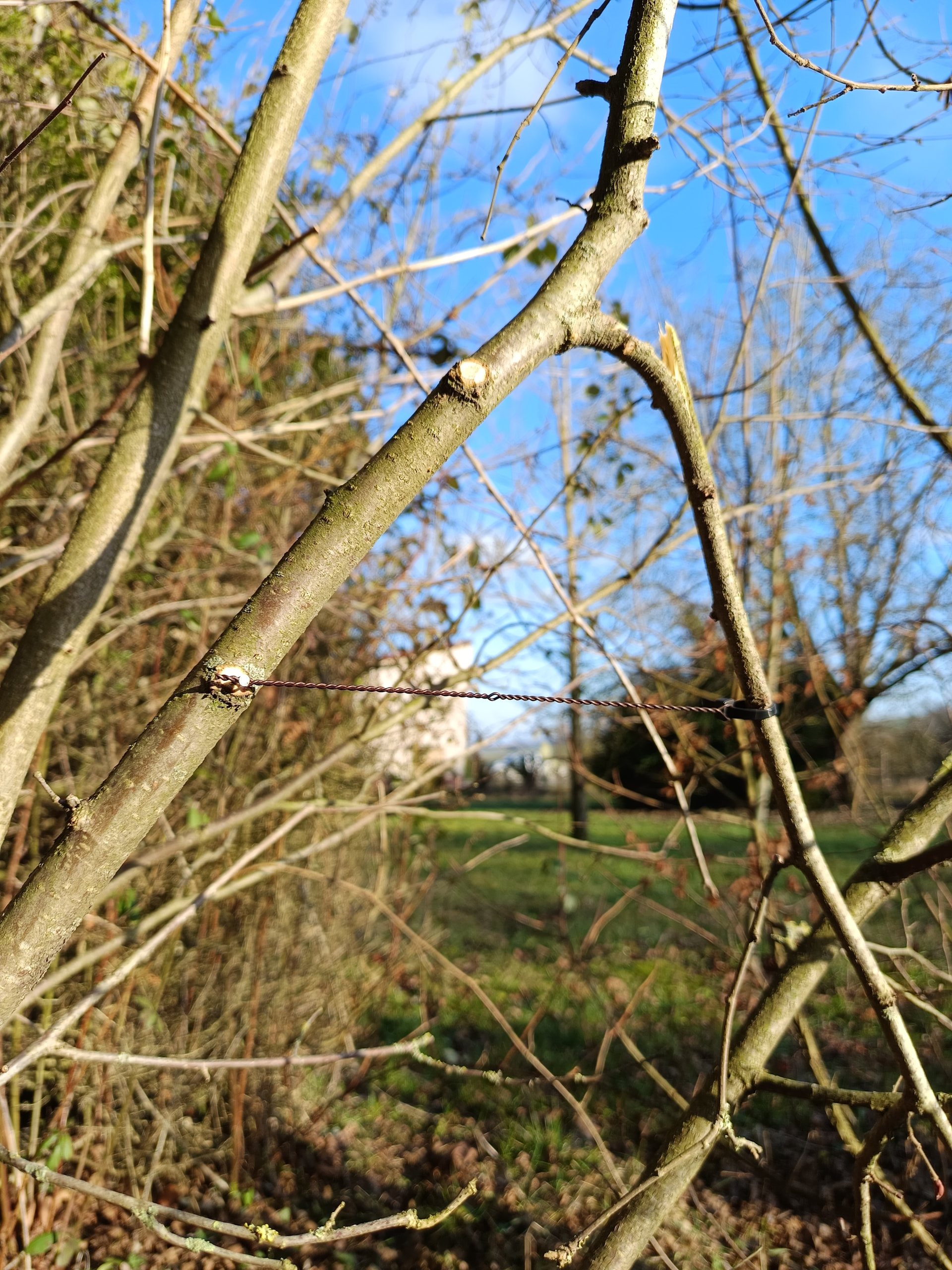 Comme tu l’as vu, j’ai abaissé une branche de 3 cm de diamètre de 90° avec un fil de cuivre de 1 mm et 1 serre câbles plastique comme ancrage sur la branche, ce qui permet de ne pas la blesser et de lui permettre de grossir sans marque jusqu’à cicatrisation et fixation de l’abaissement