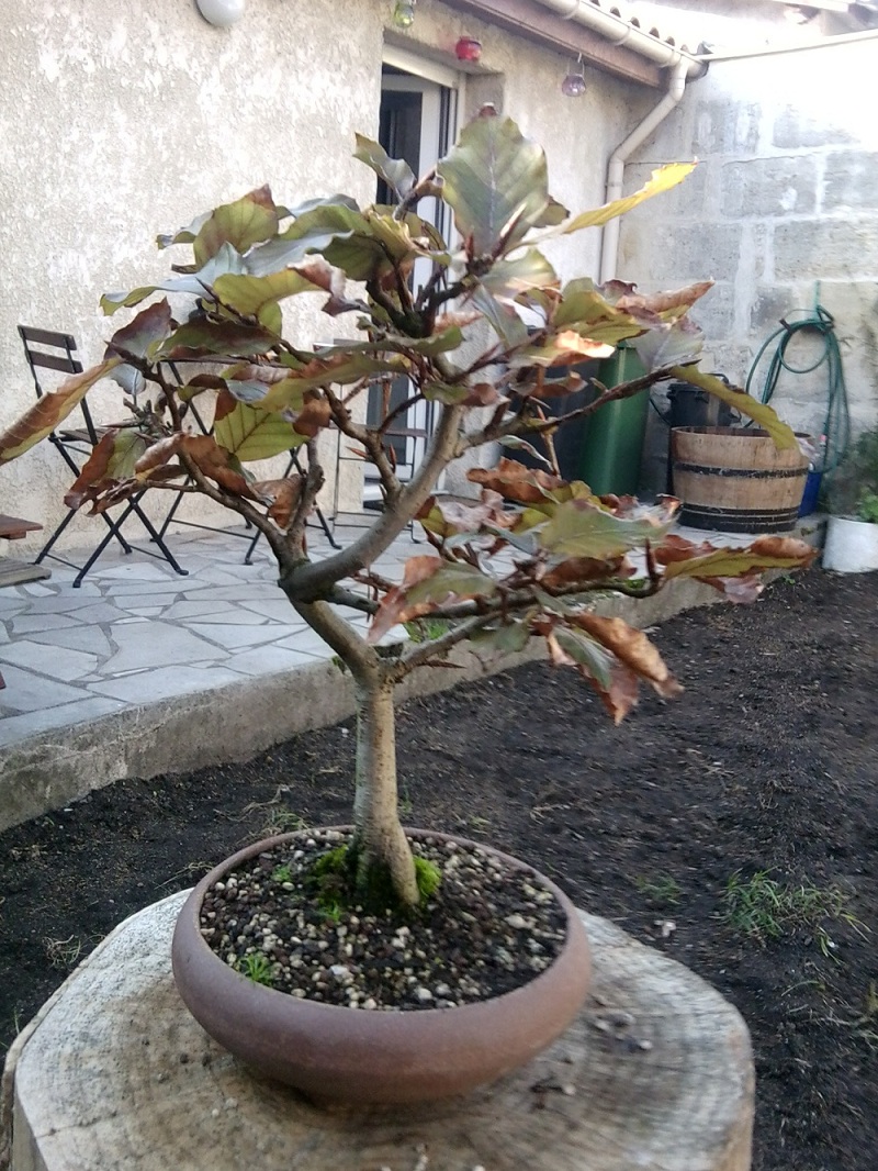 Bonjour, je viens d’acquérir un hêtre commun de 7 ans. Je débute dans l’art du bonsai. A ce jour je possède un petit orme de chine, une pseudo forêt de carmona, une dizaine de plants de pépinières en pleine terre afin d’obtenir des troncs convenables et ce petit hêtre. Je vous joint quelques photos (désolé pour leur qualité médiocre) dans l’espoir d’obtenir quelques conseils quant aux soins et interventions nécessaires.