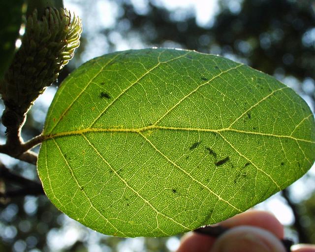Ses feuilles simples de 3 à 5 cm sont persistantes sur l’arbre pendant deux à trois ans. Elles sont coriaces, ovales, à dessus vert luisant et dessous blanchâtre à bord lisse ou denté.