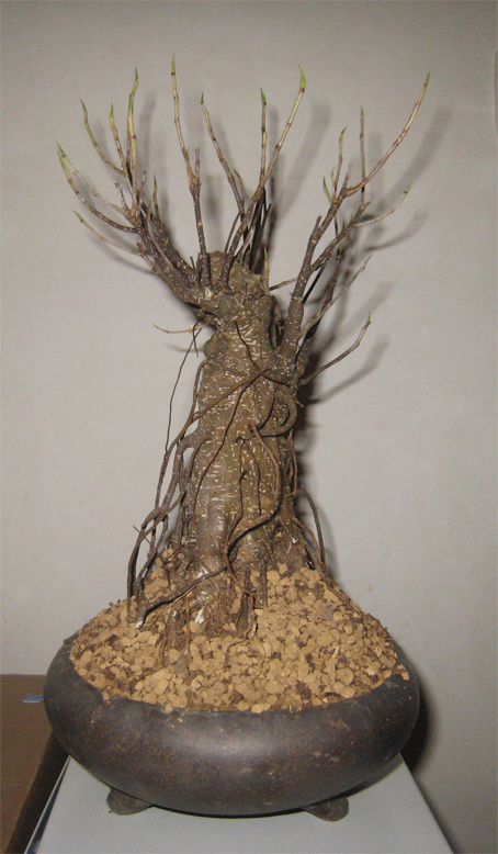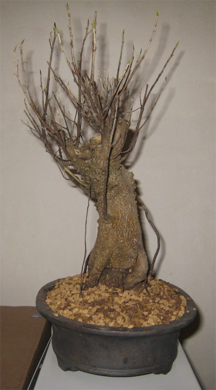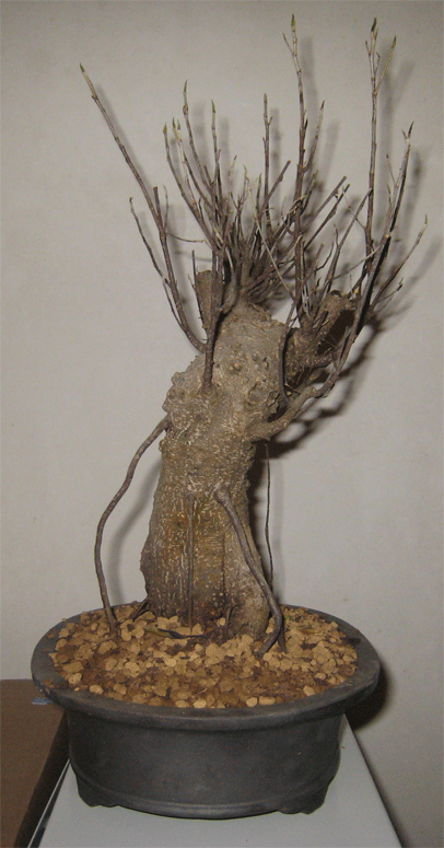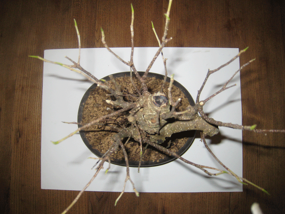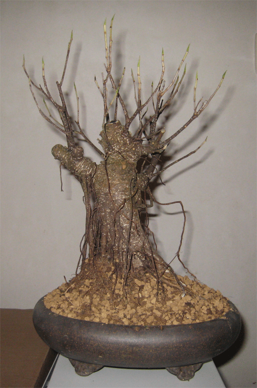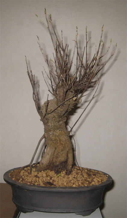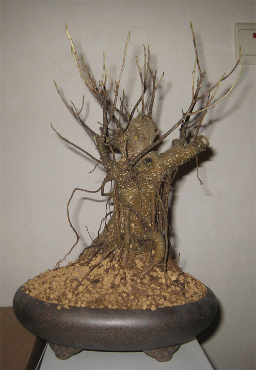 Ces arbres ont été quelque peu ‹ laissés à l’abandon ›, la première chose que j’ai faite a été de les rempoter dans un substrat correct (60% Akadama / 40% tourbe avec un lit d’Akadam pur dans le fond des poteries) et les mettre dans des poteries plus sympa. Comme j’ai fait ca en hiver, ils ont perdu toutes leurs feuilles … Ce qui m’a permis d’en faire des photos nus …